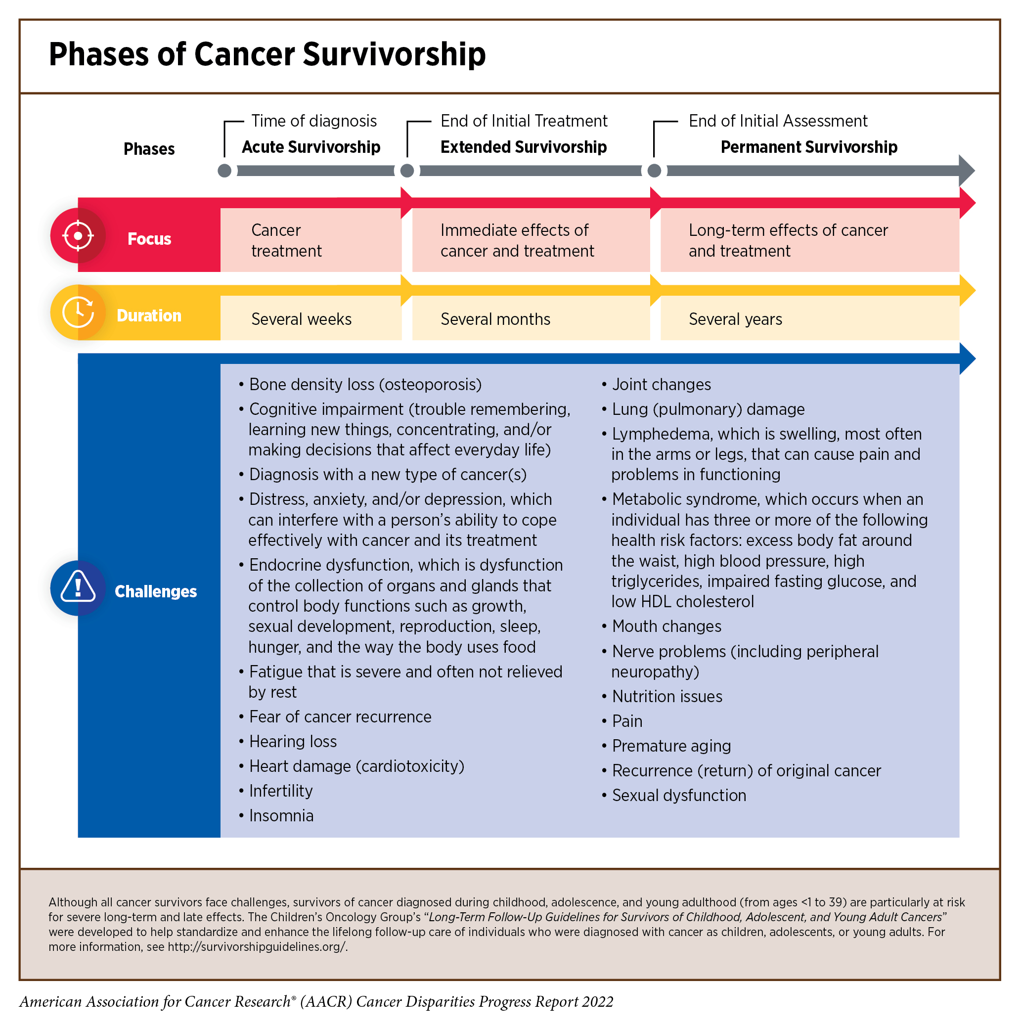 Cancer treatments can impact a patient’s physical and mental health. When a cancer survivor experiences adverse side effects that begin during treatment and continue afterward, these are called long-term side effects; nearly one-third of cancer survivors experience long-term side effects (647)Wu H-S, Harden JK. Symptom Burden and Quality of Life in Survivorship: A Review of the Literature. Cancer Nursing 2015;38(1):E29-54. [LINK NOT AVAILABLE]. Late-term side effects happen after the conclusion of treatment and can occur for the lifetime of the survivor. Side effects are unique to each individual and are dependent on multiple factors such as cancer type, treatment, physical health, and mental well-being. Recent studies are highlighting the disparities in both long- and late-term effects of cancer treatments in medically underserved populations. As evident from such studies, these groups experience lower rates of fertility preservation (648)Meernik C, Engel SM, Wardell A, Baggett CD, Gupta P, Rodriguez-Ormaza N, et al. Disparities in Fertility Preservation Use among Adolescent and Young Adult Women with Cancer. J Cancer Surviv 2022. [LINK NOT AVAILABLE], neurological challenges such as anxiety and post-traumatic stress disorder (PTSD) (433)Mazor M, Wisnivesky JP, Goel M, Harris YT, Lin JJ. Racial and Ethnic Disparities in Post-Traumatic Stress and Illness Coherence in Breast Cancer Survivors with Comorbid Diabetes. Psycho-Oncology 2021;30:1789-98. [LINK NOT AVAILABLE](469)White PM, Itzkowitz SH. Barriers Driving Racial Disparities in Colorectal Cancer Screening in African Americans. Curr Gastroenterol Rep 2020;22:41. [LINK NOT AVAILABLE], lymphedema (650)Chang DW, Suami H, Skoracki R. A Prospective Analysis of 100 Consecutive Lymphovenous Bypass Cases for Treatment of Extremity Lymphedema. Plastic and Reconstructive Surgery 2013;133(6):887e-888e. [LINK NOT AVAILABLE], metabolic disorders (651)Yoshida Y, Schmaltz CL, Jackson-Thompson J, Simoes EJ. The Effect of Metabolic Risk Factors on Cancer Mortality among Blacks and Whites. Translational Cancer Research 2019:S389-S96. [LINK NOT AVAILABLE], diabetes (652)Yao Yuan MT, and Avonne E. Connor. The Effects of Social and Behavioral Determinants of Health on the Relationship between Race and Health Status in U.S. Breast Cancer Survivors. Journal of Women’s Health 2019;28:1632-9. [LINK NOT AVAILABLE], heart failure (653)Noyd DH, Yasui Y, Li N, Chow EJ, Bhatia S, Landstrom A, et al. Disparities in Cardiovascular Risk Factors by Race/Ethnicity among Adult Survivors of Childhood Cancer: A Report from the Childhood Cancer Survivorship Study (CCSS). J Clin Oncol 2021;39:10017. [LINK NOT AVAILABLE], cardiac dysfunction (654)Yuan Y, Taneja M, Connor AE. The Effects of Social and Behavioral Determinants of Health on the Relationship between Race and Health Status in U.S. Breast Cancer Survivors. Journal of Women’s Health 2018;28:1632-9. [LINK NOT AVAILABLE](655)Williams MS, Beech BM, Griffith DM, Jr. Thorpe RJ. The Association between Hypertension and Race/Ethnicity among Breast Cancer Survivors. Journal of Racial and Ethnic Health Disparities 2020;7:1172-7. [LINK NOT AVAILABLE], recurrence of cancer (656)Manz CR, Schrag D. Racial Disparities in Colorectal Cancer Recurrence and Mortality: Equitable Care, Inequitable Outcomes? JNCI: Journal of the National Cancer Institute 2021;113:656-7. [LINK NOT AVAILABLE](657)Kabat GC, Ginsberg M, Sparano JA, Rohan TE. Risk of Recurrence and Mortality in a Multi-Ethnic Breast Cancer Population. Journal of Racial and Ethnic Health Disparities 2017;4:1181-8. [LINK NOT AVAILABLE], and development of new, secondary cancers (659)Lindström L. Racial and Ethnic Disparities in Rates of Invasive Secondary Breast Cancer among Women with Ductal Carcinoma in Situ in Hawai‘i. JAMA Netw Open 2021;4:e2130925. [LINK NOT AVAILABLE](660)Scott LC, Yang Q, Dowling NF, Richardson LC. Predicted Heart Age among Cancer Survivors – United States, 2013-2017. MMWR Morb Mortal Wkly Rep 2021;70:1-6. [LINK NOT AVAILABLE] (see sidebar on Phases of Cancer Survivorship).