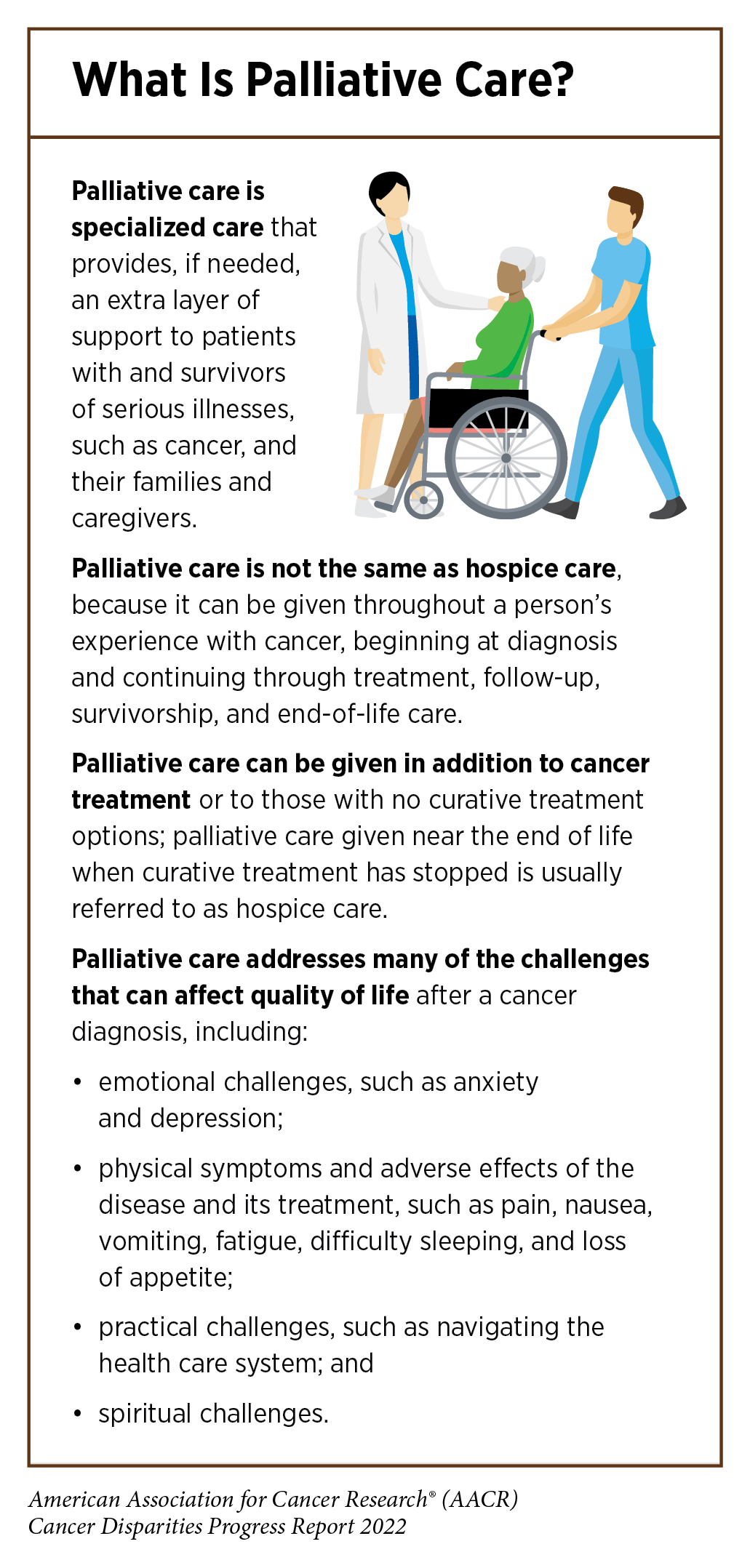 Palliative care is an approach to prevent or treat the symptoms and side effects of any disease, including cancer, by addressing the physical, psychological, financial, social, and spiritual needs that arise from the disease and associated treatments (see sidebar on What Is Palliative Care?). Palliative care is facilitated by a multidisciplinary team of doctors, nurses, dieticians, pharmacists, therapists, spiritual leaders, and social workers and has been shown to improve quality of life for patients, families, and caregivers (715)Radbruch L, De Lima L, Knaul F, Wenk R, Ali Z, Bhatnaghar S, et al. Redefining Palliative Care—a New Consensus-Based Definition. Journal of Pain and Symptom Management 2020;60:754-64. [LINK NOT AVAILABLE]. Despite the advantages of palliative care, there are disparities (716)Elk R, Felder TM, Cayir E, Samuel CA. Social Inequalities in Palliative Care for Cancer Patients in the United States: A Structured Review. Seminars in Oncology Nursing 2018;34:303-15. [LINK NOT AVAILABLE] in utilization by racial and ethnic minorities, SGM populations (717)Haviland K, Burrows Walters C, Newman S. Barriers to Palliative Care in Sexual and Gender Minority Patients with Cancer: A Scoping Review of the Literature. Health & Social Care in the Community 2021;29:305-18. [LINK NOT AVAILABLE], and those living in geographically remote areas (718)Bakitas MA, Elk R, Astin M, Ceronsky L, Clifford KN, Dionne-Odom JN, et al. Systematic Review of Palliative Care in the Rural Setting. Cancer Control 2015;22:450-64. [LINK NOT AVAILABLE](719)Cancer Network. Challenges of Rural Cancer Care in the United States. [updated September 15, 2015, cited 2022 April 22].. Unfortunately, most studies examining palliative care in medically underserved populations focus on the end-of-life care and not care during cancer treatment or survivorship. Additional focus needs to be given to identifying the unique needs of cancer patients from medically underserved groups, developing innovative methods to overcome barriers, and implementing policies that provide equitable care (720)Polite BN, Adams-Campbell LL, Brawley OW, Bickell N, Carethers JM, Flowers CR, et al. Charting the Future of Cancer Health Disparities Research: A Position Statement from the American Association for Cancer Research, the American Cancer Society, the American Society of Clinical Oncology, and the National Cancer Institute. CA: A Cancer Journal for Clinicians 2017;67:353-61. [LINK NOT AVAILABLE] during the chronic phase of cancer survivorship (see sidebar on Phases of Cancer Survivorship).