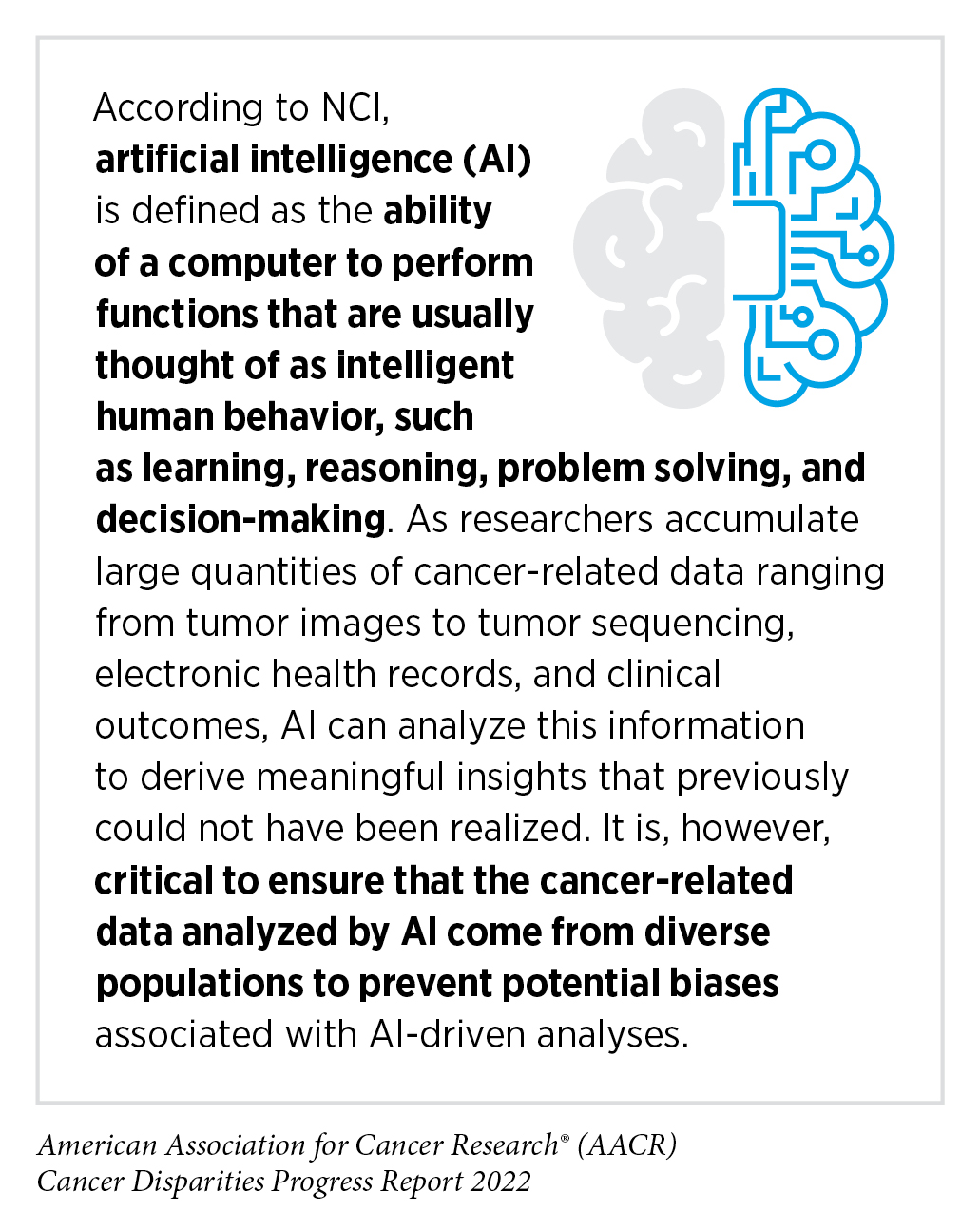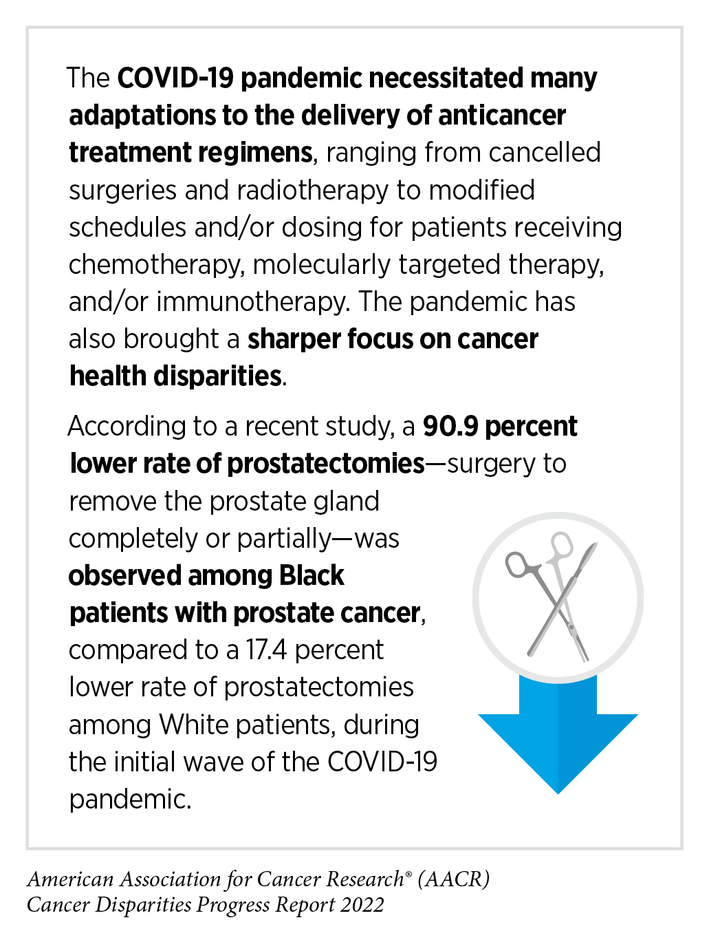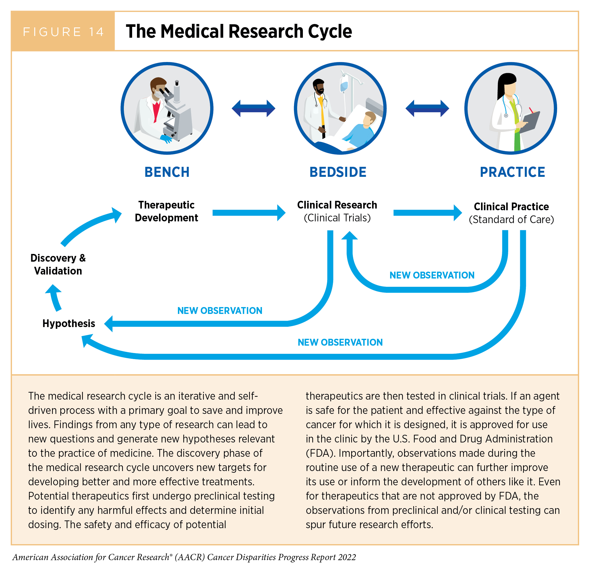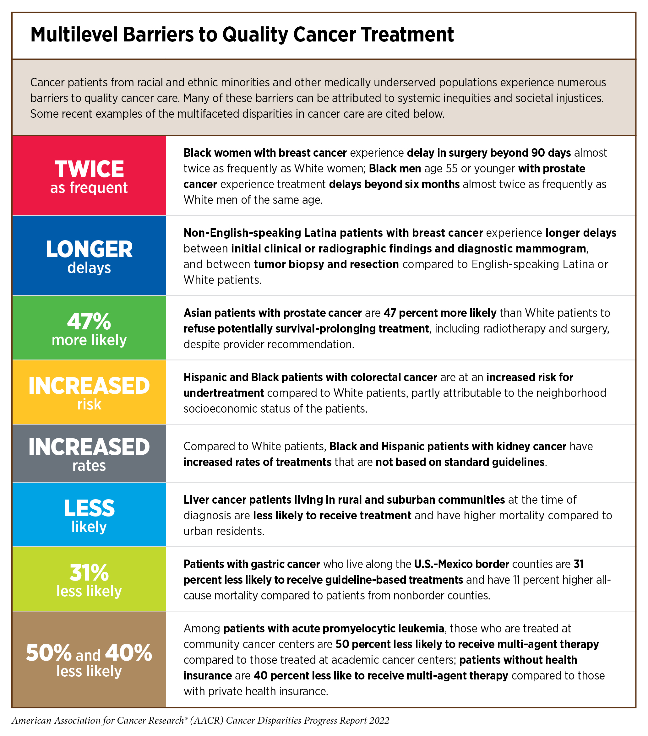 The dedicated efforts of individuals working throughout the medical research cycle are constantly powering the translation of new research discoveries into advances in cancer treatment that are improving survival and quality of life for patients in the United States like Faye Belvin and Ray Spells and around the world. Much of the most recent progress was highlighted in the AACR Cancer Progress Report 2021, which documented many new cancer treatments approved by FDA in the 12 months covered in this eleventh edition of the annual report (2)American Association for Cancer Research. Aacr Cancer Progress Report. [updated October 13, 2021, cited 2022 April 22].. Despite these advances, racial and ethnic minorities and other medically underserved populations continue to experience more frequent and higher severity of multilevel barriers to quality cancer treatment including treatment delays, lack of access to guideline-concordant treatment, and higher rates of treatment-related financial toxicities. The same population groups may also experience overt discrimination and/or implicit bias during the delivery of care (536)Torres TK, Chase DM, Salani R, Hamann HA, Stone J. Implicit Biases in Healthcare: Implications and Future Directions for Gynecologic Oncology. American Journal of Obstetrics and Gynecology 2022; S0002-9378(22)00005-9. [LINK NOT AVAILABLE](537)Berrahou IK, Snow A, Swanson M, Obedin-Maliver J. Representation of Sexual and Gender Minority People in Patient Nondiscrimination Policies of Cancer Centers in the United States. Journal of the National Comprehensive Cancer Network 2022;20:253-9. [LINK NOT AVAILABLE].