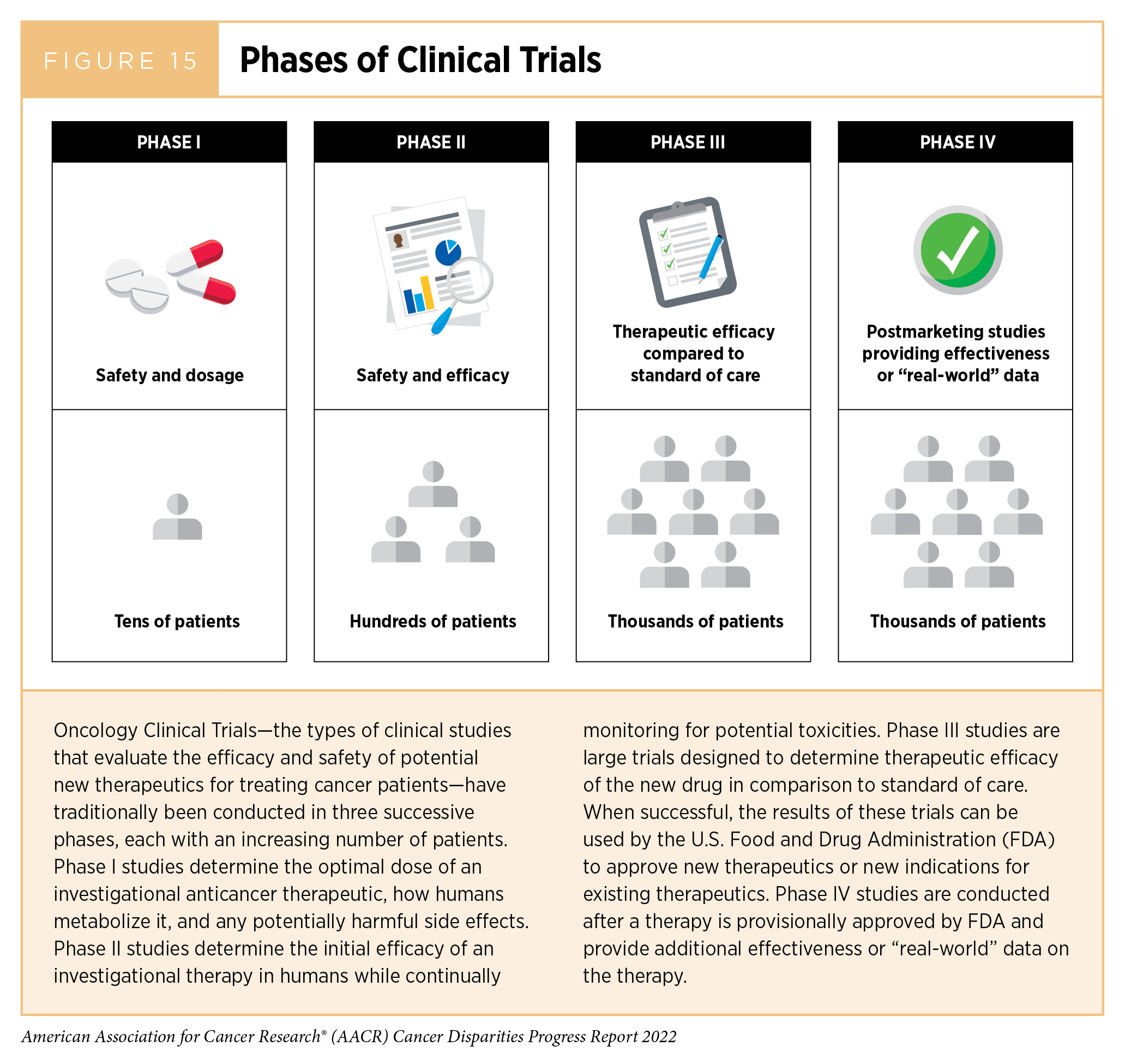 Once a potential therapeutic target is identified, it takes many more years of preclinical research before a candidate therapeutic is developed and ready for testing in clinical trials. During this time, several drug candidates are rigorously tested to identify any potential toxicity and to determine the appropriate doses and dosing schedules for testing in the first clinical trial. There are many types of clinical trials, each designed to answer different research questions (see sidebar on Types of Clinical Studies). All clinical trials are reviewed and approved by institutional review boards before they can begin and are monitored throughout their duration. Clinical trials testing the safety and efficacy of candidate anticancer therapeutics have traditionally been done in three successive phases (Figure 15).