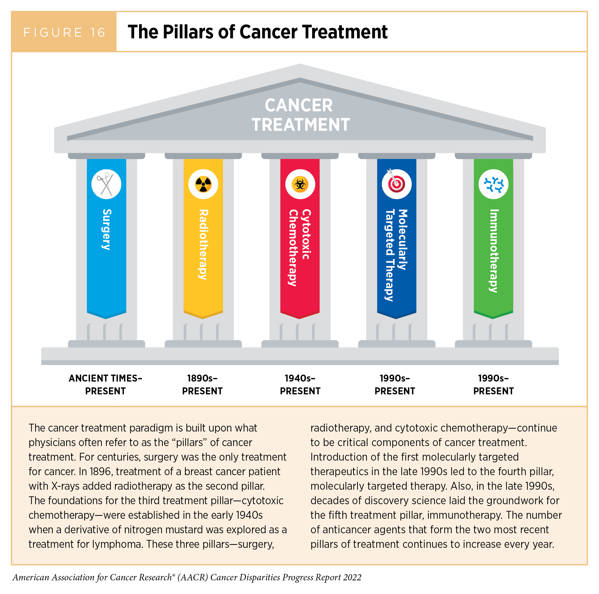 In the following sections, we discuss major disparities among racial and ethnic minorities and other medically underserved populations in the use of the main pillars of cancer treatment (Figure 16) and highlight areas where advances have been made in achieving equity in cancer treatment. Importantly, several recent studies have pointed out that disparities in the receipt of care as well as outcomes for many cancers can be eliminated if every patient has equivalent access to quality health care services (553)Riviere P, Luterstein E, Kumar A, Vitzthum LK, Deka R, Sarkar RR, et al. Survival of African American and Non-Hispanic White Men with Prostate Cancer in an Equal-Access Health Care System. Cancer 2020;126:1683-90. [LINK NOT AVAILABLE](554)Fillmore NR, Yellapragada SV, Ifeorah C, Mehta A, Cirstea D, White PS, et al. With Equal Access, African American Patients Have Superior Survival Compared to White Patients with Multiple Myeloma: A Va Study. Blood 2019;133:2615-8. [LINK NOT AVAILABLE](555)Cykert S, Eng E, Walker P, Manning MA, Robertson LB, Arya R, et al. A System-Based Intervention to Reduce Black-White Disparities in the Treatment of Early Stage Lung Cancer: A Pragmatic Trial at Five Cancer Centers. Cancer Medicine 2019;8:1095-102. [LINK NOT AVAILABLE](556)Chu QD, Hsieh MC, Gibbs JF, Wu XC. Treatment at a High-Volume Academic Research Program Mitigates Racial Disparities in Pancreatic Adenocarcinoma. J Gastrointest Oncol 2021;12:2579-90. [LINK NOT AVAILABLE](557)Kotha NV, Kumar A, Qiao EM, Qian AS, Voora RS, Nalawade V, et al. Association of Health-Care System and Survival in African American and Non-Hispanic White Patients with Bladder Cancer. JNCI: Journal of the National Cancer Institute 2022;114(4):600-608. [LINK NOT AVAILABLE].