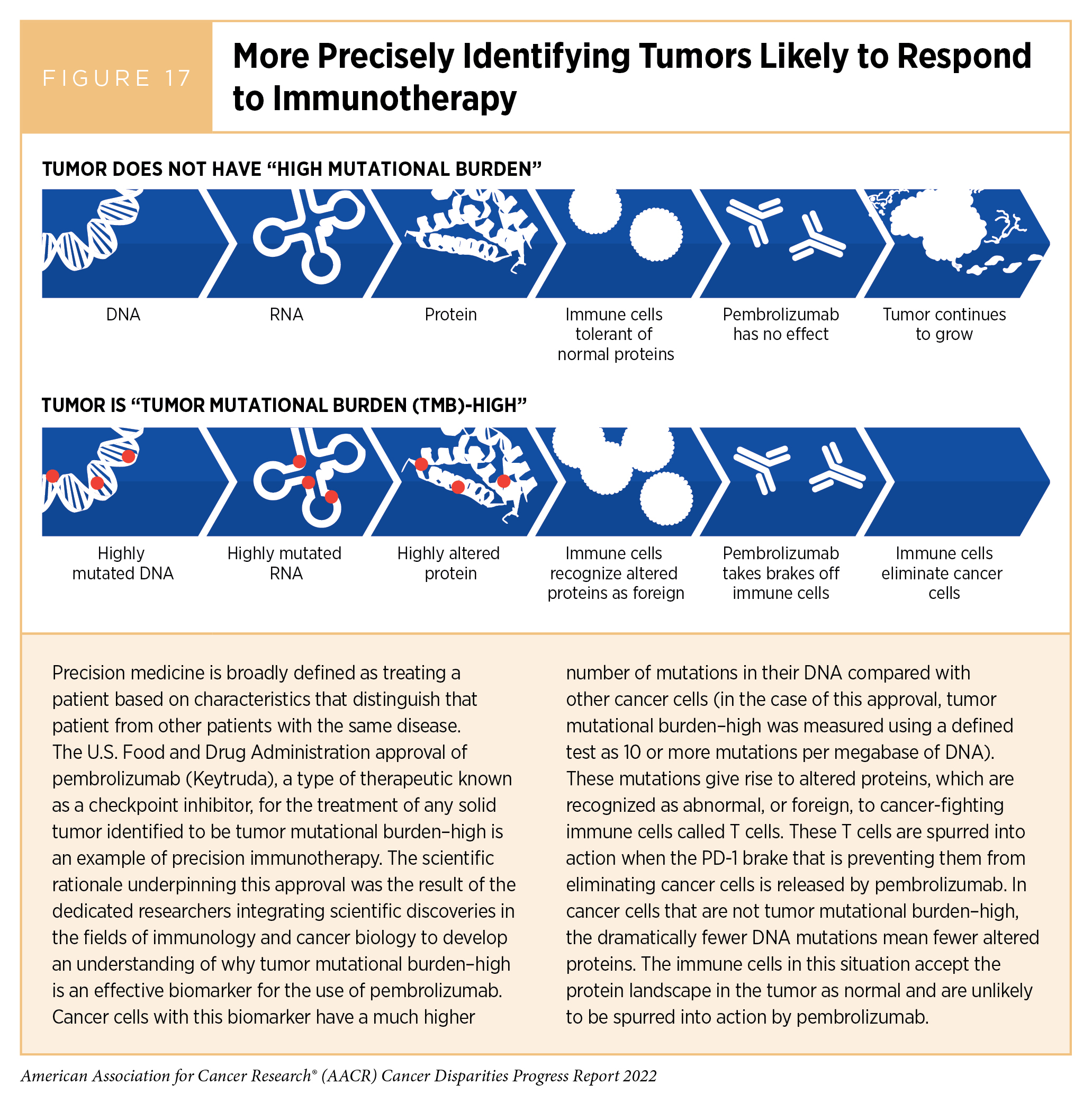 In addition, there is a critical need for additional basic and translational research into the ancestry-related differences in the immune system and tumor immune microenvironment, which are key contributing factors in determining efficacy of cancer immunotherapies. A recent analysis that evaluated the presence of a specific molecular characteristic or biomarker, called tumor mutational burden (TMB), in the tumors of patients with advanced NSCLC found that the levels of TMB varied significantly across ancestry groups (621)Brawley OW, Luhn P, Reese-White D, Ogbu UC, Madhavan S, Wilson G, et al. Disparities in Tumor Mutational Burden, Immunotherapy Use, and Outcomes Based on Genomic Ancestry in Non-Small-Cell Lung Cancer. JCO Glob Oncol 2021;7:1537-46. [LINK NOT AVAILABLE]. Patients of African ancestry had the highest level of TMB. These data are critical for making treatment decisions since high TMB is associated with greater benefit, including improved overall survival, from certain immunotherapeutics known as checkpoint inhibitors (Figure 17).