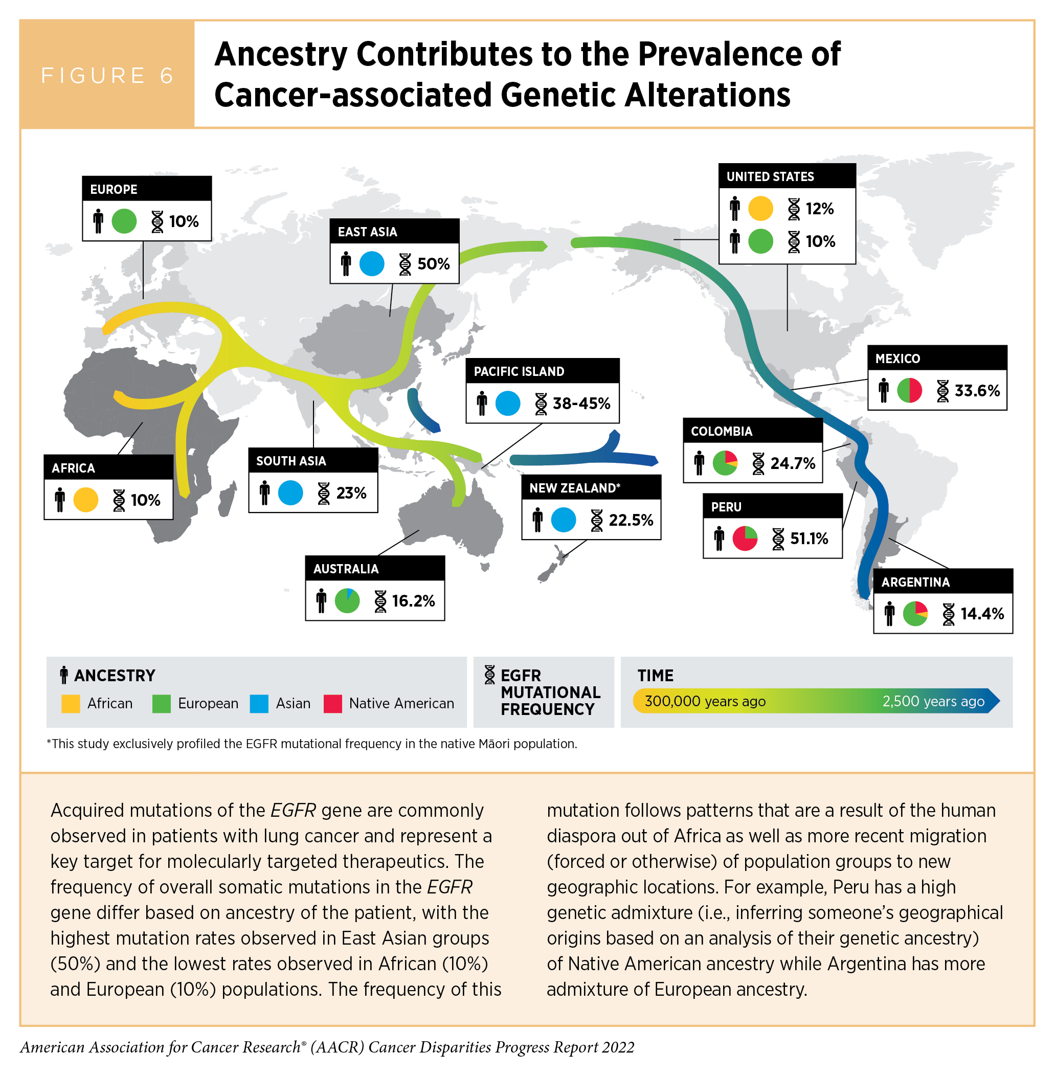 Recent data indicate that there are racial and ethnic differences in the patterns of cancer-associated genetic alterations (see Figure 6). As one example, among patients with colorectal cancer age 50 and younger (often referred to as early-onset colorectal cancer), Black patients have higher rates of mutations in the KRAS gene (612)Hein DM, Deng W, Bleile M, Kazmi SA, Rhead B, De La Vega FM, et al. Racial and Ethnic Differences in Genomic Profiling of Early Onset Colorectal Cancer. JNCI: Journal of the National Cancer Institute 2022;114(5):775-778. [LINK NOT AVAILABLE]. This information can be critical in making treatment decisions, since many KRAS-targeted therapeutics are currently being evaluated in clinical trials and one therapeutic has recently received FDA approval (2)American Association for Cancer Research. Aacr Cancer Progress Report. [updated October 13, 2021, cited 2022 April 22].. Equally important among early-onset colorectal cancer patients is the detection of inherited mutations which may guide their treatment and/or future surveillance options. Unfortunately, a recent analysis of a diverse population of early-onset colorectal cancer patients indicated racial/ethnic differences in referral to and receipt of genetic testing (613)Gamble CR, Huang Y, Wright JD, Hou JY. Precision Medicine Testing in Ovarian Cancer: The Growing Inequity between Patients with Commercial Vs Medicaid Insurance. Gynecol Oncol 2021;162:18-23. [LINK NOT AVAILABLE]. It is also concerning that disparities in genetic testing rates have worsened in recent years, particularly between patients with and without private health insurance (207)Sheinson DM, Wong WB, Meyer CS, Stergiopoulos S, Lofgren KT, Flores C, et al. Trends in Use of Next-Generation Sequencing in Patients with Solid Tumors by Race and Ethnicity after Implementation of the Medicare National Coverage Determination. JAMA Netw Open 2021;4:e2138219. [LINK NOT AVAILABLE](613)Gamble CR, Huang Y, Wright JD, Hou JY. Precision Medicine Testing in Ovarian Cancer: The Growing Inequity between Patients with Commercial Vs Medicaid Insurance. Gynecol Oncol 2021;162:18-23. [LINK NOT AVAILABLE]. Receiving care at equal-access health care systems, for instance the Veterans Health Administration, the U.S. military health care system, has been shown to reduce disparities in genetic testing among underserved populations (614)Vargason AB, Turner CE, Shriver CD, Ellsworth RE. Genetic Testing in Non-Hispanic Black Women with Breast Cancer Treated within an Equal-Access Healthcare System. Genetics in Medicine 2022;24:232-7. [LINK NOT AVAILABLE]. Therefore, future public health policies must aim at equitable access to the benefits of precision medicine including tumor genetic testing and the receipt of molecularly targeted therapeutics for all patients.