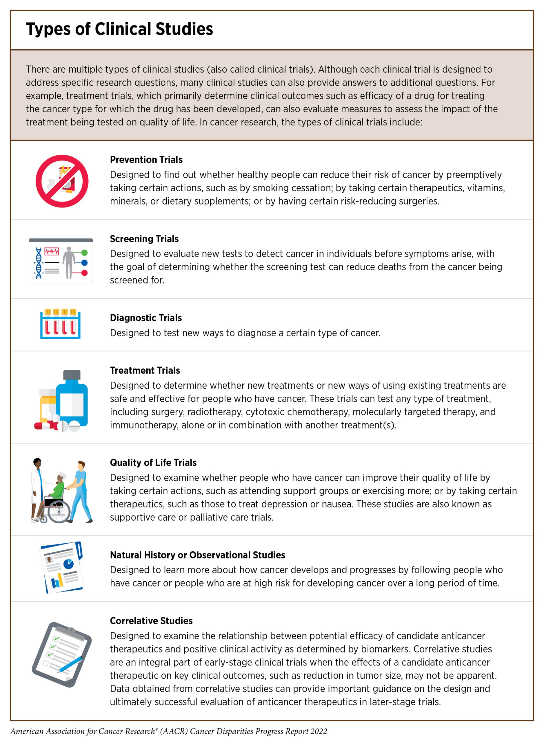 The individual-level barriers for patients include lack of awareness of clinical trials, limited health literacy, and mistrust of the health care system, as well as financial barriers such as costs of cancer treatment and medication, transportation, child care, lost work, and inadequate or complete lack of insurance, among others. A recent study that assessed the clinical and nonclinical barriers to participation of Black patients in cancer clinical trials at a safety-net hospital identified lack of understanding of cancer clinical trials and perceptions and fears of cancer clinical trials as two prominent themes (513)Hernandez ND, Durant R, Lisovicz N, Nweke C, Belizaire C, Cooper D, et al. African American Cancer Survivors’ Perspectives on Cancer Clinical Trial Participation in a Safety-Net Hospital: Considering the Role of the Social Determinants of Health. J Cancer Educ 2021;10.1007/s13187-021-01994-4. [LINK NOT AVAILABLE]. Most participants stated that their health care providers never informed them of clinical trials, and many reported fear and mistrust of the health care system as a barrier to clinical trial participation. It is important to note that safety-net practices provide a disproportionately larger share of care to racial and ethnic minorities, as well as low-income and/or uninsured individuals, among other medically underserved populations. Thus, addressing barriers to clinical trial participation at these facilities is vital if we are to reduce cancer health disparities. Careful consideration must be given to the adverse influences of SDOH, including poverty, food insecurity, housing insecurity, and psychosocial stressors (see Factors That Drive Cancer Health Disparities), while approaching interventions for patients receiving care at safety-net hospitals. In this regard, it should be noted that among cancer patients participating in clinical trials, those living in areas with high socioeconomic deprivation are still at an increased risk of worse outcomes (514)Unger JM, Moseley AB, Cheung CK, Osarogiagbon RU, Symington B, Ramsey SD, et al. Persistent Disparity: Socioeconomic Deprivation and Cancer Outcomes in Patients Treated in Clinical Trials. J Clin Oncol 2021;39:1339-48. [LINK NOT AVAILABLE]. Future research should examine how to eliminate additional sources of disparities that are not mitigated even after equal access to clinical trials.