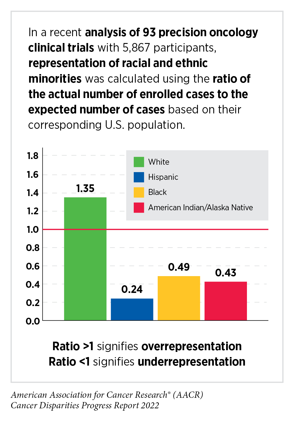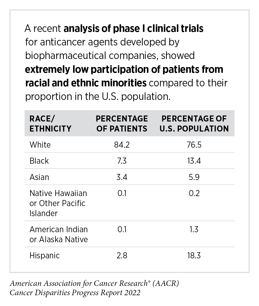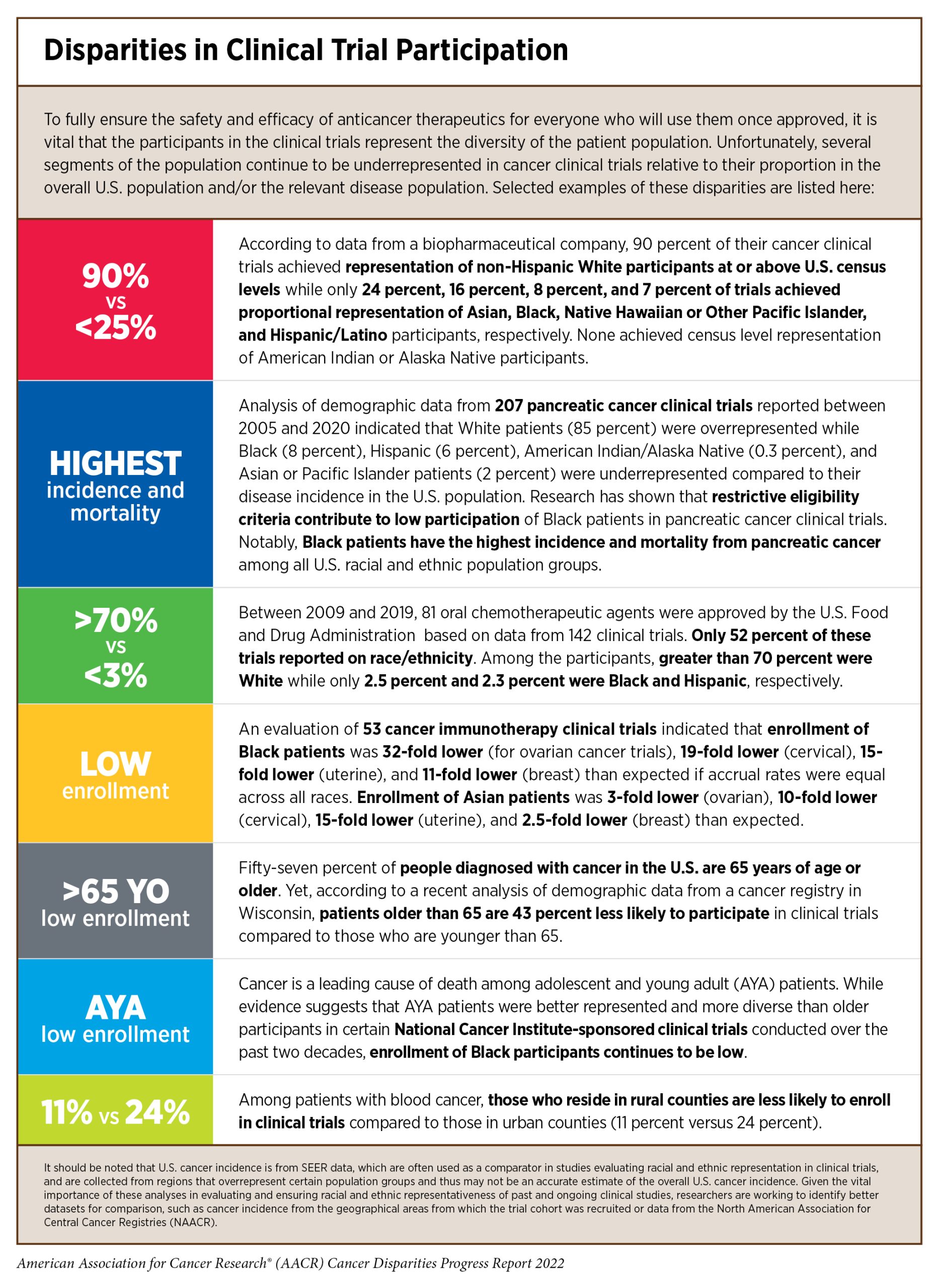 While researchers are continually identifying and implementing new ways of designing, conducting, and reviewing clinical trials that are yielding advances in patient care, there are still numerous opportunities for improvements. The most pressing challenges that need to be urgently addressed are low participation in clinical trials, in particular, among individuals living in rural areas, adolescents and young adults, and the elderly, as well as the lack of representation from racial and ethnic minorities (see sidebar on Disparities in Clinical Trial Participation). Participation of racial and ethnic minorities and other underserved populations in clinical trials is critical to accurately determine the efficacy as well as potential toxicities of new treatments in these populations. Diversity among participants is even more vital during evaluation of cancer types with a disparately higher burden in racial or ethnic minorities, as well as during evaluation of cutting-edge precision medicine, e.g., molecularly targeted therapeutics or immunotherapeutics, because these treatments are closely tied to the unique characteristics of an individual’s cancer, immune system, and lifestyle, among other factors. Enrollment of diverse participants in clinical trials, as well as the race- and ethnicity-specific reporting of the benefits and potential risks, can enable a comprehensive understanding of ancestry-related differences in cancer biology, disease biomarkers, or treatment responses including adverse events and ensure that newly approved anticancer agents can be safely used in the real-world patient population for whom these treatments are ultimately intended.