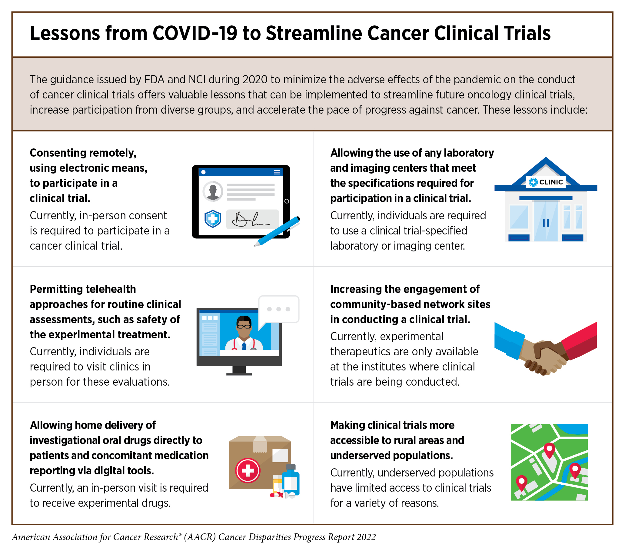 FDA has prioritized improving representation of racial, ethnic, and gender minority populations in oncology clinical trials (see Diversifying Representation in Clinical Trials by Addressing Barriers for Patients). The Center for Drug Evaluation and Research (CDER) and the Center for Biologics Evaluation and Research (CBER) at FDA released a guidance in November 2020 to encourage clinical trial sponsors to implement strategies that would increase representation of racial and ethnic minorities (527)U.S. Food & Drug. Enhancing the Diversity of Clinical Trial Populations—Eligibility Criteria, Enrollment Practices, and Trial Designs Guidance for Industry. [updated November 13, 2020, cited 2022 April 22].. Among the recommendations included in the guidance are broadening eligibility criteria for late-stage efficacy trials when more patients with comorbidities can be safely included; encouraging trials or follow-up studies to include representation of racial and ethnic minorities, when possible, to definitively determine differences in safety and efficacy; conducting trials at decentralized local health facilities while maintaining data integrity and patient safety; and advancing the appropriate use of real-world evidence to fill evidence gaps where randomized clinical trials may not be feasible. It must be noted that the COVID-19 pandemic, despite its adverse effects on nearly all aspects of cancer science and medicine, also offered a blueprint of success to further revise and reform the clinical trial enterprise and the drug approval process (see the sidebar on Lessons from COVID-19 to Streamline Cancer Clinical Trials). Guidance issued by FDA and NCI during 2020 to minimize the adverse effects of the pandemic on the conduct of cancer clinical trials offers valuable lessons that can be implemented to streamline future oncology clinical trials, increase participation from racial and ethnic minorities and other historically underrepresented populations by eliminating system-level and structural barriers, and accelerate the pace of progress against cancer.