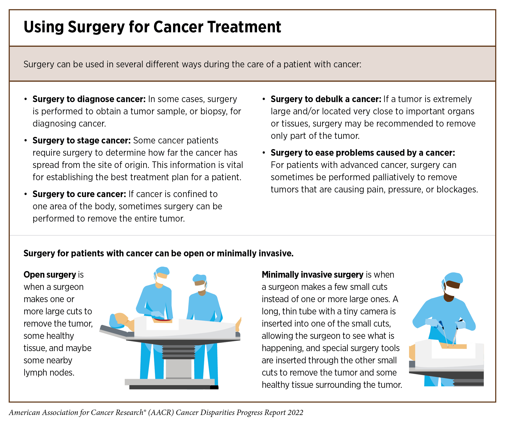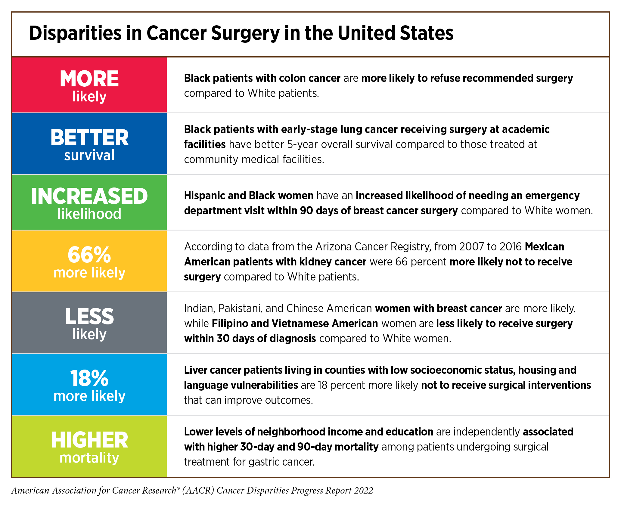 Racial and ethnic minorities and other medically underserved populations often experience disparities in surgical management of cancer including treatment delays or refusals and lack of guideline-concordant care (see sidebar on Disparities in Cancer Surgery in the United States). These disparities are seen across many cancer types including the most diagnosed cancers in the U.S. and may contribute to worse outcomes (559)Namburi N, Timsina L, Ninad N, Ceppa D, Birdas T. The Impact of Social Determinants of Health on Management of Stage I Non-Small Cell Lung Cancer. Am J Surg 2021;S0002-9610(21)00614-0. [LINK NOT AVAILABLE](560)Obeng-Gyasi S, Asad S, Fisher JL, Rahurkar S, Stover DG. Socioeconomic and Surgical Disparities Are Associated with Rapid Relapse in Patients with Triple-Negative Breast Cancer. Ann Surg Oncol 2021;28:6500-9. [LINK NOT AVAILABLE](561)Cho B, Han Y, Lian M, Colditz GA, Weber JD, Ma C, et al. Evaluation of Racial/Ethnic Differences in Treatment and Mortality among Women with Triple-Negative Breast Cancer. JAMA Oncol 2021;7:1016-23. [LINK NOT AVAILABLE]. As one example, Black women with nonmetastatic TNBC have a 28 percent higher risk of breast cancer mortality compared to White women, partly attributable to their disparities in the receipt of surgery and chemotherapy (561)Cho B, Han Y, Lian M, Colditz GA, Weber JD, Ma C, et al. Evaluation of Racial/Ethnic Differences in Treatment and Mortality among Women with Triple-Negative Breast Cancer. JAMA Oncol 2021;7:1016-23. [LINK NOT AVAILABLE].