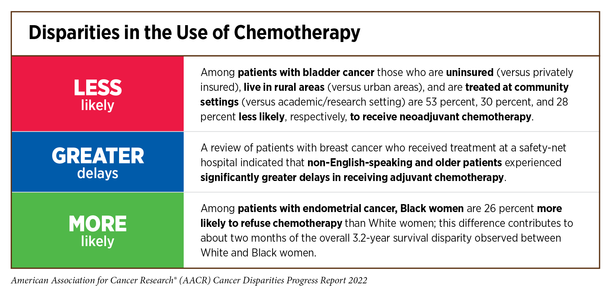 Unfortunately, many reports have documented that patients with cancer from racial and ethnic minorities and other medically underserved populations are less likely to receive recommended chemotherapy (see sidebar on the Disparities in the Use of Chemotherapy). These disparities arise due to a range of issues from socioeconomic disadvantages including poverty, lack of health insurance, being treated at community hospital setting, and language barriers to clinical factors such as advanced age. Results from recent studies suggest that even among those with private health insurance, Black and Hispanic patients are still less likely to receive chemotherapy, highlighting the need for additional research to identify factors beyond health insurance that are preventing underserved patients from receiving the standard of care for their cancers (594)Mitsakos AT, Irish W, Parikh AA, Snyder RA. The Association of Health Insurance and Race with Treatment and Survival in Patients with Metastatic Colorectal Cancer. PLoS One 2022;17:e0263818. [LINK NOT AVAILABLE]. There is also evidence suggesting clinical differences in the response to chemotherapy for patients from different racial and ethnic backgrounds, with minority patients benefiting less from the chemotherapy exposure (595)Hoeh B, Würnschimmel C, Flammia RS, Horlemann B, Sorce G, Chierigo F, et al. Effect of Chemotherapy in Metastatic Prostate Cancer According to Race/Ethnicity Groups. Prostate 2022;82:676-86. [LINK NOT AVAILABLE]. These data underscore the importance of diversifying accrual in cancer clinical trials to ensure the safety and efficacy of therapeutics for patients from all sociodemographic backgrounds.