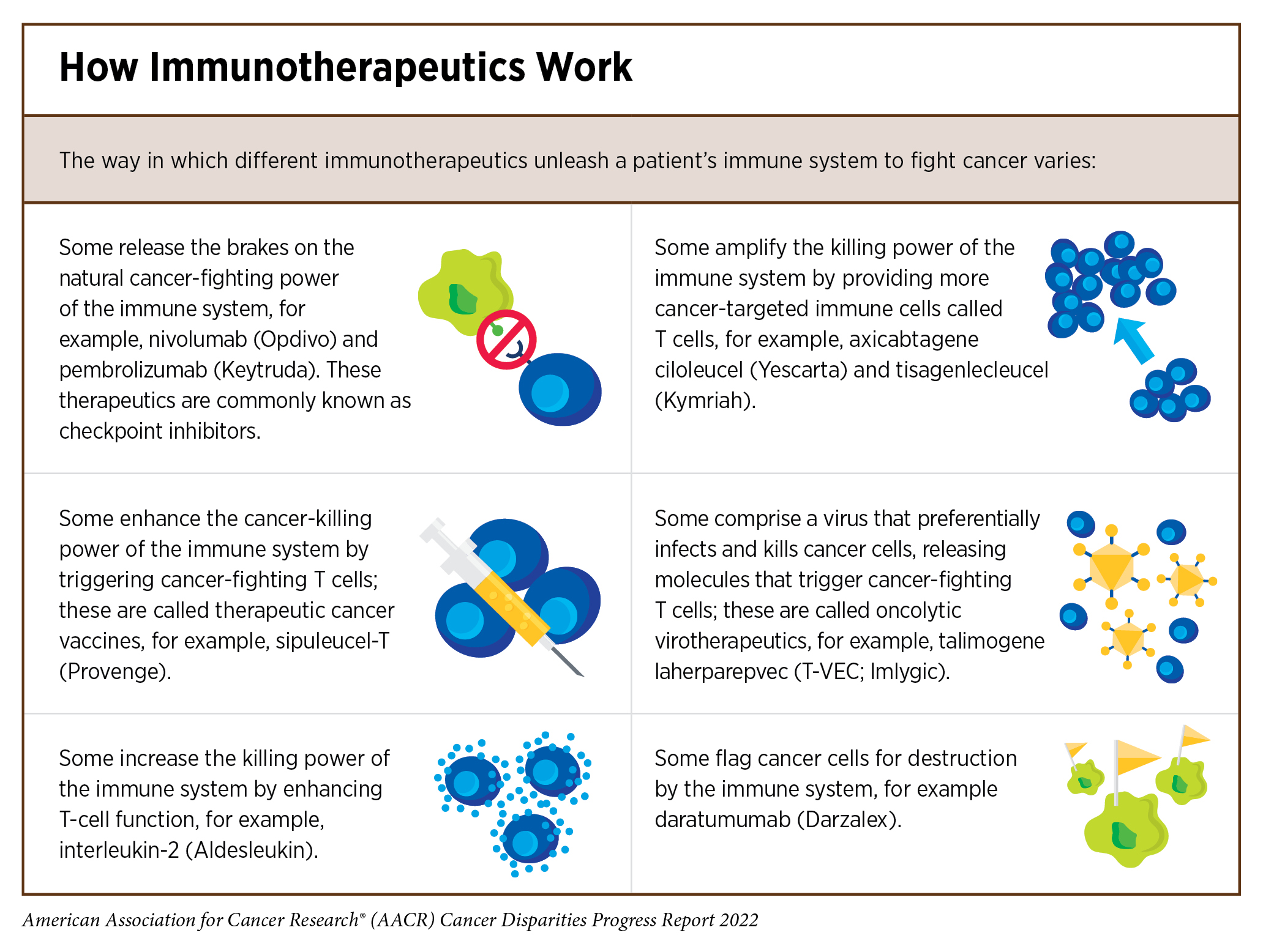 Cancer immunotherapeutics work by unleashing the power of a patient’s immune system to fight cancer the way it fights pathogens like the virus that causes flu and the bacterium that causes strep throat. There are many ways by which immunotherapeutics can eliminate cancer (see sidebar on How Immunotherapeutics Work). Immunotherapy has emerged as the fifth pillar of cancer care and as one the most exciting new approaches to cancer treatment. This is, in part, because many patients with metastatic cancer who have been treated with these revolutionary treatments have had remarkable and durable responses. In fact, the rapid advances in the field of immunotherapeutics have transformed the treatment landscape for patients with formerly intractable cancers such as NSCLC or metastatic melanoma, the deadliest form of skin cancer. As reported in AACR Cancer Progress Report 2021, dramatic reductions in lung cancer and melanoma death rates in recent years, due in part to molecularly targeted therapeutics and immunotherapeutics, are largely responsible for the steady decline in overall age-adjusted U.S. cancer death rates (2)American Association for Cancer Research. Aacr Cancer Progress Report. [updated October 13, 2021, cited 2022 April 22]..