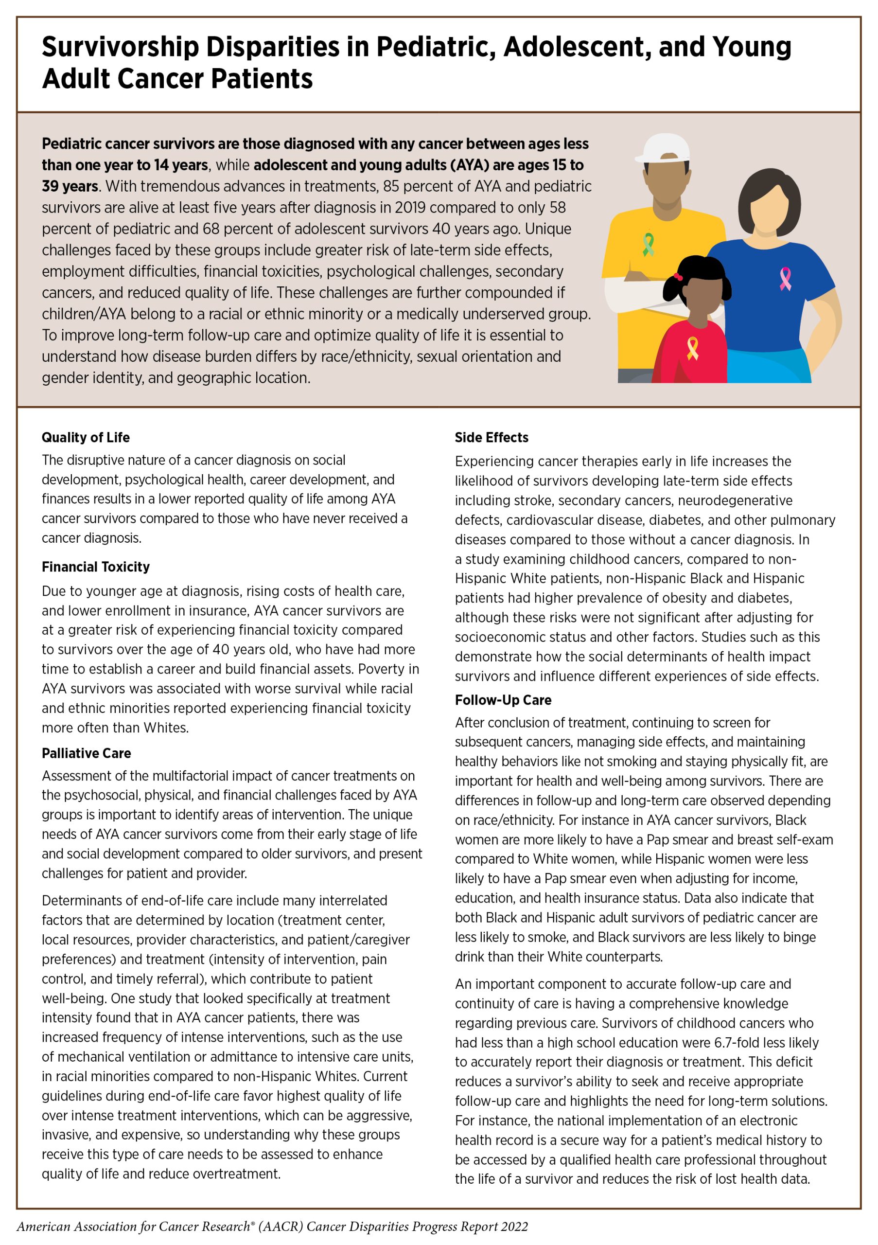 Many barriers exist at the provider level including lack of knowledge of clinical trials; implicit biases among health care providers; lack of dedicated staff to serve minority populations; and lack of cultural competence and appropriate communication skills, among other factors. Patients ages 15 to 39, who are collectively referred to as adolescents and young adults (AYA), are an underserved population who often experience unfavorable cancer outcomes. Cancer is a leading cause of death in this population and AYA patients remain especially vulnerable, given their predisposition to certain cancer types, distinct cancer biology, and unique physical and mental health needs during survivorship (see Survivorship Disparities in Pediatric, Adolescent, and Young Adult Cancer Patients). Recent studies that evaluated the barriers to enrollment of AYA patients identified limited research staff and resources, lack of awareness of available trials among health care staff, and lack of communication between pediatric and medical oncologists as frequent reasons for not enrolling in cancer clinical trials (520)Nupur Mittal A-ML, Wade Kyono, David S. Dickens, Allison Grimes, John M. Salsman, Brad H. Pollock, and Michael Roth. Barriers to Pediatric Oncologist Enrollment of Adolescents and Young Adults on a Cross-Network National Clinical Trials Network Supportive Care Cancer Clinical Trial. Journal of Adolescent and Young Adult Oncology 2022;11:117-21. [LINK NOT AVAILABLE](521)Mittal N, Saha A, Avutu V, Monga V, Freyer DR, Roth M. Shared Barriers and Facilitators to Enrollment of Adolescents and Young Adults on Cancer Clinical Trials. Scientific reports 2022;12:3875. [LINK NOT AVAILABLE]. Implicit biases among heath care staff who are responsible for recruiting patients on clinical trials can contribute to exclusion of minority groups. In a recent study, researchers interviewed 91 individuals (from research staff to cancer center leaders) across five major U.S. cancer centers (522)Niranjan SJ, Martin MY, Fouad MN, Vickers SM, Wenzel JA, Cook ED, et al. Bias and Stereotyping among Research and Clinical Professionals: Perspectives on Minority Recruitment for Oncology Clinical Trials. Cancer 2020;126:1958-68. [LINK NOT AVAILABLE]. Prominent themes from these interviews included perceptions that minority participants are less knowledgeable about clinical trials and therefore more difficult to communicate with; that minorities wouldn’t follow trial protocols; and that race should not be a consideration when recruiting for trials. A framework for addressing such biases is urgently needed, including diversification of the cancer research and care workforce.