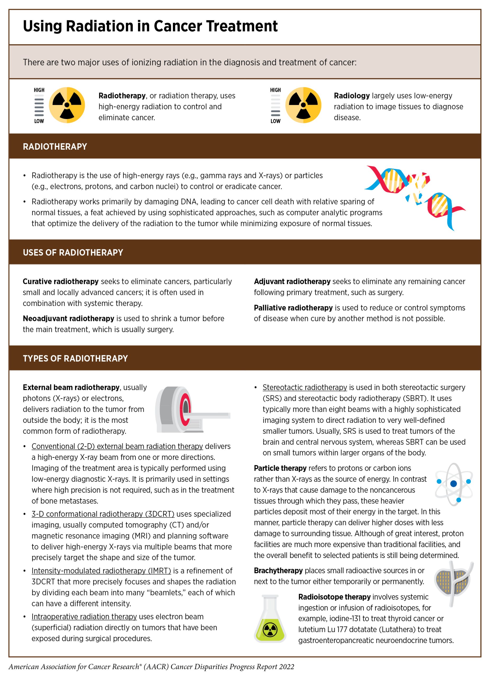 Disparities in the utilization of radiation therapy are evident across cancer types. Lack or underutilization of the treatment among the disadvantaged population groups is also evident for state-of-the-art treatment regimens such as stereotactic body radiotherapy, hypofractionated radiotherapy, and intensity-modulated radiotherapy, all of which have been shown to improve outcomes for patients while reducing the adverse side effects of radiation (574)Tang C, Lei X, Smith GL, Pan HY, Hoffman KE, Kumar R, et al. Influence of Geography on Prostate Cancer Treatment. Int J Radiat Oncol Biol Phys 2021;109:1286-95. [LINK NOT AVAILABLE](584)Woodward SG, Varshney K, Anne PR, George BJ, Willis AI. Trends in Use of Hypofractionated Whole Breast Radiation in Breast Cancer: An Analysis of the National Cancer Database. Int J Radiat Oncol Biol Phys 2021;109:449-57. [LINK NOT AVAILABLE](585)Laucis AM, Jagsi R, Griffith KA, Dominello MM, Walker EM, Abu-Isa EI, et al. The Role of Facility Variation on Racial Disparities in Use of Hypofractionated Whole Breast Radiation Therapy. Int J Radiat Oncol Biol Phys 2020;107:949-58. [LINK NOT AVAILABLE]. As one example, a recent advance is the emergence of hypofractionated radiotherapy, whereby patients receive fewer but higher doses of radiotherapy compared with the traditional course and complete treatment over a shorter period. In 2018, new guidelines were introduced which recommended expanding the use of hypofractionated radiotherapy for treating breast cancer (586)Smith BD, Bellon JR, Blitzblau R, Freedman G, Haffty B, Hahn C, et al. Radiation Therapy for the Whole Breast: Executive Summary of an American Society for Radiation Oncology (Astro) Evidence-Based Guideline. Pract Radiat Oncol 2018;8:145-52. [LINK NOT AVAILABLE]. This change was spurred by research showing that hypofractionated radiotherapy is as effective as the traditional course of radiotherapy and has fewer adverse effects (587)Haviland JS, Owen JR, Dewar JA, Agrawal RK, Barrett J, Barrett-Lee PJ, et al. The Uk Standardisation of Breast Radiotherapy (Start) Trials of Radiotherapy Hypofractionation for Treatment of Early Breast Cancer: 10-Year Follow-up Results of Two Randomised Controlled Trials. Lancet Oncol 2013;14:1086-94. [LINK NOT AVAILABLE](588)Shaitelman SF, Schlembach PJ, Arzu I, Ballo M, Bloom ES, Buchholz D, et al. Acute and Short-Term Toxic Effects of Conventionally Fractionated Vs Hypofractionated Whole-Breast Irradiation: A Randomized Clinical Trial. JAMA Oncol 2015;1:931-41. [LINK NOT AVAILABLE]. While use of hypofractionated radiotherapy has increased in recent years, the likelihood of receiving treatment is greater among patients with higher median income, those with private insurance, and those being treated at an academic center (584)Woodward SG, Varshney K, Anne PR, George BJ, Willis AI. Trends in Use of Hypofractionated Whole Breast Radiation in Breast Cancer: An Analysis of the National Cancer Database. Int J Radiat Oncol Biol Phys 2021;109:449-57. [LINK NOT AVAILABLE]. Additionally, a recent analysis indicated that after undergoing breast-conserving surgery, Black and Asian patients receive hypofractionated radiation therapy less often than White patients, and these disparities are driven by variations in treatment facility-specific hypofractionation use (585)Laucis AM, Jagsi R, Griffith KA, Dominello MM, Walker EM, Abu-Isa EI, et al. The Role of Facility Variation on Racial Disparities in Use of Hypofractionated Whole Breast Radiation Therapy. Int J Radiat Oncol Biol Phys 2020;107:949-58. [LINK NOT AVAILABLE].
