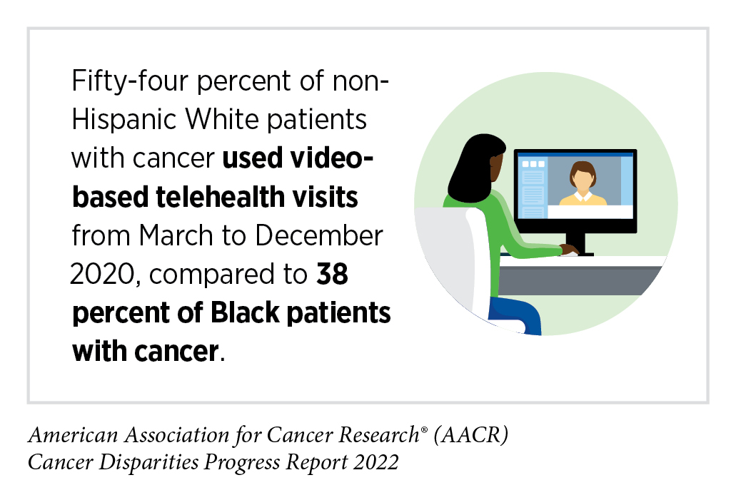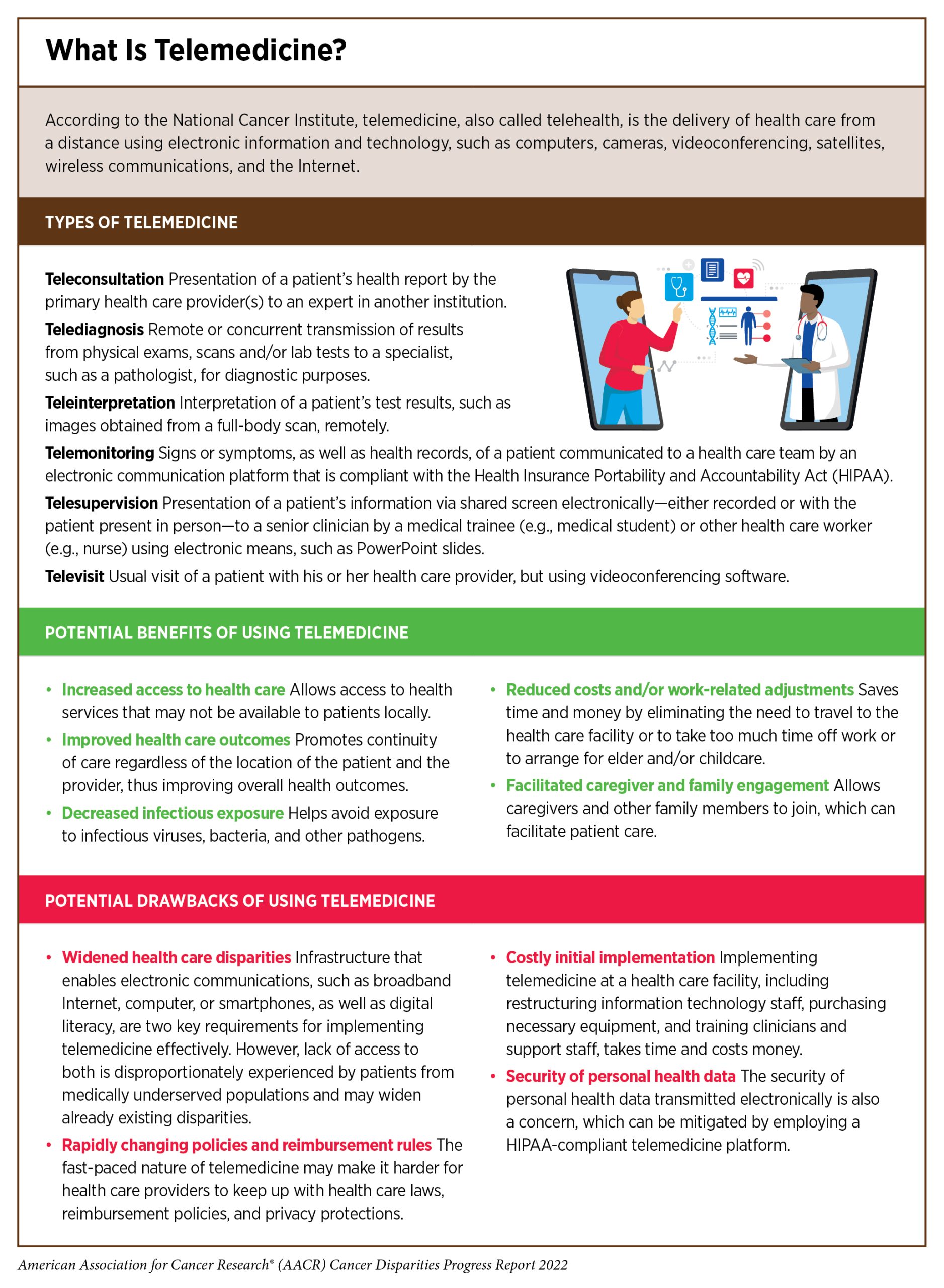 Whether multifaceted interventions like ACCURE could be widely implemented across health care systems in the U.S. and utilized for different cancer types, and whether they can be effective in achieving health equity for all underserved populations, needs to be evaluated. However, the findings from ACCURE and other similar studies strongly support the importance of conducting innovative translational and clinical cancer research to determine how to eliminate disparities in cancer treatment and improve outcomes for all patients. Moving forward, all sectors must work together to ensure that everyone and not just a handful of patients benefits from the scientific and technological breakthroughs against cancer. COVID-19 has led to a significant increase in the uptake of telehealth or telemedicine across health care including in cancer care (see sidebar on What Is Telemedicine?) (7)American Association for Cancer Research. Aacr Report on the Impact of COVID-19 on Cancer Research and Patient Care. [updated February 10, 2022, cited 2022 April 22].. The use of telemedicine by the elderly and patients with cancer has already had a widespread positive effect on the delivery of oncology services during the pandemic and has allowed patients to continue receiving cancer care, even when they are unable to visit a health care facility in person. However, studies have highlighted disparities in telehealth use for cancer care, indicating lower uptake or user satisfaction among those who are older, have low income, lack private insurance, or belong to racial or ethnic minorities (639)De B, Fu S, Chen YS, Das P, Ku K, Maroongroge S, et al. Patient, Physician, and Policy Factors Underlying Variation in Use of Telemedicine for Radiation Oncology Cancer Care. Cancer Med 2022;(10):2096-2105. [LINK NOT AVAILABLE](640)Tam S, Wu VF, Williams AM, Girgis M, Sheqwara JZ, Siddiqui F, et al. Disparities in the Uptake of Telemedicine During the COVID-19 Surge in a Multidisciplinary Head and Neck Cancer Population by Patient Demographic Characteristics and Socioeconomic Status. JAMA Otolaryngology–Head & Neck Surgery 2021;147:209-11. [LINK NOT AVAILABLE]. It is imperative that all stakeholders work together to ensure equitable access and uptake of telemedicine for all populations.