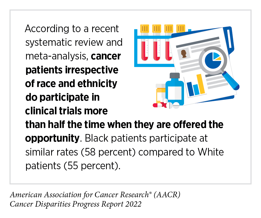 The vital role of community engagement and patient navigation was highlighted in a recent study that evaluated the impact of a multifaceted intervention on enrollment of Black patients in clinical trials (532)Guerra CE, Sallee V, Hwang W-T, Bryant B, Washington AL, Takvorian SU, et al. Accrual of Black Participants to Cancer Clinical Trials Following a Five-Year Prospective Initiative of Community Outreach and Engagement. J Clin Oncol 2021;39:100. [LINK NOT AVAILABLE]. The intervention included culturally tailored marketing, partnerships with faith-based organizations serving Black communities to conduct educational events, collaboration with Lyft and Ride Health to address transportation barriers, and patient education by nurse navigators regarding cancer clinical trials (532)Guerra CE, Sallee V, Hwang W-T, Bryant B, Washington AL, Takvorian SU, et al. Accrual of Black Participants to Cancer Clinical Trials Following a Five-Year Prospective Initiative of Community Outreach and Engagement. J Clin Oncol 2021;39:100. [LINK NOT AVAILABLE]. While Black residents comprise 19 percent of the population and 17 percent of cancer cases in the study’s catchment area, only 11 percent of patients were Black prior to the intervention. Furthermore, only 12 percent and eight percent of Black participants accrued onto treatment and nontherapeutic interventional clinical trials, respectively. After implementation of the community outreach and engagement intervention these numbers increased to 24 percent and 33 percent respectively. The initiative utilized community venues including churches, neighborhoods, parks, and health centers with formats ranging from educational forums to wellness fairs and reached over 10,000 individuals.