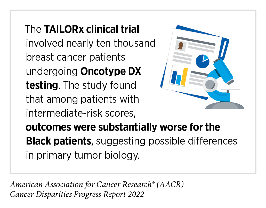 While there are some variations in the published data, some recent studies have indicated that the Oncotype DX test may be less accurate at predicting the risk of breast cancer death for Black women compared to White women (603)Hoskins KF, Danciu OC, Ko NY, Calip GS. Association of Race/Ethnicity and the 21-Gene Recurrence Score with Breast Cancer– Specific Mortality among US Women. JAMA Oncol 2021;7:370-8. [LINK NOT AVAILABLE](604)Collin LJ, Yan M, Jiang R, Ward KC, Crawford B, Torres MA, et al. Oncotype Dx Recurrence Score Implications for Disparities in Chemotherapy and Breast Cancer Mortality in Georgia. NPJ Breast Cancer 2019;5:32. [LINK NOT AVAILABLE]. Specifically, the researchers found that overall, Black women had higher Oncotype DX scores than White women and even among women with similar scores, Black patients were more likely to die of breast cancer compared to White women. These data highlight the importance of additional research into the cellular and molecular characteristics within tumors and/or other treatment-related factors that are not captured by Oncotype DX tests and may be driving racial disparities in breast cancer. Furthermore, these results reinforce the need for greater racial diversity in clinical trial populations as researchers develop new tests such as the Oncotype DX, because there can be ancestry-related biological differences among patients from different population groups that influence the performance of these tests.