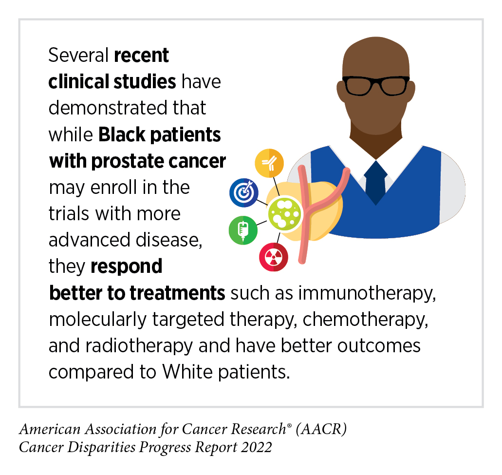 There is increasing evidence that disparities in cancer outcomes could be reduced or even eliminated when every patient has equitable access to quality cancer treatments. As one example, Black patients with colorectal cancer are known to have worse outcomes compared to White patients (10)National Cancer Institute. Surveillance, Epidemiology, and End Results Program. [updated January 8, 2022, cited 2022 April 22].. However, a recent clinical trial which evaluated certain molecularly targeted therapeutics (alone or in combination) in patients with advanced colorectal cancer found no difference in treatment responses or overall survival between Black and White patients who received equal treatments (622)Snyder RA, He J, Le-Rademacher J, Ou FS, Dodge AB, Zemla TJ, et al. Racial Differences in Survival and Response to Therapy in Patients with Metastatic Colorectal Cancer: A Secondary Analysis of CALGB/SWOG 80405 (Alliance A151931). Cancer 2021;127:3801-8. [LINK NOT AVAILABLE]. Researchers have also shown that for many cancers, racial and ethnic minorities may respond better to treatments and have better outcomes compared to White patients when offered similar access to guideline-concordant quality care. A recent meta-analysis of data from seven prostate cancer clinical trials evaluating radiation therapy along with other types of treatments indicated that even though Black men enrolled in these trials with more aggressive disease, they experienced better outcomes compared to White men (623)Ma TM, Romero T, Nickols NG, Rettig MB, Garraway IP, Roach M, 3rd, et al. Comparison of Response to Definitive Radiotherapy for Localized Prostate Cancer in Black and White Men: A Meta-Analysis. JAMA Netw Open 2021;4:e2139769. [LINK NOT AVAILABLE]. Similar observations have been made by other researchers who evaluated the outcomes of Black versus White patient with prostate cancer treated with a hormone-targeted therapy (624)George DJ, Halabi S, Heath EI, Sartor AO, Sonpavde GP, Das D, et al. A Prospective Trial of Abiraterone Acetate Plus Prednisone in Black and White Men with Metastatic Castrate-Resistant Prostate Cancer. Cancer 2021;127:2954-65. [LINK NOT AVAILABLE]. Yet another analysis showed that among advanced NSCLC patients who received immunotherapy, Black patients experienced higher survival compared to White patients (625)Gupta A, Zhang D, Braithwaite D, Karanth SD, Tailor TD, Clarke JM, et al. Racial Differences in Survival among Advanced-Stage Non-Small-Cell Lung Cancer Patients Who Received Immunotherapy: An Analysis of the US National Cancer Database (Ncdb). J Immunother 2022;45:132-7. [LINK NOT AVAILABLE]. These exciting new data suggest that implementation of policies and interventions that ensure equitable access to cancer treatment may be able to address racial or ethnic differences in cancer outcomes. In this regard, Medicaid expansion through the Affordable Care Act (ACA) has been shown to increase insured status, early diagnosis, and timely cancer treatment, and to improve outcomes and reduce cancer disparities (626)Mobley EM, Tfirn I, Guerrier C, Gutter MS, Vigal K, Pather K, et al. Impact of Medicaid Expansion on Pancreatic Cancer: An Examination of Sociodemographic Disparity in 1-Year Survival. J Am Coll Surg 2022;234:75-84. [LINK NOT AVAILABLE](627)Lin M, O’Guinn M, Zipprer E, Hsieh JC, Dardon AT, Raman S, et al. Impact of Medicaid Expansion on the Diagnosis, Treatment, and Outcomes of Stage II and III Rectal Cancer Patients. J Am Coll Surg 2022;234:54-63. [LINK NOT AVAILABLE](628)Michel KF, Spaulding A, Jemal A, Yabroff KR, Lee DJ, Han X. Associations of Medicaid Expansion with Insurance Coverage, Stage at Diagnosis, and Treatment among Patients with Genitourinary Malignant Neoplasms. JAMA Netw Open 2021;4:e217051. [LINK NOT AVAILABLE](629)Adamson BJS, Cohen AB, Gross CP, Estévez M, Magee K, Williams E, et al. Aca Medicaid Expansion Association with Racial Disparity Reductions in Timely Cancer Treatment. Am J Manag Care 2021;27:274-81. [LINK NOT AVAILABLE] (see Improving Access to High Quality Clinical Care).