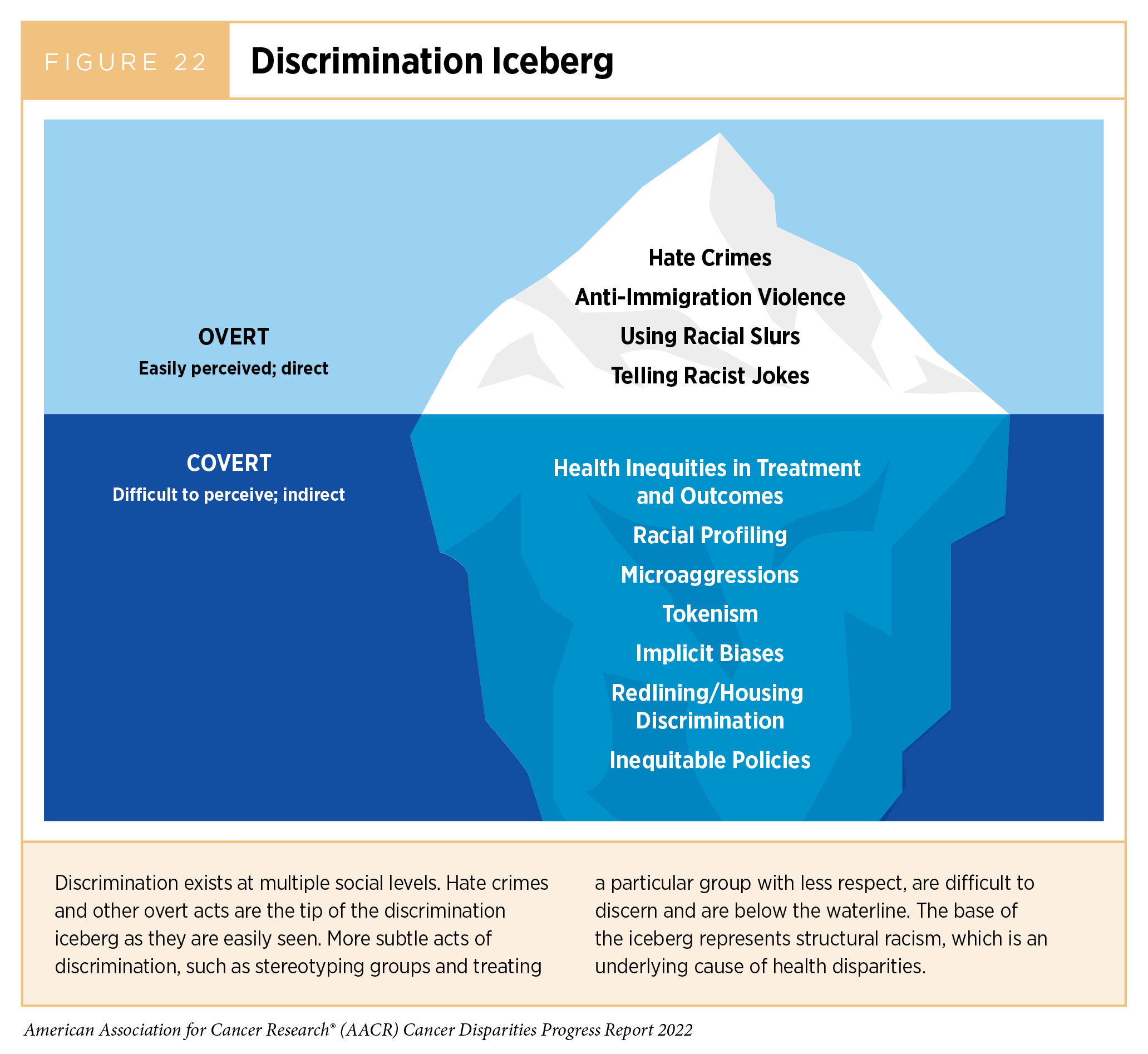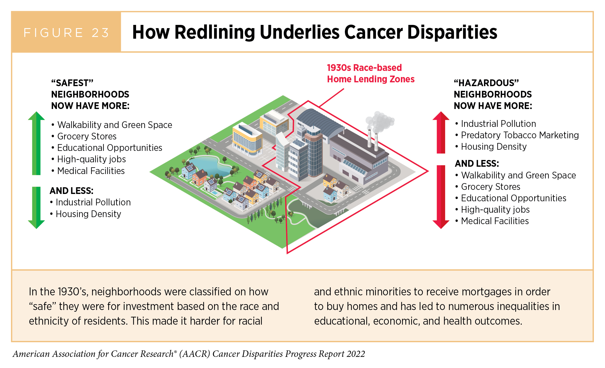 Structural racism is a form of racism that is pervasive throughout systems, laws, practices, and beliefs that reinforce and maintain racial group inequities (861)Paula A. Braveman EA, Dwayne Proctor, Tina Kauh, and Nicole Holm. Systemic and Structural Racism: Definitions, Examples, Health Damages, and Approaches to Dismantling. Health Affairs 2022;41:171-8. [LINK NOT AVAILABLE]. Structural racism has been described as the hidden base of the “discrimination iceberg” as it supports underlying stereotypical beliefs, overt racism, and discrimination (Figure 22) (862)Wiley. Asian American Communities and Health: Context, Research, Policy, and Action. [updated April 2009, cited 2022 April 22].. For example, redlining is a discriminatory practice in which financial and other services are withheld from potential customers who reside in neighborhoods classified as “hazardous” for investment based on race/ethnicity. A growing body of evidence shows that community disinvestment and residing in historically redlined neighborhoods negatively impact physical and mental health (Figure 23) (863)Huang SJ, Sehgal NJ. Association of Historic Redlining and Present-Day Health in Baltimore. PLOS ONE 2022;17:e0261028. [LINK NOT AVAILABLE](864)O’Campo P, Xue X, Wang MC, Caughy M. Neighborhood Risk Factors for Low Birthweight in Baltimore: A Multilevel Analysis. American Journal of Public Health 1997;87:1113-8. [LINK NOT AVAILABLE](865)Krieger N, Wye GV, Huynh M, Waterman PD, Maduro G, Li W, et al. Structural Racism, Historical Redlining, and Risk of Preterm Birth in New York City, 2013–2017. American Journal of Public Health 2020;110:1046-53. [LINK NOT AVAILABLE](866)Lynch EE, Malcoe LH, Laurent SE, Richardson J, Mitchell BC, Meier HCS. The Legacy of Structural Racism: Associations between Historic Redlining, Current Mortgage Lending, and Health. SSM – Population Health 2021;14:100793. [LINK NOT AVAILABLE]. Alarmingly, residing in historically redlined neighborhoods is also associated with late-stage breast cancer diagnosis and increased rates of mortality in Black women (867)Aghdam N, Carrasquilla M, Wang E, Pepin AN, Danner M, Ayoob M, et al. Ten-Year Single Institutional Analysis of Geographic and Demographic Characteristics of Patients Treated with Stereotactic Body Radiation Therapy for Localized Prostate Cancer. Front Oncol 2020;10:616286. [LINK NOT AVAILABLE](see Social and Built Environments). The complex interplay between social and environmental factors presents several opportunities for government agencies, private funders, and the research community to prioritize cancer equity research.