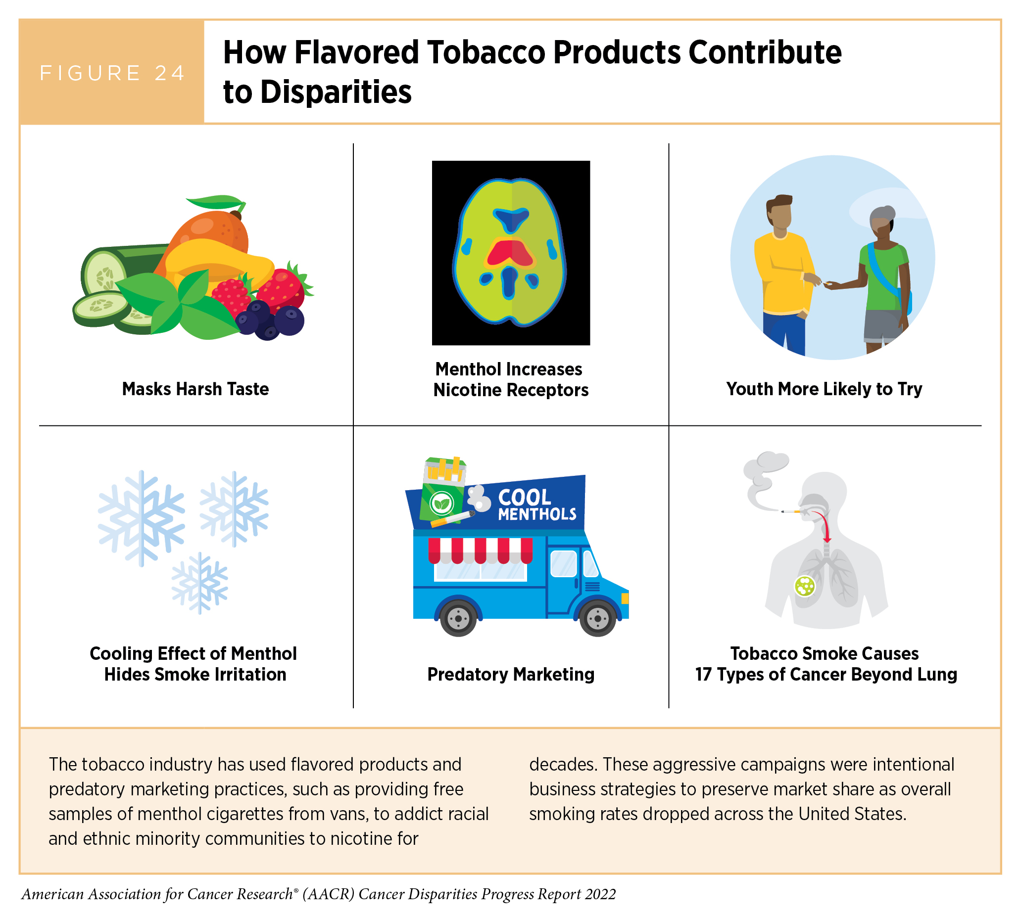 The tobacco industry has used menthol-flavored cigarettes to aggressively target minority communities (Figure 24). Overall, 38.8 percent of Americans who smoke use menthol cigarettes, and largely due to predatory marketing practices, 85 percent of African Americans who smoke use menthol cigarettes (878)Villanti AC, Mowery PD, Delnevo CD, Niaura RS, Abrams DB, Giovino GA. Changes in the Prevalence and Correlates of Menthol Cigarette Use in the USA, 2004-2014. Tob Control 2016;25:ii14-ii20. [LINK NOT AVAILABLE]. Extensive evidence indicates that menthol cigarettes increase smoking initiation, progression to frequent smoking, and exposure to nicotine, and reduce smoking cessation success (230)Villanti AC, Collins LK, Niaura RS, Gagosian SY, Abrams DB. Menthol Cigarettes and the Public Health Standard: A Systematic Review. BMC Public Health 2017;17:983. [LINK NOT AVAILABLE](879)Ross KC, Dempsey DA, St. Helen G, Delucchi K, Benowitz NL. The Influence of Puff Characteristics, Nicotine Dependence, and Rate of Nicotine Metabolism on Daily Nicotine Exposure in African American Smokers. Cancer Epidemiology, Biomarkers & Prevention 2016;25:936-43. [LINK NOT AVAILABLE](880)Okuyemi KS, Faseru B, Sanderson Cox L, Bronars CA, Ahluwalia JS. Relationship between Menthol Cigarettes and Smoking Cessation among African American Light Smokers. Addiction 2007;102:1979-86. [LINK NOT AVAILABLE]. Yet the 2009 Family Smoking Prevention and Tobacco Control Act (TCA) allowed the tobacco industry to continue marketing menthol cigarettes, while asking FDA to determine if this was “appropriate for the protection of public health.”