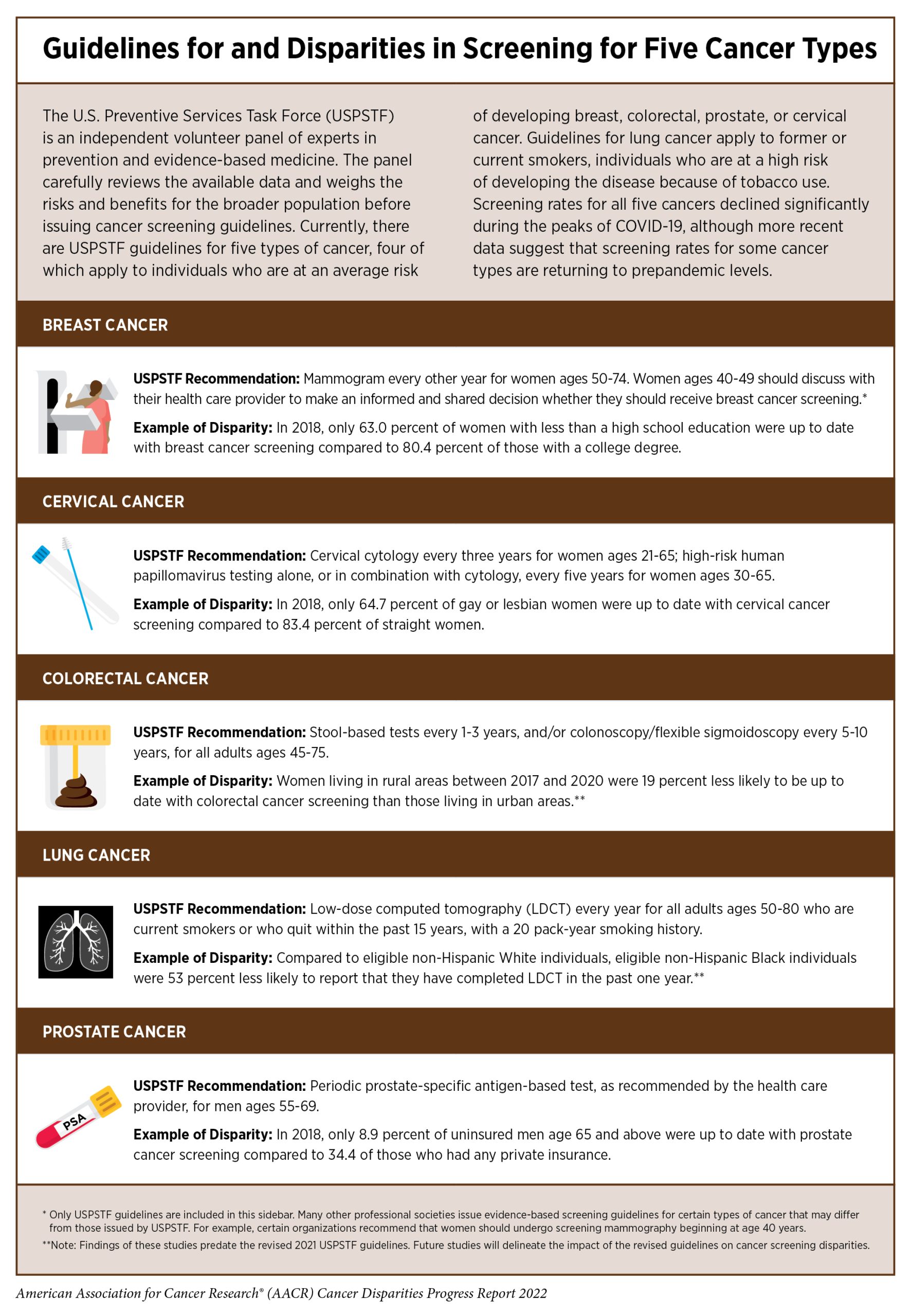 As described in Collaborative Resources to Build Health Equity Partnerships, structural racism is an underlying driver for cancer health disparities (see also Figure 5; and Factors That Drive Cancer Health Disparities). Routine cancer screenings are necessary to detect precancerous lesions as early as possible in cancer development; however, variability along the cancer screening continuum presents challenges to improving equity (see Disparities in Cancer Screening for Early Detection). For example, cancer screenings for cervical (932)Lee D-C, Liang H, Chen N, Shi L, Liu Y. Cancer Screening among Racial/Ethnic Groups in Health Centers. International Journal for Equity in Health 2020;19:43. [LINK NOT AVAILABLE], breast (933)Susan G. Komen. How Do Breast Cancer Screening Rates Compare among Different Groups in the U.S. [updated March 3, 2022, cited 2022 April 22]., colorectal (932)Lee D-C, Liang H, Chen N, Shi L, Liu Y. Cancer Screening among Racial/Ethnic Groups in Health Centers. International Journal for Equity in Health 2020;19:43. [LINK NOT AVAILABLE], and lung (934)Lozier JW, Fedewa SA, Smith RA, Silvestri GA. Lung Cancer Screening Eligibility and Screening Patterns among Black and White Adults in the United States. JAMA Netw Open 2021;4:e2130350. [LINK NOT AVAILABLE] cancer are equally or more likely to occur in minority communities at health centers when compared to NHW populations. Follow-up care, however, is less likely to occur in minority populations for several reasons including being uninsured or underinsured, decreased access to care, healthcare system bias, and miscommunication with health care providers (4)Kaiser Family Foundation. Racial Disparities in Cancer Outcomes, Screening, and Treatment. [updated February 3, 2022, cited 2022 April 22].. For sexual and gender minorities, cancer screening data are limited because national cancer screening programs do not collect sexual orientation or gender identification data (935)Haviland KS, Swette S, Kelechi T, Mueller M. Barriers and Facilitators to Cancer Screening among LGBTQ Individuals with Cancer. Oncol Nurs Forum 2020;47:44-55. [LINK NOT AVAILABLE] (see Cancer Health Disparities Among Other Medically Underserved Populations). Self-reported concerns regarding discrimination are an additional barriers to cancer screenings for sexual and gender minorities (935)Haviland KS, Swette S, Kelechi T, Mueller M. Barriers and Facilitators to Cancer Screening among LGBTQ Individuals with Cancer. Oncol Nurs Forum 2020;47:44-55. [LINK NOT AVAILABLE]. These knowledge gaps, screening eligibility criteria, concerns about discrimination, and variable screening data among racial, ethnic, sexual, and gender minorities present opportunities for policies that increase insurance coverage for low-income individuals. Collecting disaggregated cancer data (see sidebar on Why Is Disaggregated Cancer Data Needed?), providing opportunities to report sexual orientation, and improving cultural competency across the health care system are viable approaches to improving equity.