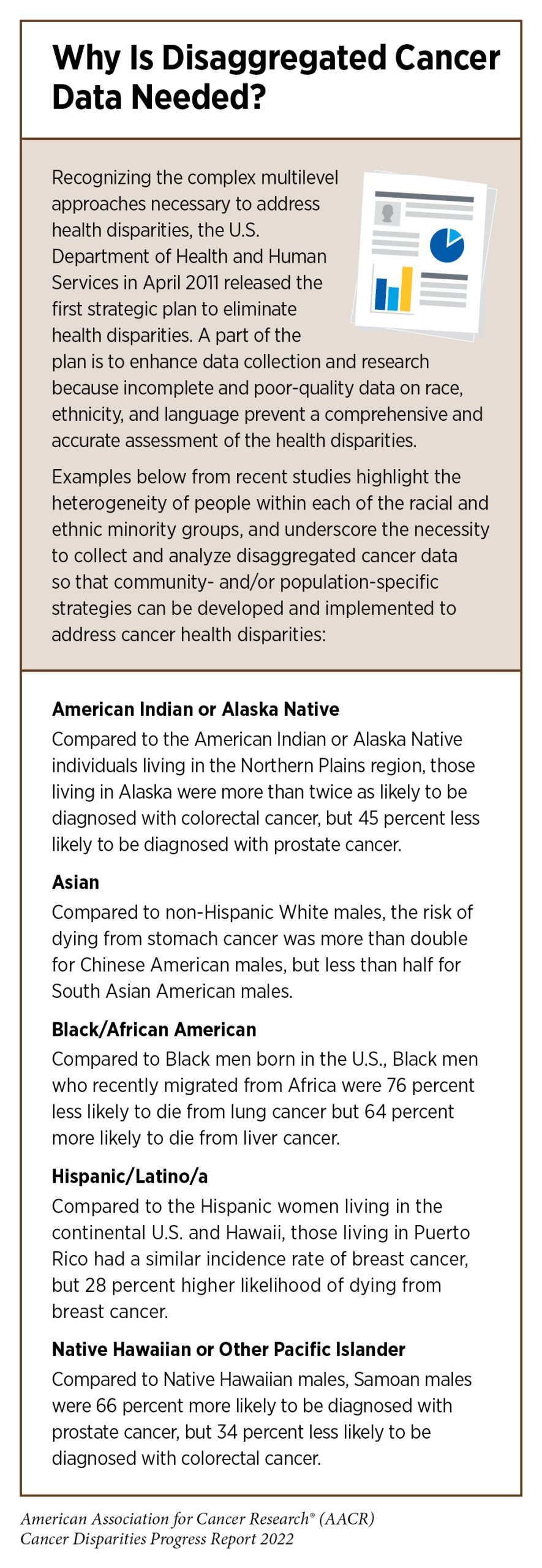 Within the judicial and legislative branches, there are also increased efforts to reduce the impact of structural racism on health outcomes. As of October 2021, the Department of Justice announced the launch of the “Combating Redlining Initiative,” its most powerful initiative to address lending discrimination in the past 50 years (987). Concurrently, there are hundreds of introduced bills in Congress that have the potential to promote health equity. In addition to increasing coordination between these programs across all branches of government, it is necessary to recognize the importance of disaggregating racial and ethnic demographics data. Underrepresented minorities and historically undeserved groups are not monolithic. It will take concerted efforts to understand the diversity that lies within each group to address and remedy cancer disparities. To intentionally address the health care needs of historically underserved groups and improve cancer outcomes, continued, meaningful collaboration across all branches of government and sustained, robust, and predictable funding for CDC and NIH, specifically NCI, are needed.