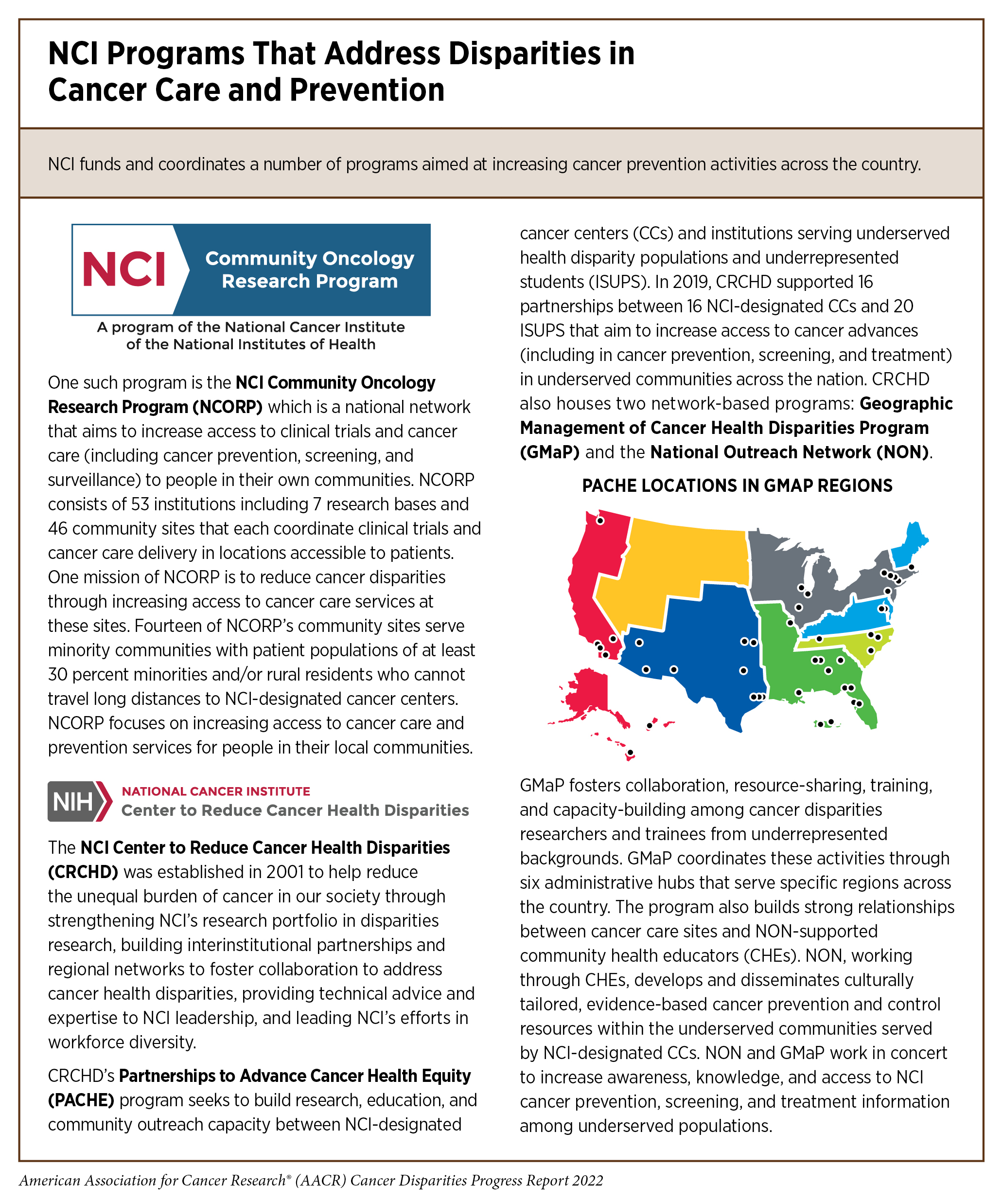 NCI has many initiatives that focus on reducing cancer disparities (see sidebar on NCI Programs that Address Disparities in Cancer Care and Prevention). For example, the NCI Community Oncology Research Program (NCORP) engages communities across the United States in clinical research to actively recruit medically underserved patients so clinical trials reflect the patient population intended to be treated. In addition to funding cancer disparities research, the NCI CRCHD helps train a diverse cancer research workforce (see Overcoming Cancer Health Disparities Through Diversity in Cancer Training and Workforce). NIMHD also supports research on how SDOH influence health risks. Robust, sustained, and predictable, and robust federal funding for these programs at NCI, NIMHD, and other NIH Institutes and Centers is vital to better understand which policy changes help promote health equity; recruit underrepresented patients in cancer research; and support a diverse workforce.