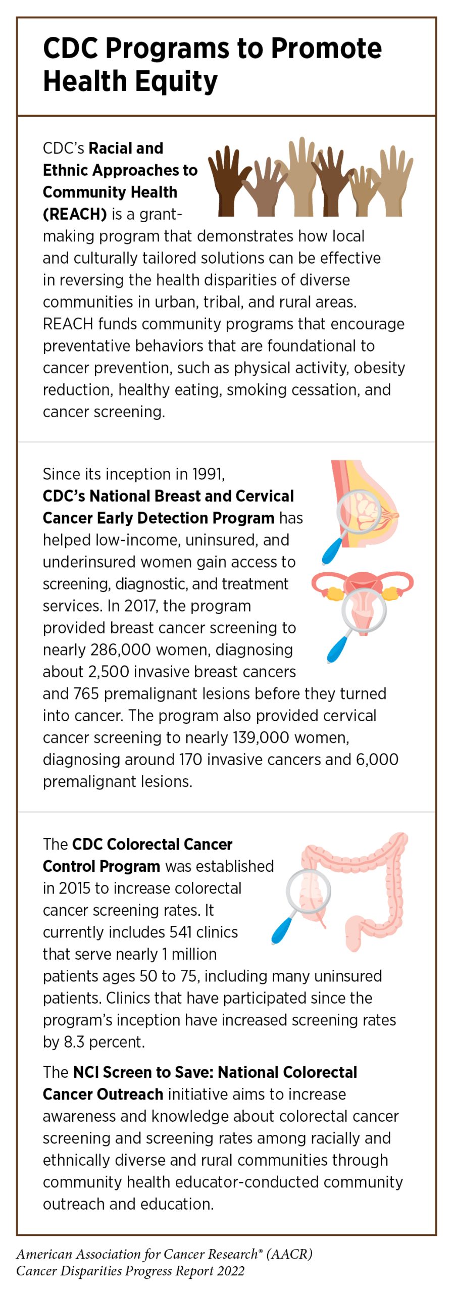 CDC’s many disease prevention programs provide access to cancer care and build health equity, such as the National Program of Cancer Registries (NPCR), the National Breast and Cervical Cancer Early Detection Program (NBCCEDP), Racial and Ethnic Approaches to Community Health (REACH), and the Colorectal Cancer Control Program (see sidebar on CDC Programs to Promote Health Equity). Federal investment in these programs enables CDC and local partners to collect data, share public health messages, and provide hundreds of thousands of cancer screenings annually for patients in communities with limited access to screening facilities. AACR advocates for additional investments for CDC to expand the work of the agency in these important areas.