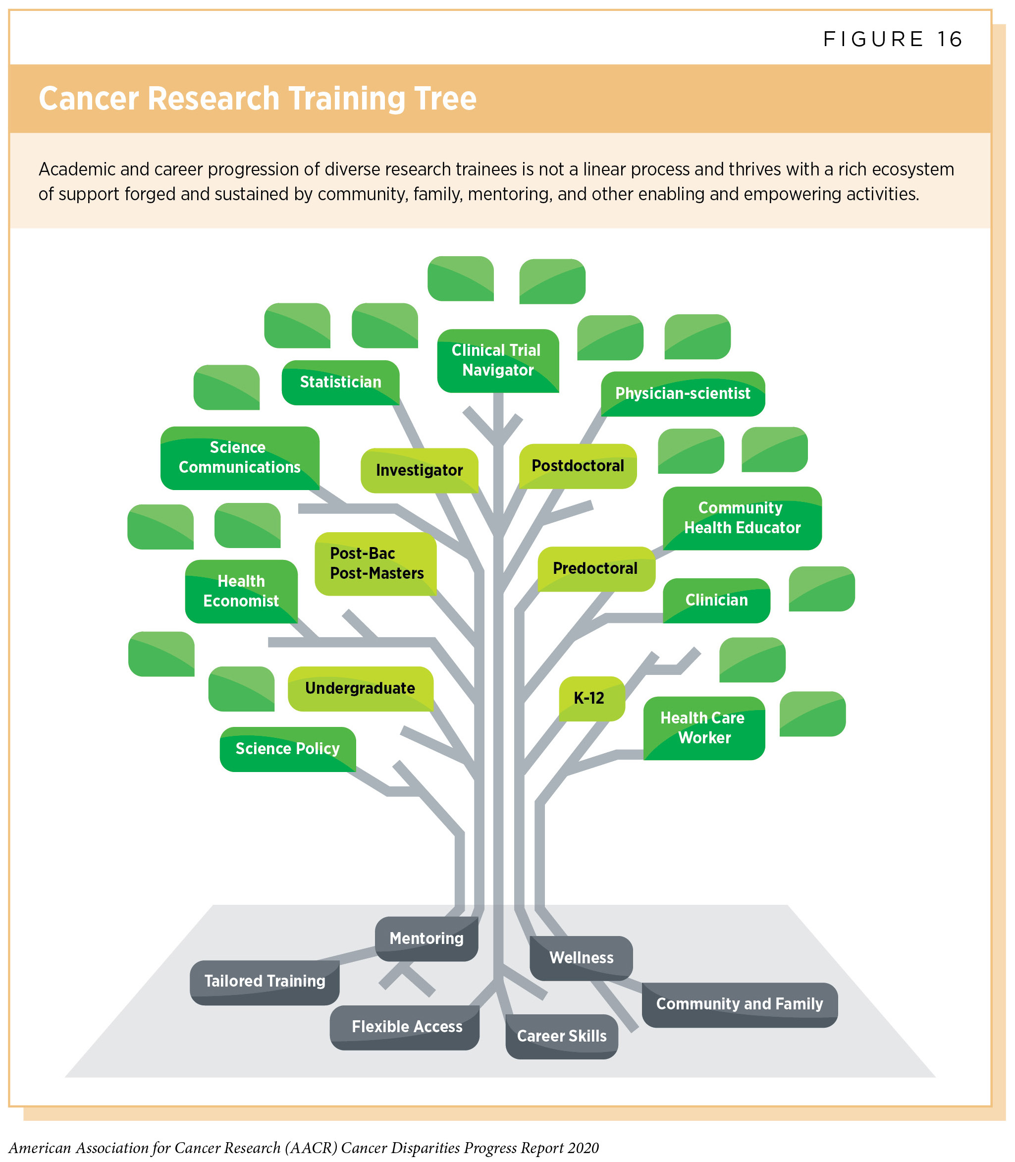 Fostering racial and ethnic diversity among trainees requires a robust ecosystem of support that is flexible, inclusive, and individualized. Moving into the next decade, in place of the traditional pipeline, cancer research training can be envisioned as a tree in which a diverse cadre of scientists draws nourishment from strong support systems and flourishes into different branches of academic and career achievements (see Figure 16). Taking the foregoing population- and programmatic-level factors into consideration, several actions are needed to meaningfully strengthen diversity in training (see sidebar on Recommendations for a Strong and Diverse Trainee Pipeline).