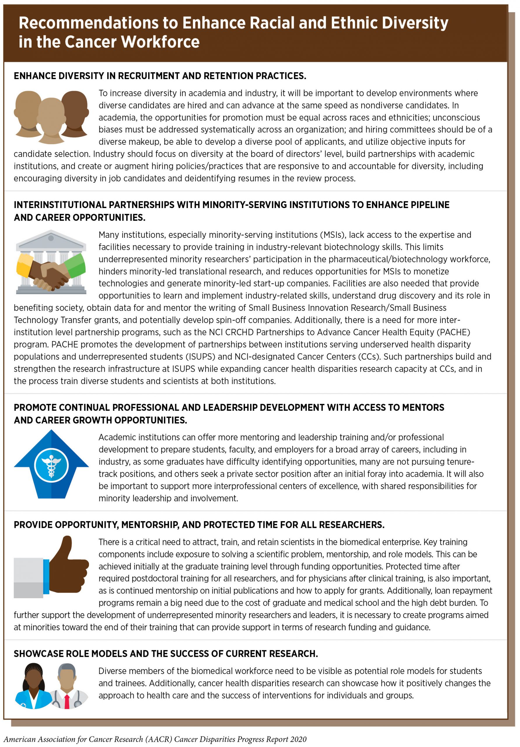 Urgent and immediate actions are necessary to strengthen diversity in the cancer workforce (see sidebar on Recommendations to Enhance Racial and Ethnic Diversity in the Cancer Workforce).