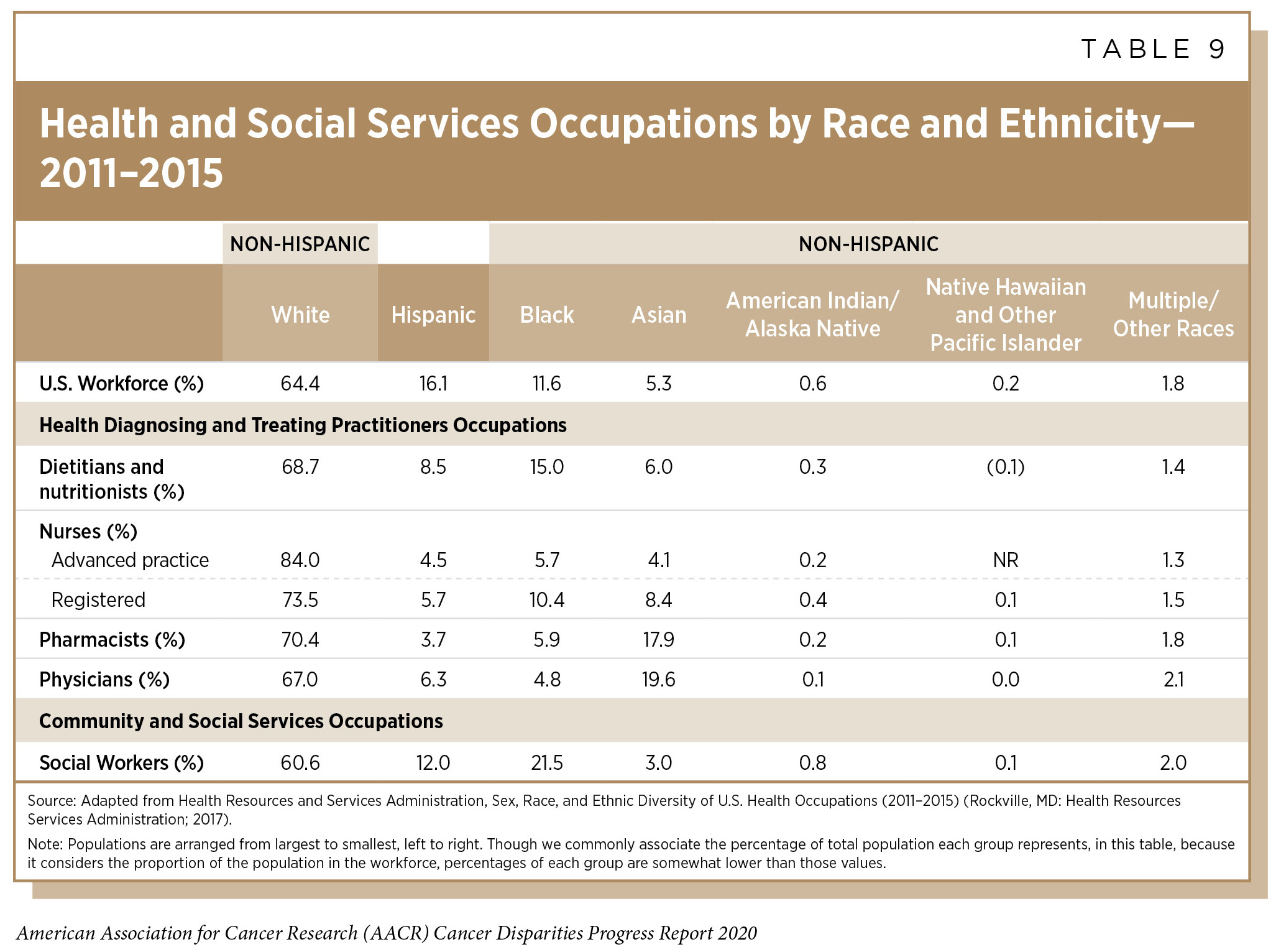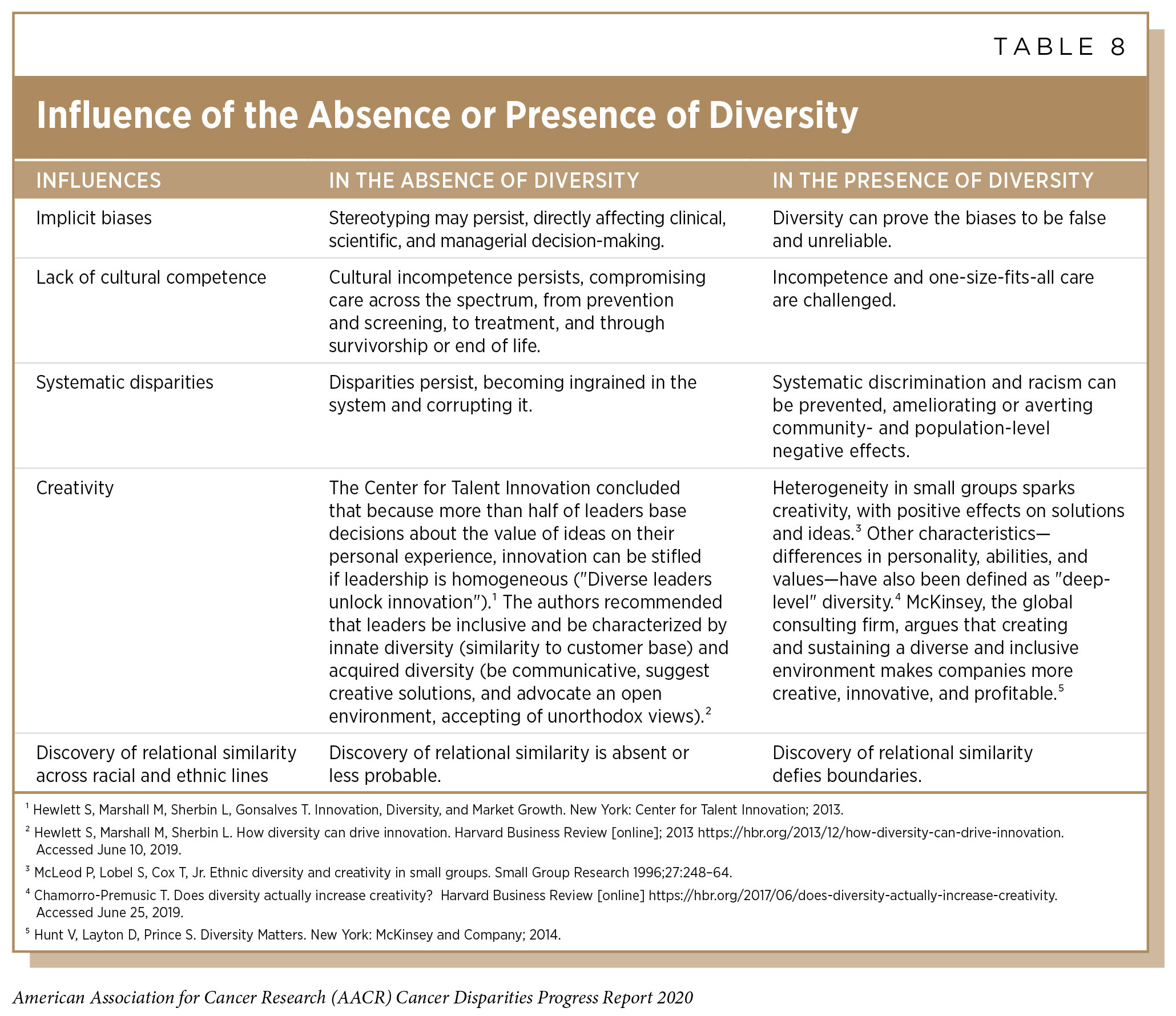 - A lack of racial and ethnic diversity in the pool of well-prepared trainees and well-trained researchers, and a lack of diversity in the health care workforce, contribute to cancer health disparities.