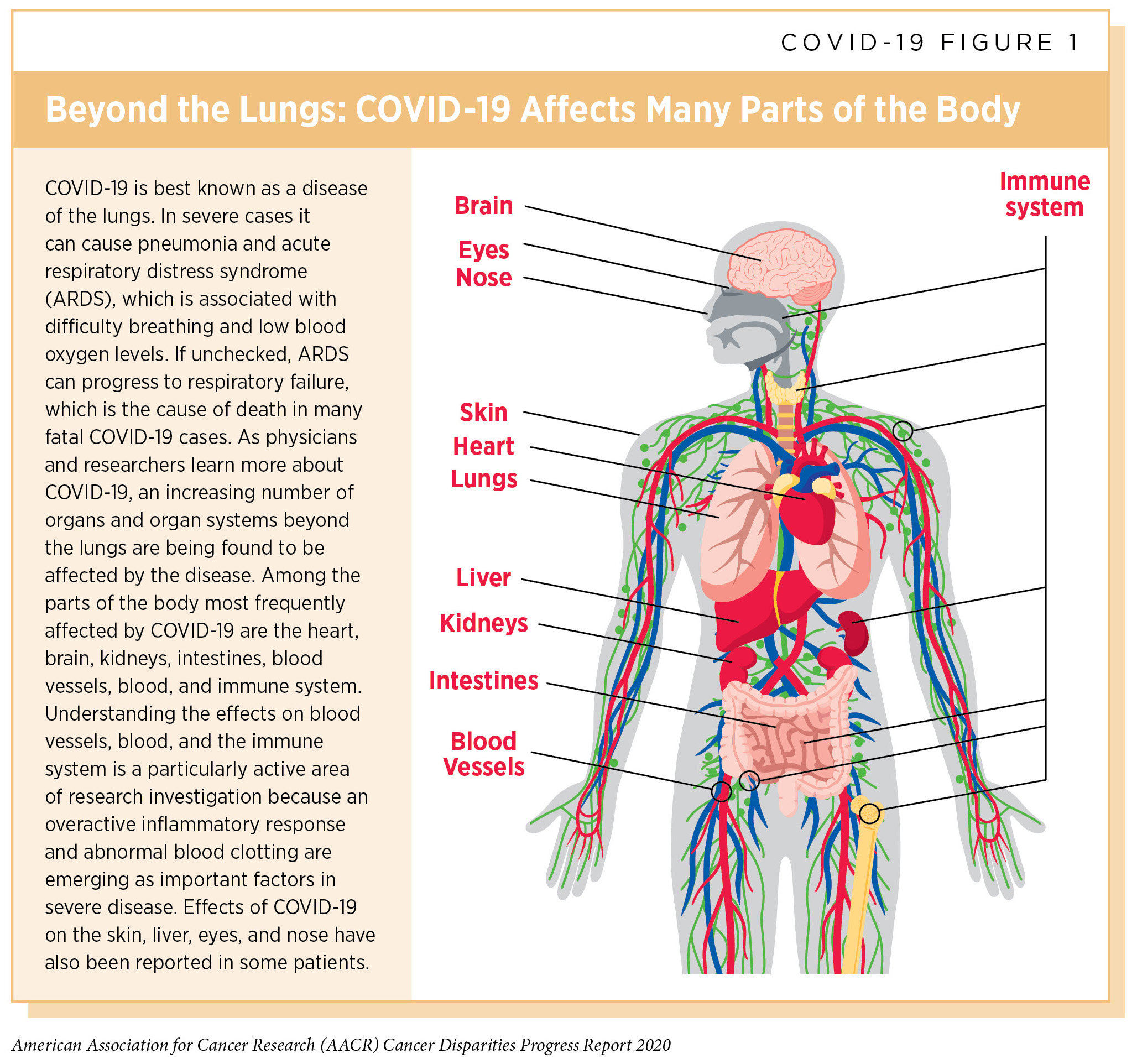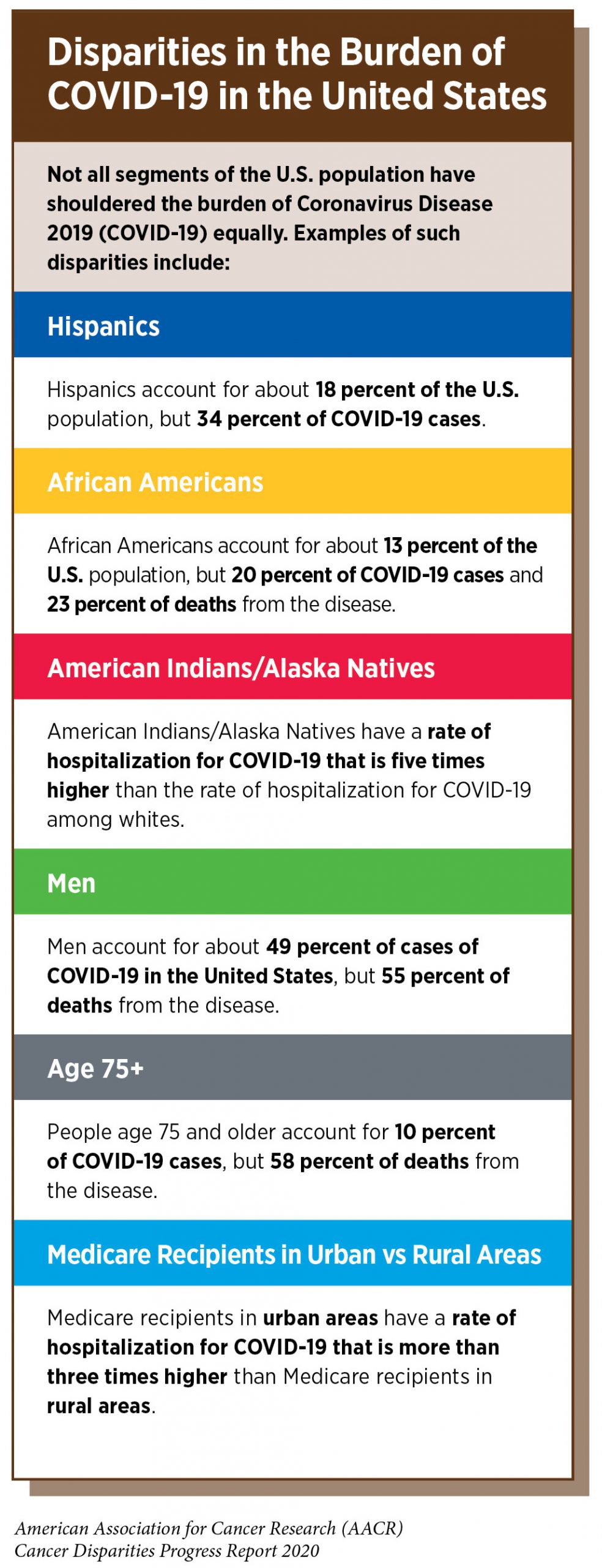 Researchers are actively working to identify the specific factors contributing to the disproportionate burden of COVID-19 among racial and ethnic minorities. Early data suggest that there are several complex and interrelated factors, some of which overlap with the factors that contribute to cancer health disparities (10)Bibbins-Domingo K. This Time Must Be Different: Disparities During the COVID-19 Pandemic. Ann Intern Med [Internet]. 2020 Apr 28 [cited 2020 Jul 16];(11)Webb Hooper M, Nápoles AM, Pérez-Stable EJ. COVID-19 and Racial/Ethnic Disparities. JAMA [Internet]. 2020 May 11 [cited 2020 Jul 16]; (see Why Do Cancer Health Disparities Exist?).