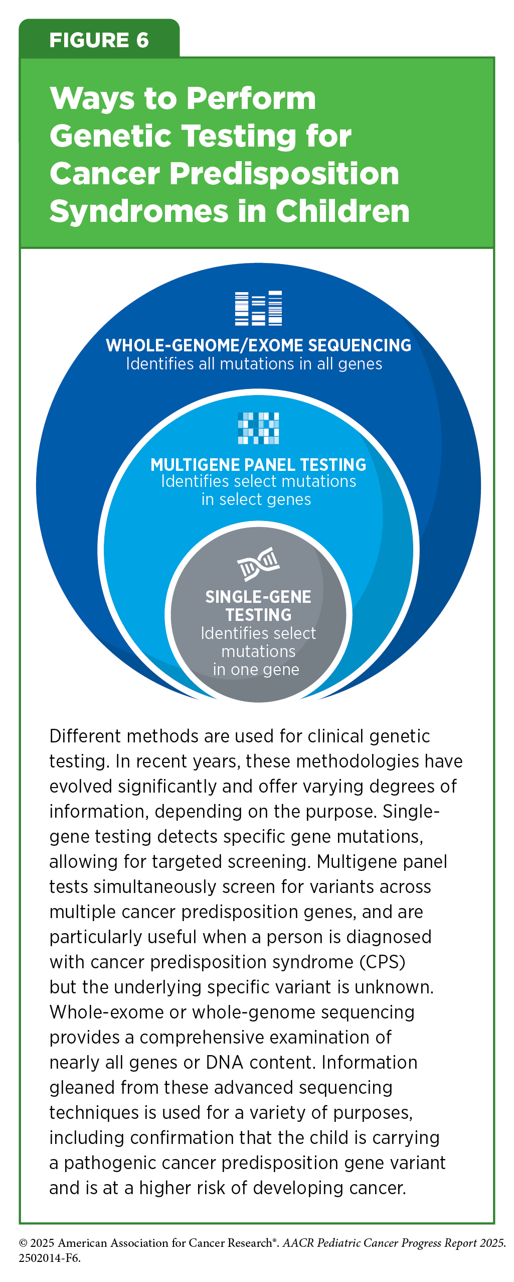 Studies have shown that distinctive physical traits, a strong family history of certain cancers, germline genetic testing, or a combination thereof, is the most effective way to identify children with CPS (170)Bakhuizen JJ, et al. (2024) Lancet Child Adolesc Health, 8: 751.. Genetic testing also helps determine whether specific conditions, such as retinoblastoma or Wilms tumor, are heritable or sporadic by identifying specific genetic alterations associated with these cancers. However, it is important to note that genetic testing and counseling is not readily available for many because it requires state-of-the-art infrastructure and trained health care professionals (see Sidebar 8). Another issue is the lack of education and understanding of the tests, their findings, and how they are used to inform clinical management among health care providers, patients, and family members (171)Capasso A, et al. (2025) J Genet Couns, 34: e1887.. Research has also found that pediatric patients and their siblings face higher rates of insurance denials for genetic testing (172)Zion TN, et al. (2023) Genet Med, 25: 100020..