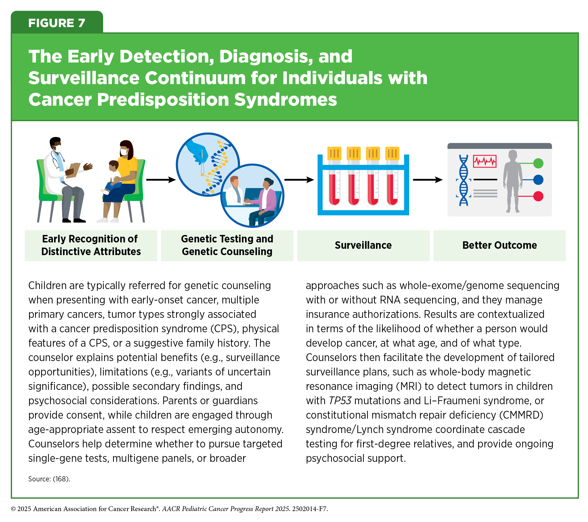 Genetic counseling combines multiple specialties, such as clinical genetics, cancer care, and psychosocial care, to guide families through the evaluation of inherited cancer risk in children (186)Zelley K, et al. (2024) Clin Cancer Res, 30: 3983.. It is a communication process in which a genetic counselor—a health professional who has specialized training in clinical genetics and counseling—helps the parents or guardians understand their child’s risk of developing cancer, as well as options for genetic testing, including its risks and benefits. After genetic testing is done, genetic counselors help parents or guardians understand genetic test results, including how the results can affect other family members, and provide counseling and support for next steps that may include surveillance planning and cascade testing. Recent pediatric oncology frameworks and guidelines emphasize that timely identification of a CPS can alter the course of care and improve outcomes by enabling early, targeted surveillance and risk-reduction strategies (see Screening and Surveillance Recommendations) (186)Zelley K, et al. (2024) Clin Cancer Res, 30: 3983.. In addition, there is emerging evidence that patients with constitutional mismatch repair deficiency (CMMRD)-related cancers can benefit from treatment with immune checkpoint blockade immunotherapies (187)Westdorp H, et al. (2017) Cancer Lett, 403: 159.(188)Henderson JJ, et al. (2022) JCO Precis Oncol, 6: e2100286.(189)Palova H, et al. (2024) NPJ Precis Oncol, 8: 110..