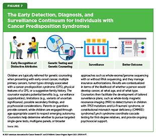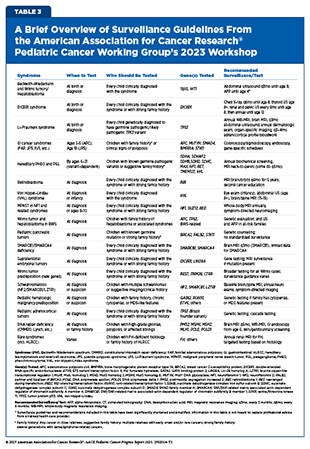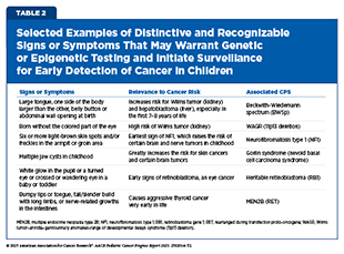 Traditionally, the clinical approach to genetic testing and surveillance begins after a child has been identified to have a strong or suggestive family history of a CPS, shows specific signs or symptoms associated with the syndrome, or has been diagnosed with specific cancers (see Table 2). The recently updated surveillance recommendations issued by the American Association for Cancer Research (AACR) Pediatric Cancer Working Group (PCWG), a multidisciplinary