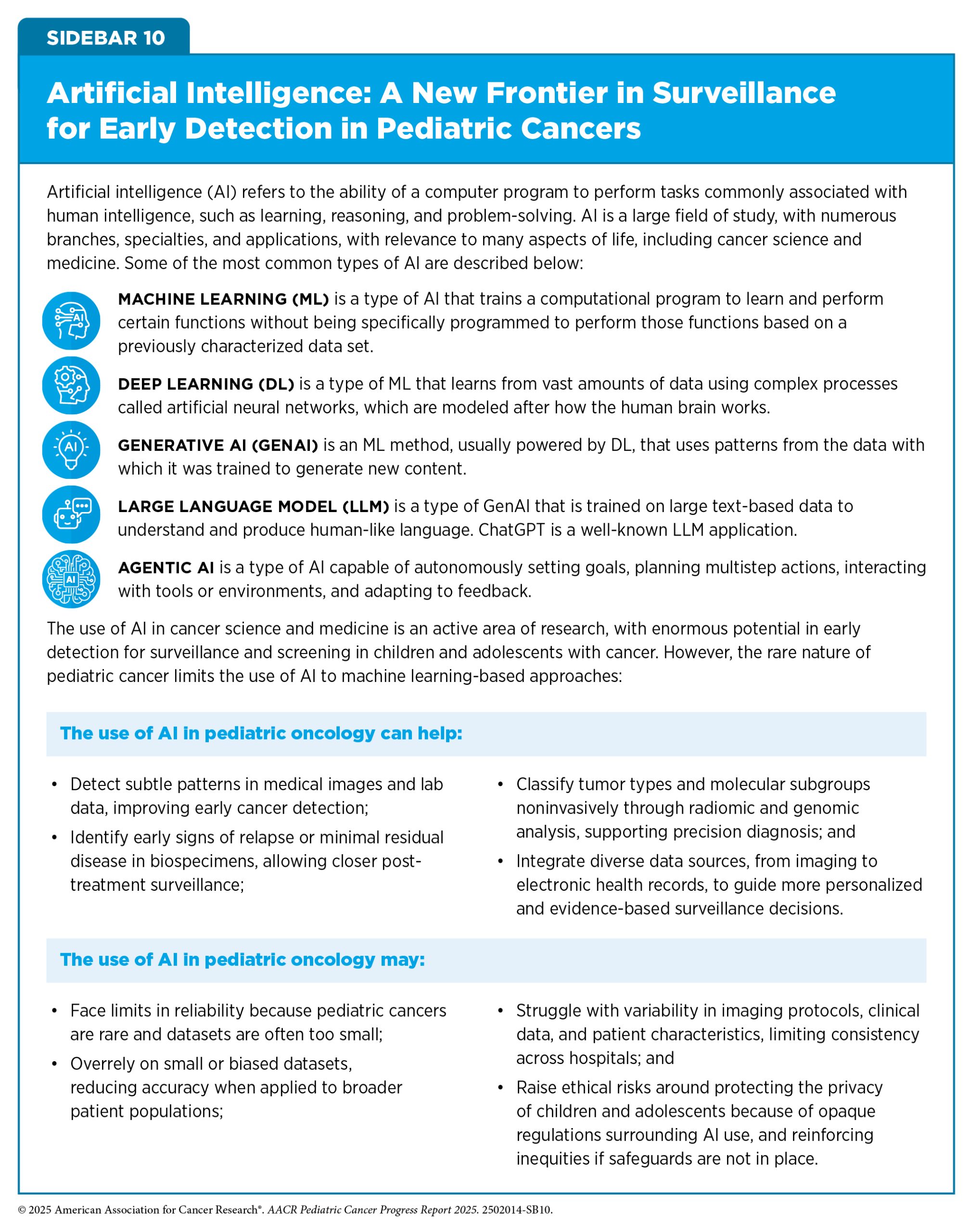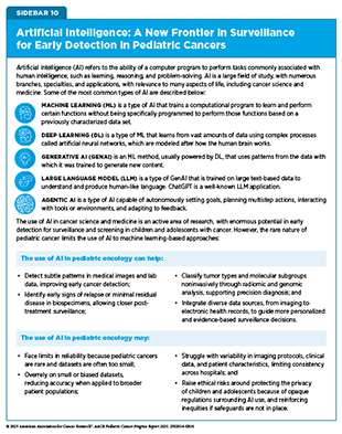 Artificial Intelligence (AI) is a general term that applies to training a computational model to perform tasks commonly associated with human intelligence, such as how to reason, and learn. The use of AI carries enormous potential across the continuum of cancer care for adults, including in early detection of cancer, as is increasingly evident from US Food and Drug Administration (FDA) approvals and the integration in the clinic of AI-based software and devices. However, the field remains nascent for surveillance and screening in children with CPSs (see Sidebar 10) (249)Hashem H, et al. (2025) Front Med (Lausanne), 12: 1555893.(250)Elsayid NN, et al. (2025) Cureus, 17: e77524.(251)Ramesh S, et al. (2021) JCO Clin Cancer Inform, 5: 1208.(252)Hassan M, et al. (2025) Cancers (Basel), 17..