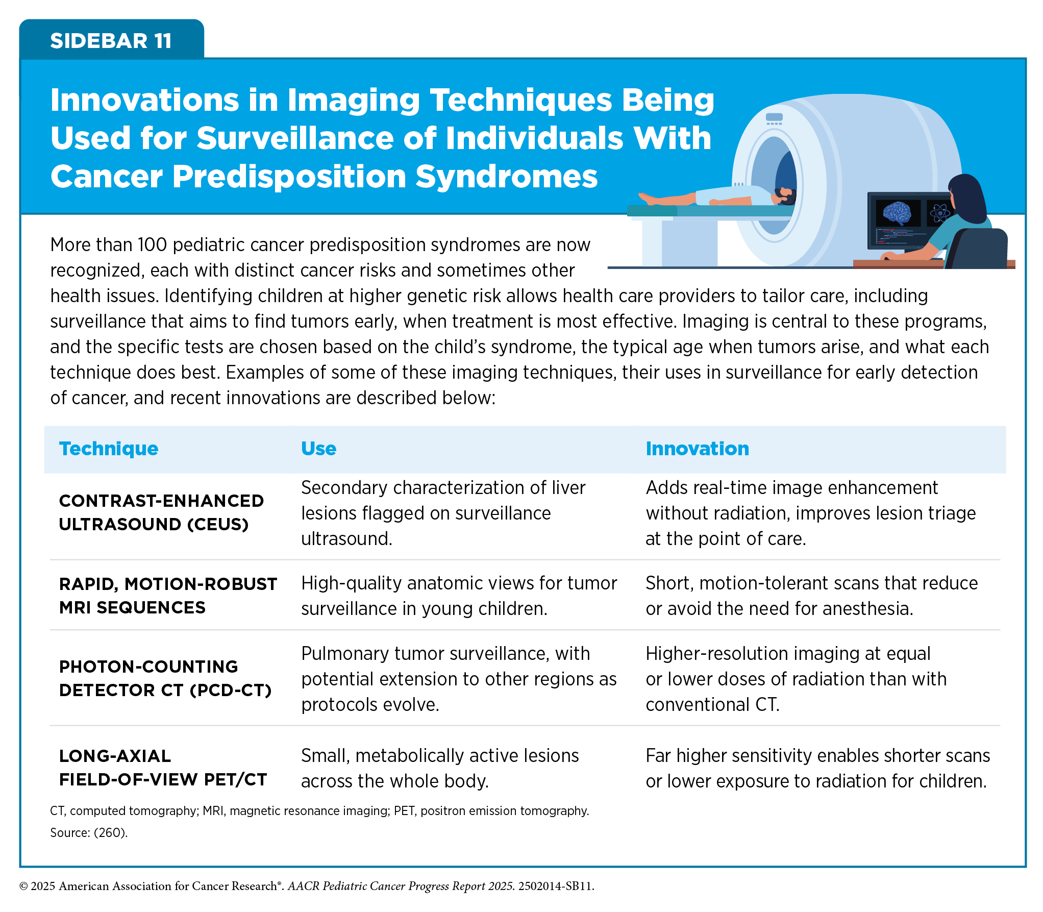 Imaging is the backbone for finding tumors early and tailoring tests according to specific risks associated with different CPSs, as well as with children’s ages of onset (260)Perrino M, et al. (2025) AJR Am J Roentgenol.. In recent years, many advances and innovations in imaging techniques have significantly improved the surveillance of children with CPS (see Sidebar 11).
