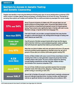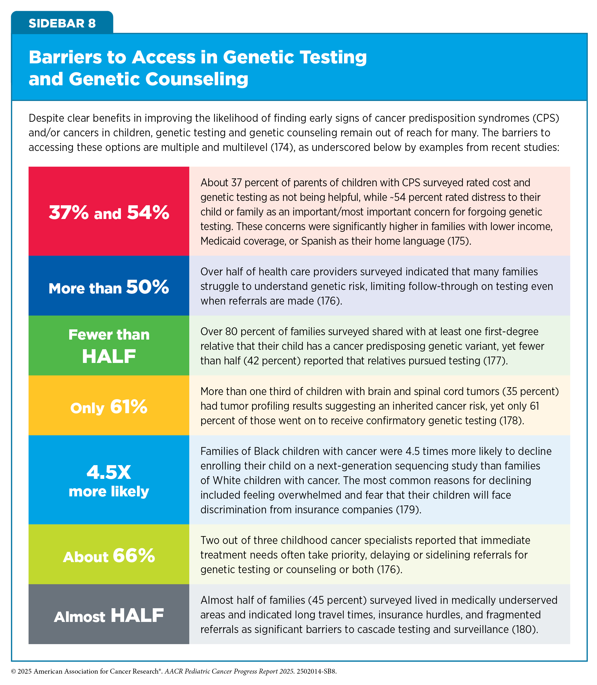 Evidence shows that using telehealth for genetic counseling can provide knowledge and satisfaction comparable to that achieved with in-person visits, with the added benefit of reduced travel and wait times (195,196). Demand for pediatric cancer genetic counseling currently exceeds the available number of trained counselors, especially outside large academic centers (197)Bakhuizen JJ, et al. (2024) EJC Paediatric Oncology, 4: 100176.. Even with advanced sequencing, variants of uncertain significance remain common, requiring nuanced interpretation and long-term follow-up. Although the federal Genetic Information Nondiscrimination Act (GINA) prohibits discrimination based on genetic information in health insurance and employment, adolescents with cancer and their parents often report heightened anxiety and concern about future insurability after receiving genetic test results (198)Van Hoyweghen S, et al. (2025) Cancers (Basel), 17.. Several additional barriers to access to genetic testing and counseling may further affect the uptake of these services (see Sidebar 8).