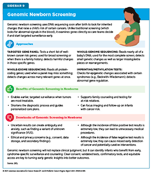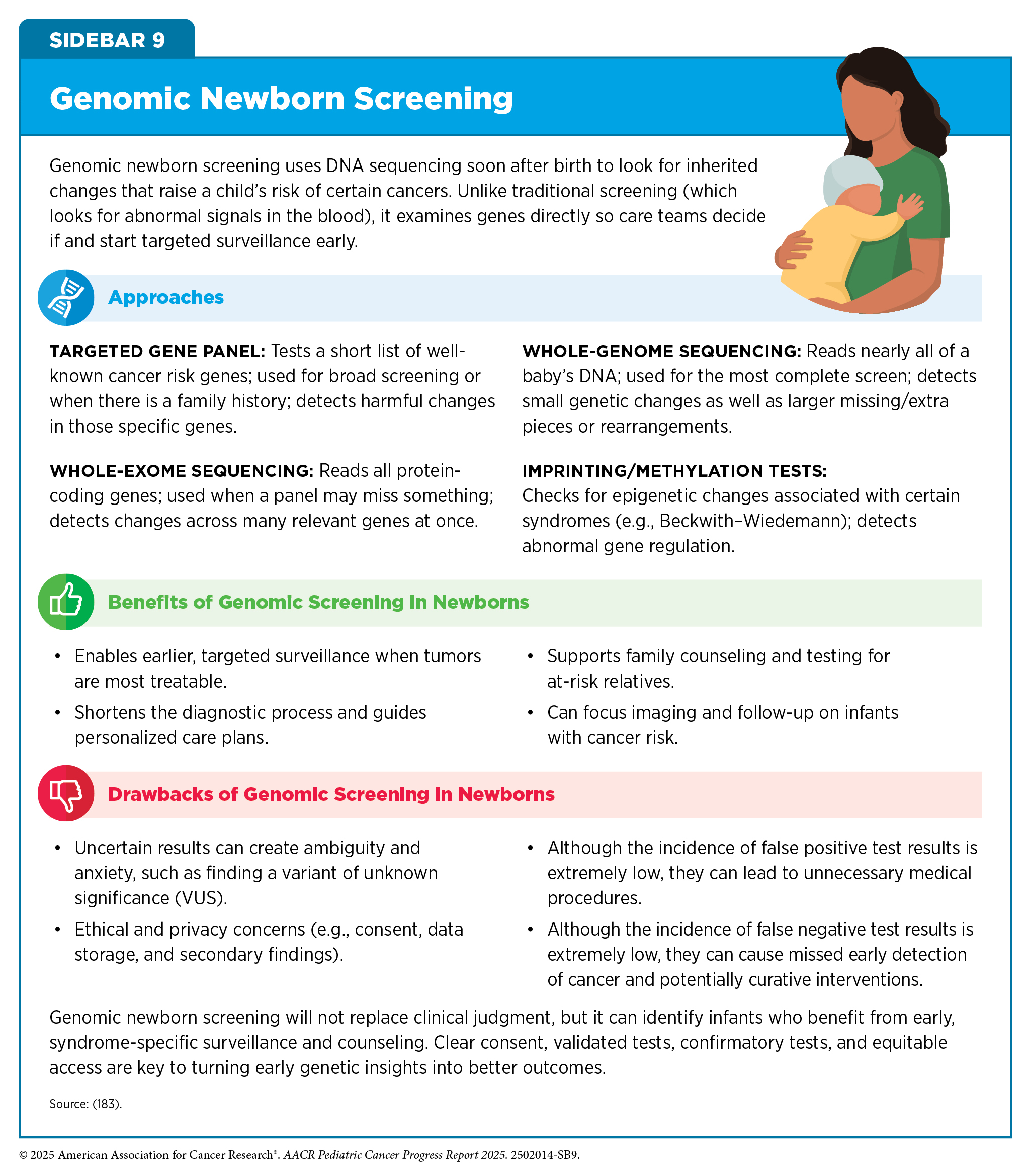 Across the globe, researchers are testing whether newborn genetic screening could spot cancer risks before the disease develops. Modeling studies suggest that sequencing panels for a handful of cancer predisposition genes could reduce childhood cancer deaths by nearly half and may become cost-effective as sequencing prices fall (181)Yeh JM, et al. (2021) Genet Med, 23: 1366.. Real-world studies demonstrate feasibility of the approach across families (182)Smith HS, et al. (2024) Am J Hum Genet, 111: 2094.(183)Linga BG, et al. (2024) Cancers (Basel), 16., while population-based studies show clinical benefits and cost-effectiveness of TP53 gene testing for Li–Fraumeni syndrome (LFS) in newborns (184)Kunst N, et al. (2022) J Natl Cancer Inst, 114: 722.. Additional studies, such as the Generation Study in the United Kingdom, which aims to sequence the genomes of 100,000 newborn babies to identify rare conditions, including CPSs, are ongoing (185)Genomics England. Newborn Genomes Programme. Accessed: August 31, 2025.. Key questions that remain, and require additional research, include which genes to evaluate, how to balance benefits against potential harms such as false positives, cost-effectiveness, and how families and health care systems will manage the ethical and practical challenges of sequencing every newborn (see Sidebar 9).