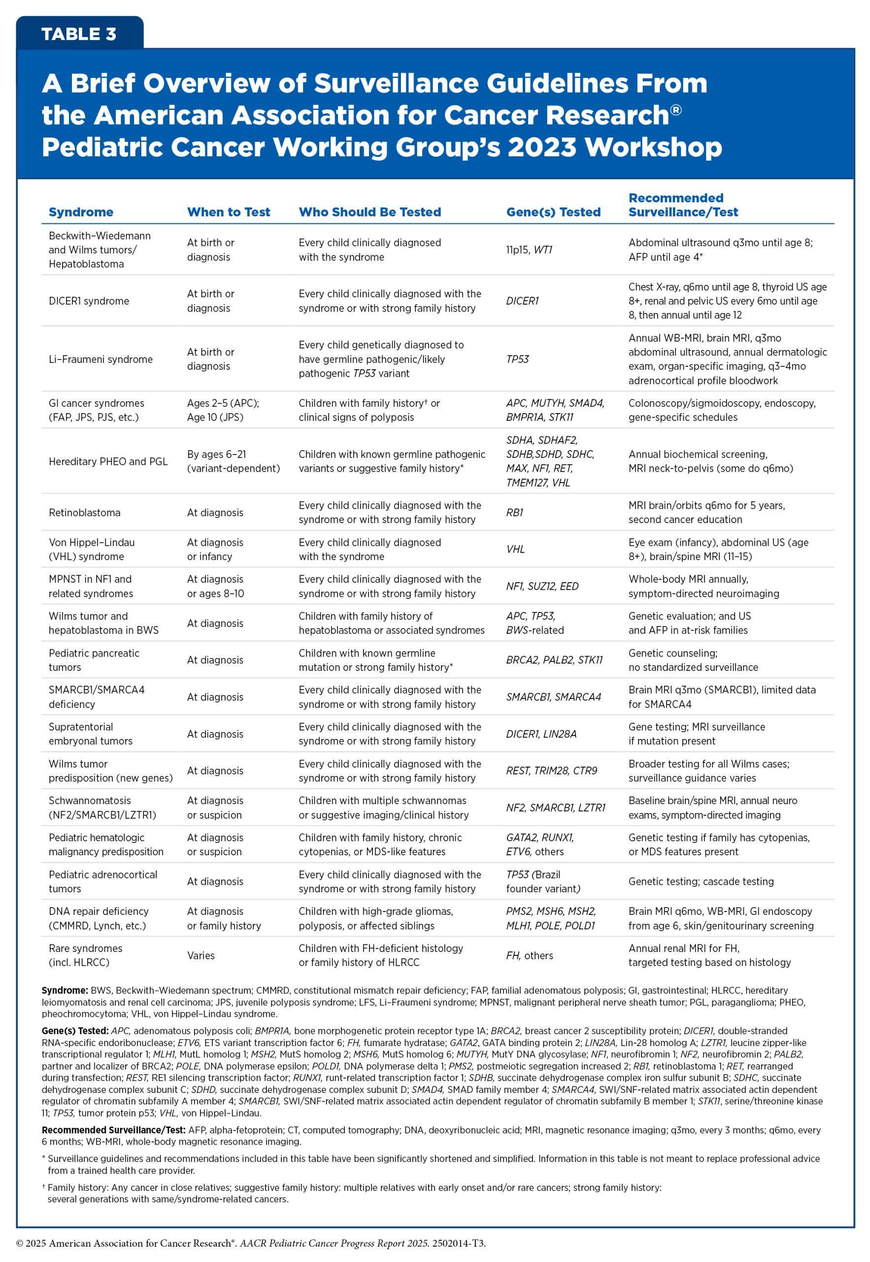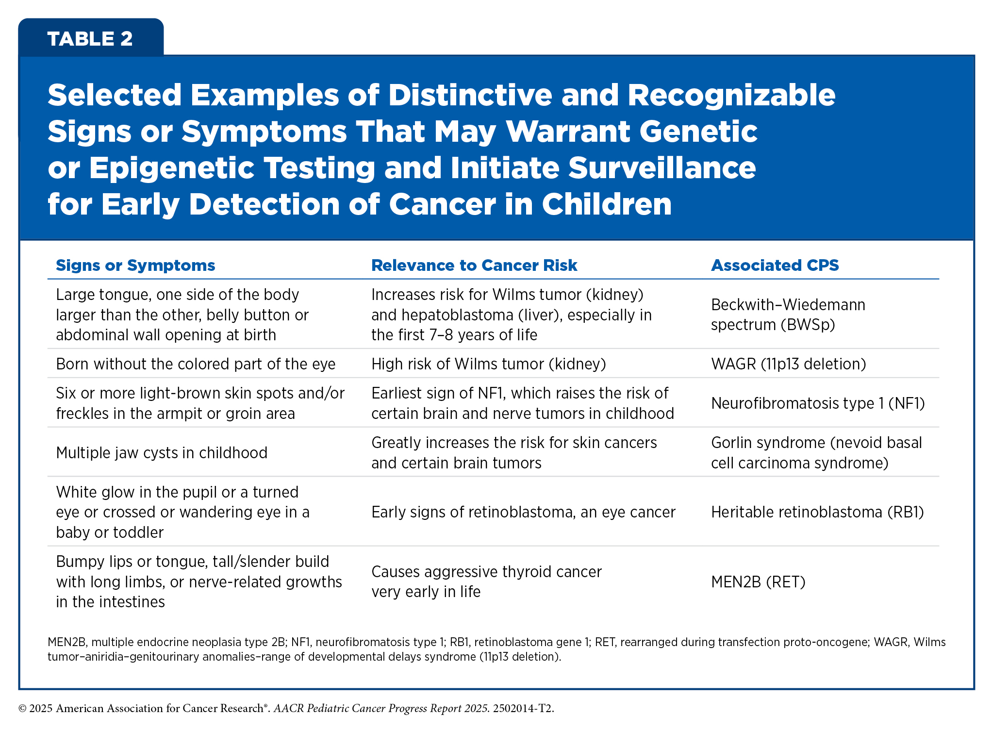 To standardize surveillance protocols for children with CPS, AACR convened a workshop in 2016 to develop consensus recommendations for early cancer detection in affected children (215)Brodeur GM, et al. (2017) Clin Cancer Res, 23: e1.. A follow-up workshop in 2023 expanded and updated these guidelines to reflect new data and include newly identified syndromes, while also exploring emerging surveillance technologies and potential prevention strategies for high-risk pediatric populations (36)Brodeur GM, et al. (2025) Clin Cancer Res, 31: 2581.(91)Kamihara J, et al. (2024) Clin Cancer Res, 30: 3137.(186)Zelley K, et al. (2024) Clin Cancer Res, 30: 3983.(193)Greer MC, et al. (2024) Clin Cancer Res, 30: 5021.(194)Hansford JR, et al. (2024) Clin Cancer Res, 30: 2342.(206)Brzezinski JJ, et al. (2025) Clin Cancer Res, 31: 18.(216)Rednam SP, et al. (2025) Clin Cancer Res, 31: 3368.(217)Wasserman JD, et al. (2025) Clin Cancer Res, 31: 3628.(218)Voss SD, et al. (2025) Clin Cancer Res, 31: 3638.(219)Rednam SP, et al. (2025) Clin Cancer Res, 31: 2271.(220)Achatz MI, et al. (2025) Clin Cancer Res, 31: 1831.(221)Kamihara J, et al. (2025) Clin Cancer Res, 31: 1573.(222)Perrino MR, et al. (2025) Clin Cancer Res, 31: 1400.(223)Michaeli O, et al. (2025) Clin Cancer Res, 31: 457.(224)Schultz KAP, et al. (2025) Clin Cancer Res, 31: 234.(225)Kalish JM, et al. (2024) Clin Cancer Res, 30: 5260.(226)Nakano Y, et al. (2024) Clin Cancer Res, 30: 5009.(227)Perrino MR, et al. (2024) Clin Cancer Res, 30: 4834.(228)MacFarland SP, et al. (2024) Clin Cancer Res, 30: 4566.(229)Maese LD, et al. (2024) Clin Cancer Res, 30: 4286.(230)Das A, et al. (2024) Clin Cancer Res, 30: 3378.(231)Kratz CP, et al. (2024) Clin Cancer Res, 30: 1733.. The updated guidelines for certain CPSs now recommend that surveillance begin at birth or during early childhood, depending on the syndrome, with blood tests and with ultrasound or MRI imaging prioritized over computed tomography (CT) to reduce radiation exposure. These protocols aim to catch tumors early when cure rates exceed 90 percent, such as for Wilms tumor or hereditary retinoblastoma (see Table 3).