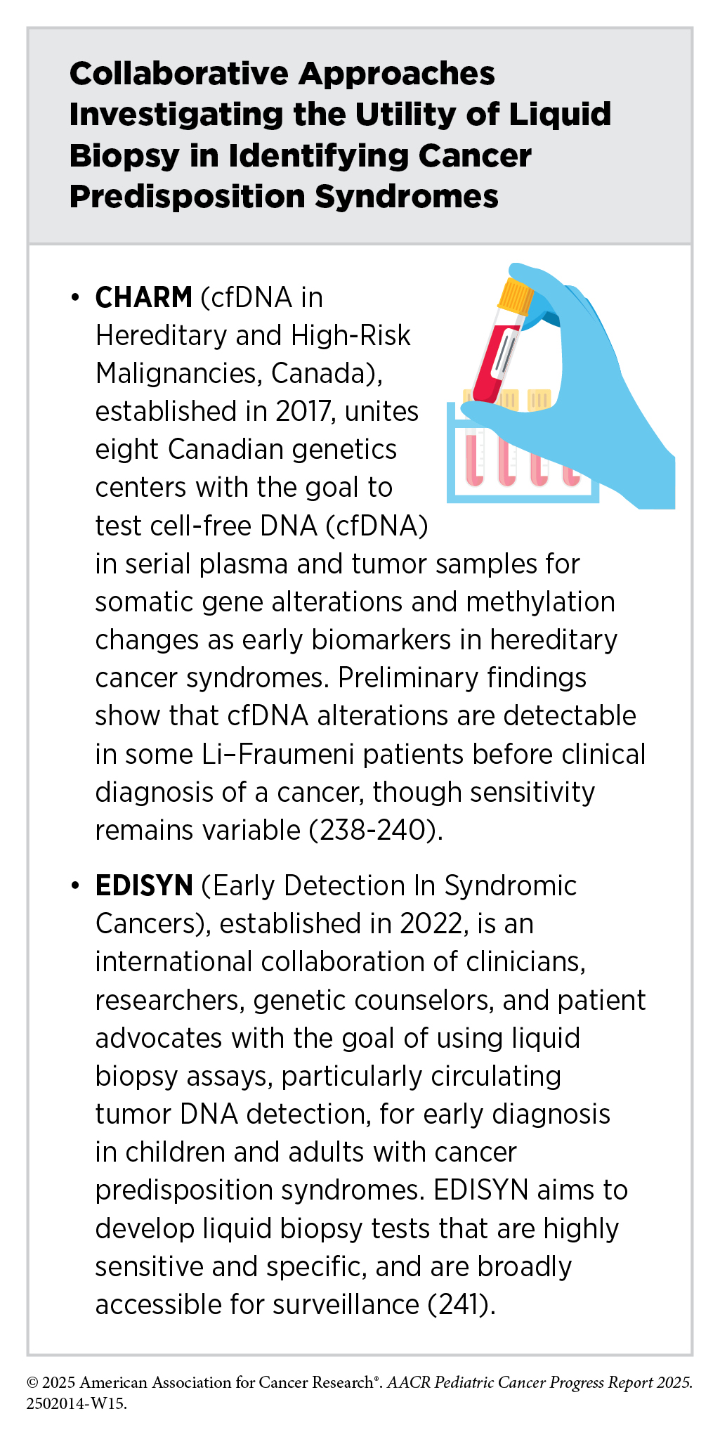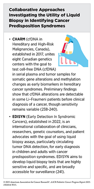 Liquid biopsies are emerging as a powerful, minimally invasive alternative to traditional, invasive tissue biopsies, with potential application across the continuum of care for children with cancer (see Liquid Biopsy) (234)Sundby RT, et al. (2022) Curr Opin Pediatr, 34: 39.(235)Janssen FW, et al. (2024) NPJ Precis Oncol, 8: 210.. Two recent studies point to a promising role for liquid biopsy in early detection among children with a CPS (236)Sundby RT, et al. (2024) Clin Cancer Res, 30: 4363.(237)Wong D, et al. (2024) Cancer Discov, 14: 104.. In a cohort of 89 people with LFS, including 26 children, researchers analyzed 193 blood samples using an approach that detects DNA alterations, variations in the size of the circulating tumor DNA (ctDNA) fragments, and epigenetic marks. In some cases, cancer-related signals appeared when the child had no clinical symptoms, and in several cases, these signals emerged months before standard surveillance detected any lesions. Among clinically cancer-free carriers, just over half of positive results (54 percent) reflected a true cancer signal, and a negative result was 95 percent accurate (237)Wong D, et al. (2024) Cancer Discov, 14: 104.. In individual samples, epigenetic marks were detectable about 20 months before traditional detection methods for osteosarcoma, a type of bone cancer, and combined DNA fragment and epigenetic signals preceded clinical diagnosis of leukemia or melanoma by about 6 to 18 months (237)Wong D, et al. (2024) Cancer Discov, 14: 104..