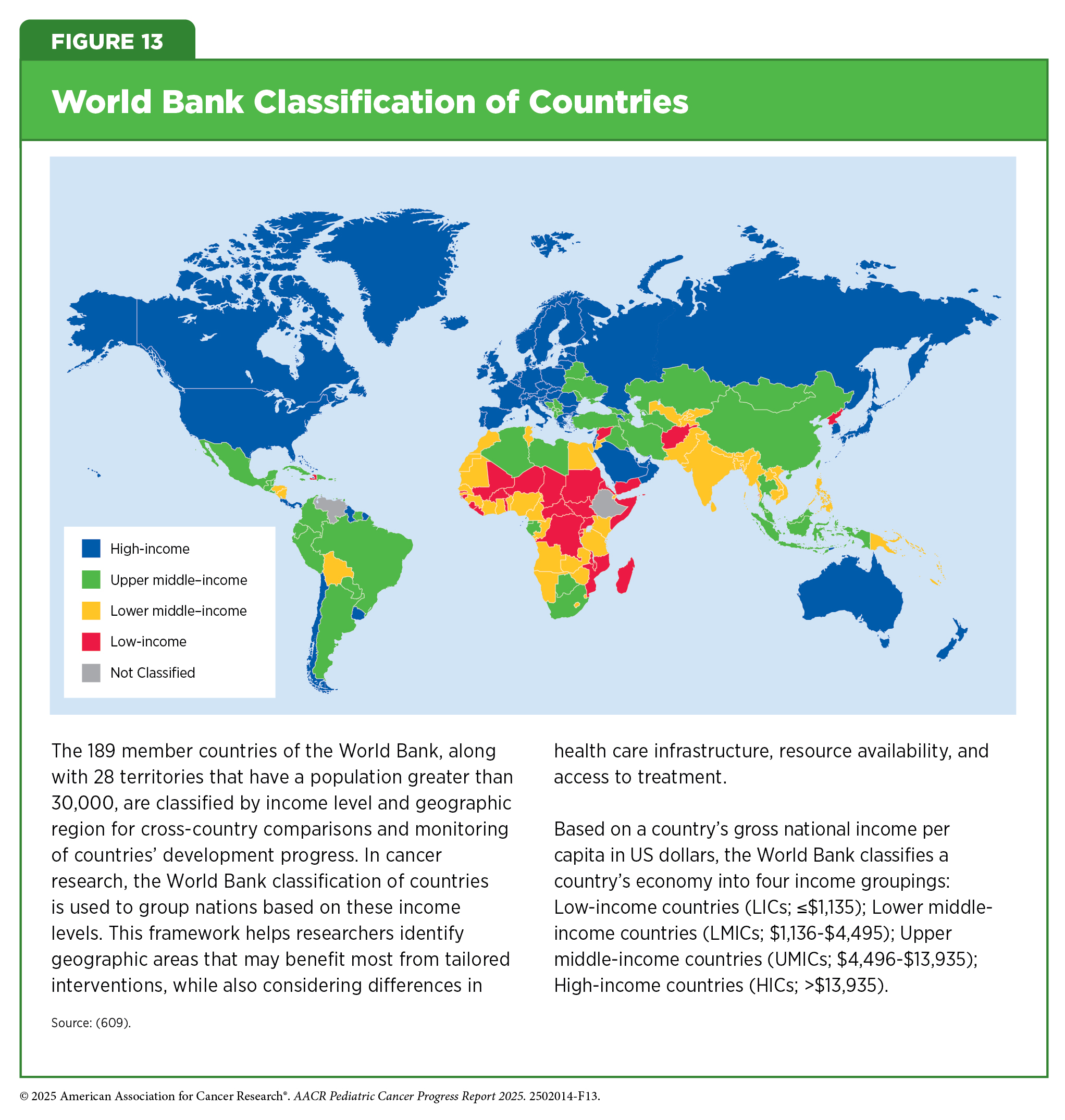 Pediatric cancer is a significant global health challenge, extending far beyond the United States (US) and other high-income countries (HICs), which together account for only an estimated 10 percent to 20 percent of the total pediatric cancer burden (66)Atun R, et al. (2020) Lancet Oncol, 21: e185.(602)Bhakta N, et al. (2019) Lancet Oncol, 20: e42.. In contrast, between 80 percent and 90 percent of pediatric cancers occur in low-income and middle-income countries (see Figure 13) (602)Bhakta N, et al. (2019) Lancet Oncol, 20: e42.(603)Noyd DH, et al. (2025) JCO Glob Oncol, 11: e2400274..
