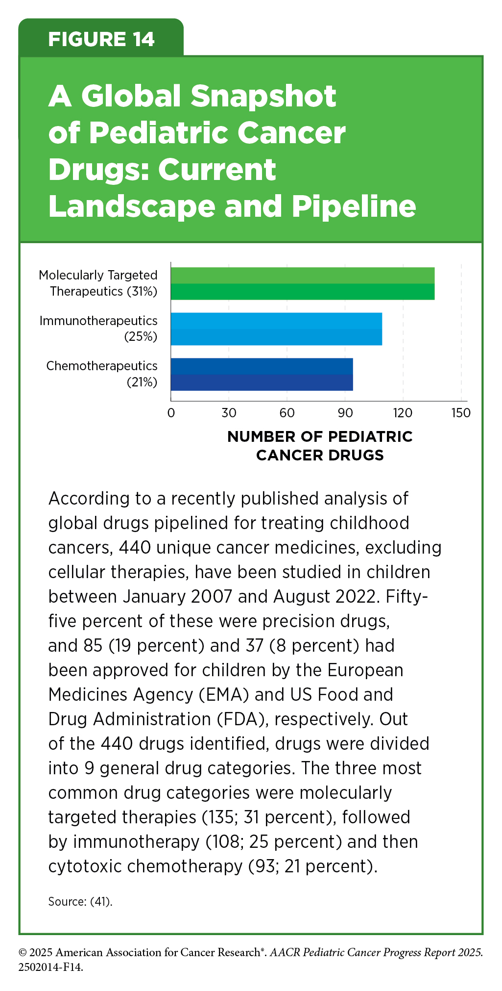 Around the globe, treatment options for children with cancer have expanded well beyond conventional chemotherapy in recent decades, although uneven access remains a major challenge (see Access to Clinical Care: Disparities and Solutions). In a recent study, researchers conducted a large-scale review of more than 5,000 clinical trials registered worldwide between 2007 and 2022, focusing on medicines tested in children with cancer. The analysis showed that there are 440 unique cancer medicines under study, excluding cell therapies (41)Cleveland C, et al. (2025) Lancet Child Adolesc Health, 9: 544.. Furthermore, targeted therapies and immunotherapies made up more than half of all medicines tested in children (55 percent), reflecting a shift from traditional chemotherapy (see Figure 14) (41)Cleveland C, et al. (2025) Lancet Child Adolesc Health, 9: 544..