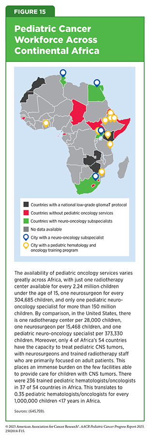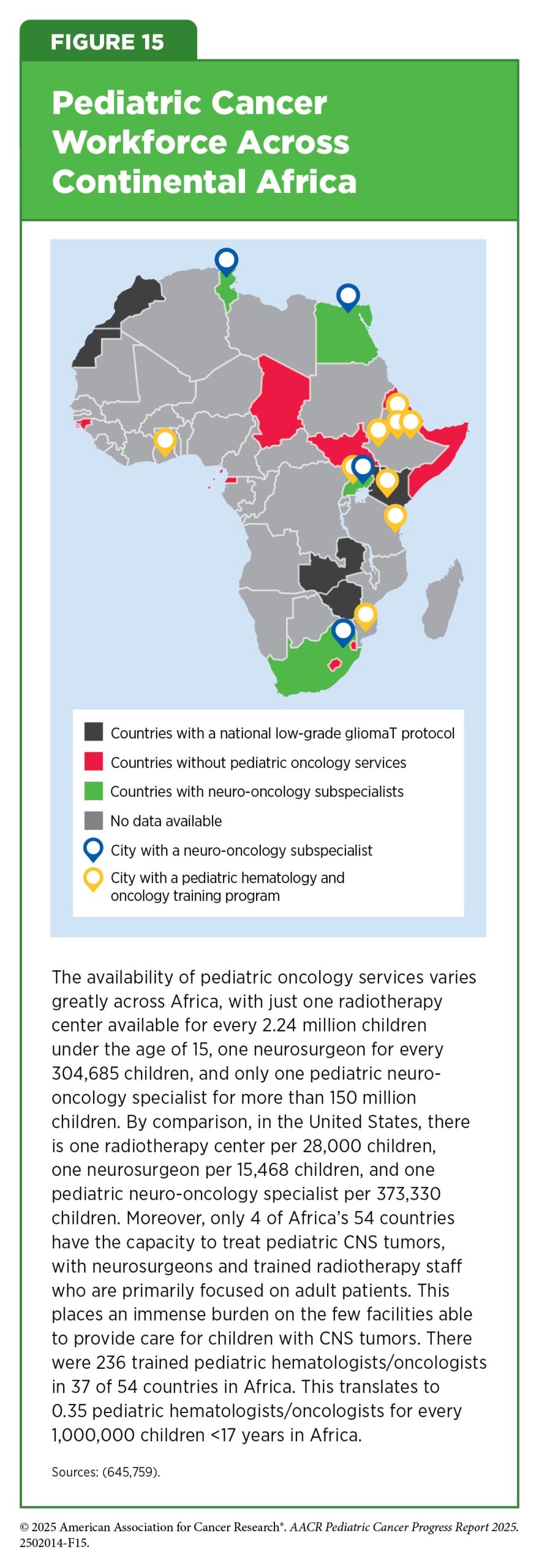 Assessment of pediatric oncology services in Africa makes the depth of shortage in the region clear, but also helps set measurable targets (see Figure 15) (693)Geel JA, et al. (2021) Pediatr Blood Cancer, 68: e29345.(758)Trapani D, et al. (2021) ESMO Open, 6: 100292.. A recent regional analysis identified 236 fellowship-trained pediatric hematology-oncology specialists across 37 countries, with 17 countries having none. Countries who did have pediatric hematology-oncology specialists had an average burden of about 205 new pediatric cancer cases per specialist. Program evaluations identified interventions that can help mitigate this shortage, including standardized curricula and leadership development to increase training as well as retain trainees (759)Fufa D, et al. (2025) BMJ Glob Health, 10.. These data align with the POEM network’s catalog of physician and nurse training programs and its observation that training capacity and access to specialists is linked with national income, indicating that coordinated regional networks may help overcome uneven distribution of the pediatric oncology workforce (755). Together, these findings underscore that workforce shortfalls are systemic across countries that are not high-income, with serious consequences for children with cancer, including timeliness of treatments and use of standardized treatment protocols, as well as survival outcomes (692)Anacak Y, et al. (2021) Clin Oncol (R Coll Radiol), 33: e211.(753)Roach JT, et al. (2023) JCO Glob Oncol, 9: e2200402..