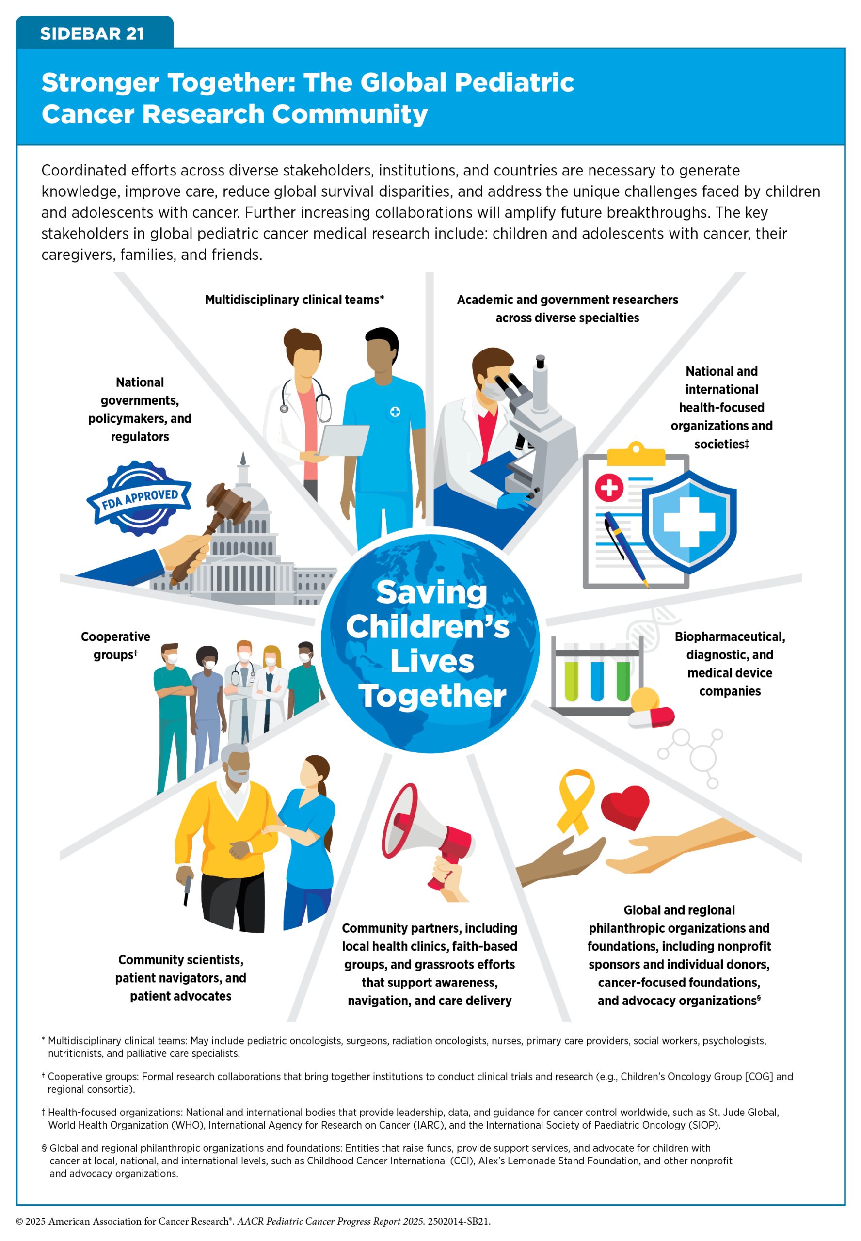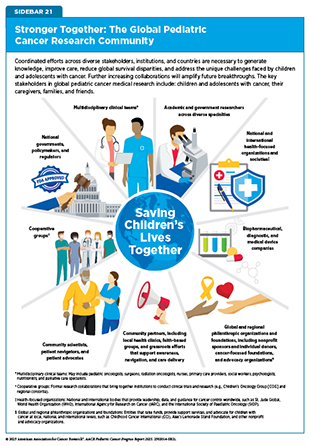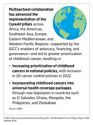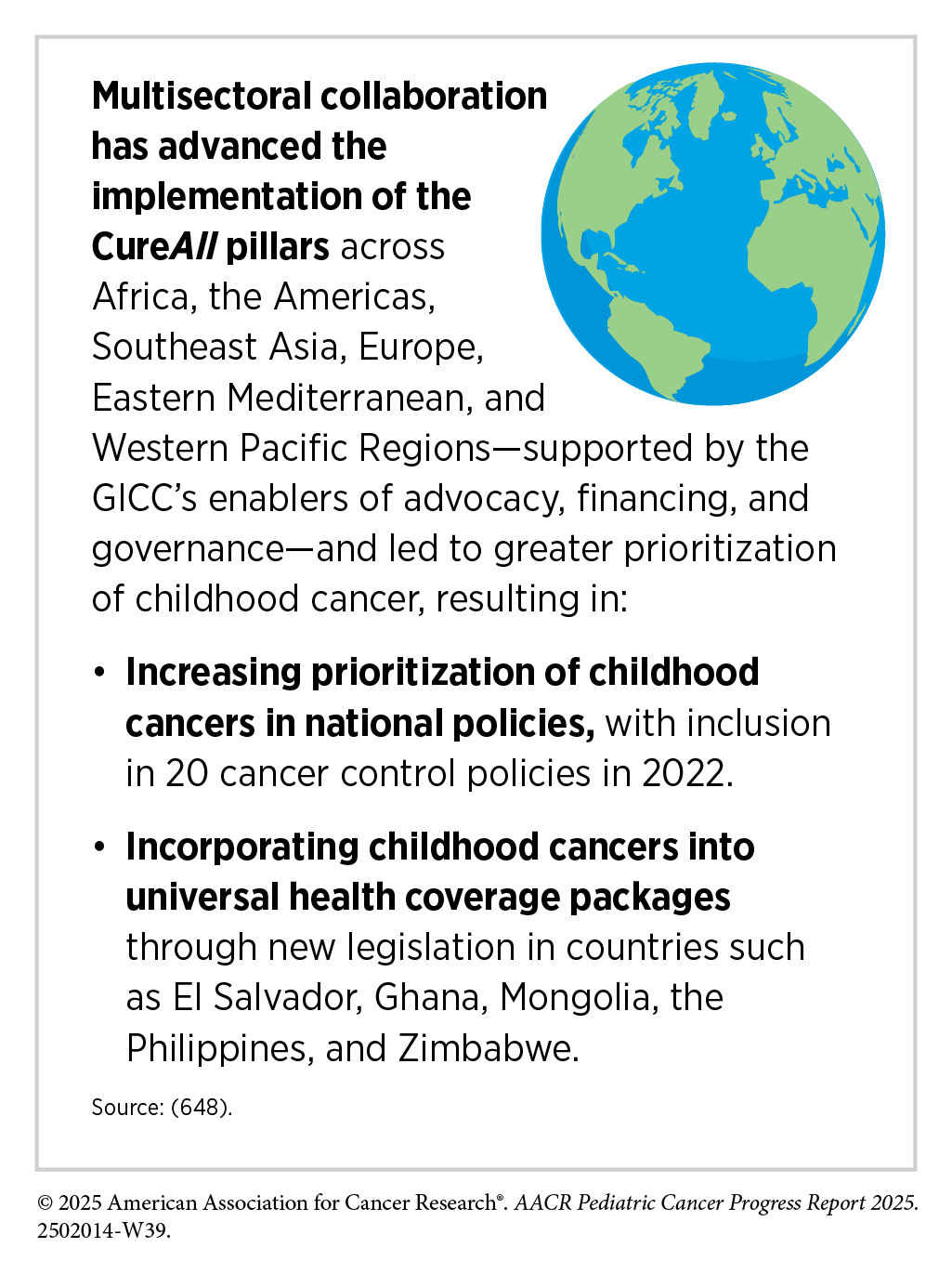 Improving childhood cancer outcomes worldwide, particularly in LICs and LMICs where survival gaps are the greatest, relies on the global pediatric cancer research community (see Sidebar 21) to join forces in expanding access, promoting equity, and strengthening health care systems to improve care. In 2018, WHO, in partnership with St. Jude Children’s Research Hospital (St. Jude), the International Society of Paediatric Oncology (SIOP), the patient advocacy and support organization Childhood Cancer International, and other global organizations, launched the Global Initiative for Childhood Cancer (GICC), with the goal of achieving at least 60 percent survival for children with cancer in all countries by 2030. The GICC works with governments to incorporate childhood cancer into broader cancer control and universal health coverage plans and to accelerate long-term policy and funding commitments. Since its launch, the initiative has engaged with over 80 countries, working to develop or strengthen national childhood cancer care strategies. Early efforts have focused on strengthening care systems for six cancers that together account for 50 percent to 60 percent of childhood cancers—ALL, Burkitt lymphoma, Wilms tumor, non-Hodgkin lymphoma, low-grade glioma, and RB (647)World Health Organization. WHO Global Initiative for Childhood Cancer on the path to bridging the Survival Gap and attaining Universal Health Coverage: a 5-Year.