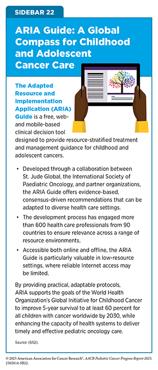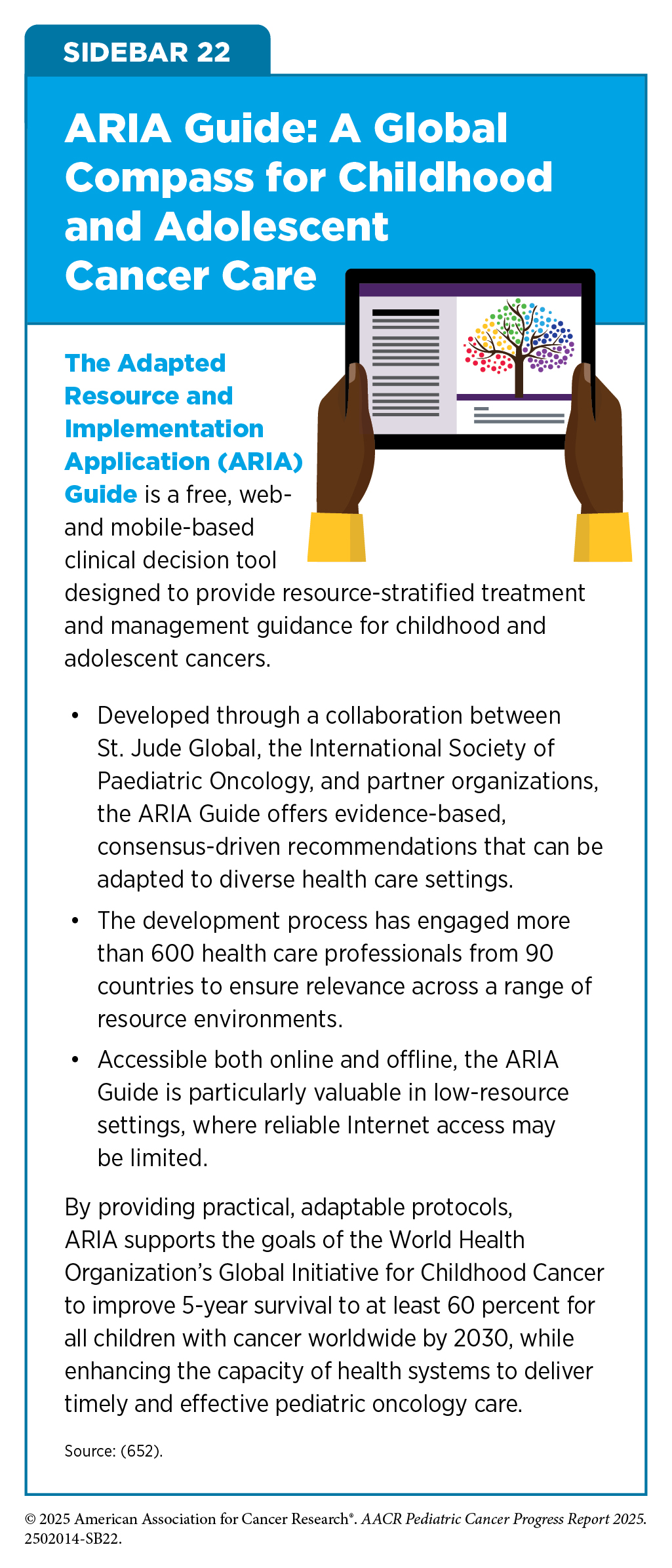 Developed through a partnership among St. Jude Global, SIOP, the International Society of Paediatric Surgical Oncology, the Paediatric Radiation Oncology Society, and other global organizations, the Adapted Resource and Implementation Application (ARIA) Guide provides consensus-driven, evidence-based treatment recommendations that can be adapted to local resource levels By offering context-specific guidance, ARIA empowers clinicians to deliver effective care despite systemic constraints (see Sidebar 22).