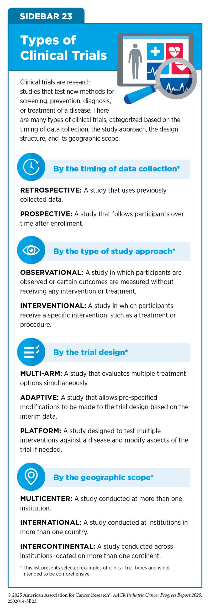 Clinical trials vary widely in their timing of data collection, study approach, design structure, and geographic scope—factors that influence where and how they are conducted (see Sidebar 23). A major milestone in streamlining regulations across regions came in December 2024 with the finalization of the International Council for Harmonization (ICH) E11A Pediatric Extrapolation Guideline (655)WIRB-Copernicus Group. The FDA Accepts ICH E11A on Pediatric Extrapolation: How Does This Impact Your Pediatric Study? Accessed: August 31, 2025.. This guidance builds on earlier frameworks by encouraging the use of existing data, whether from adult or pediatric populations, to inform study design for childhood cancers. By carefully applying lessons learned from one setting to another, regulators can reduce the need for unnecessary trials, focus research efforts where evidence gaps are greatest, and bring promising therapies to children with cancer quicker.