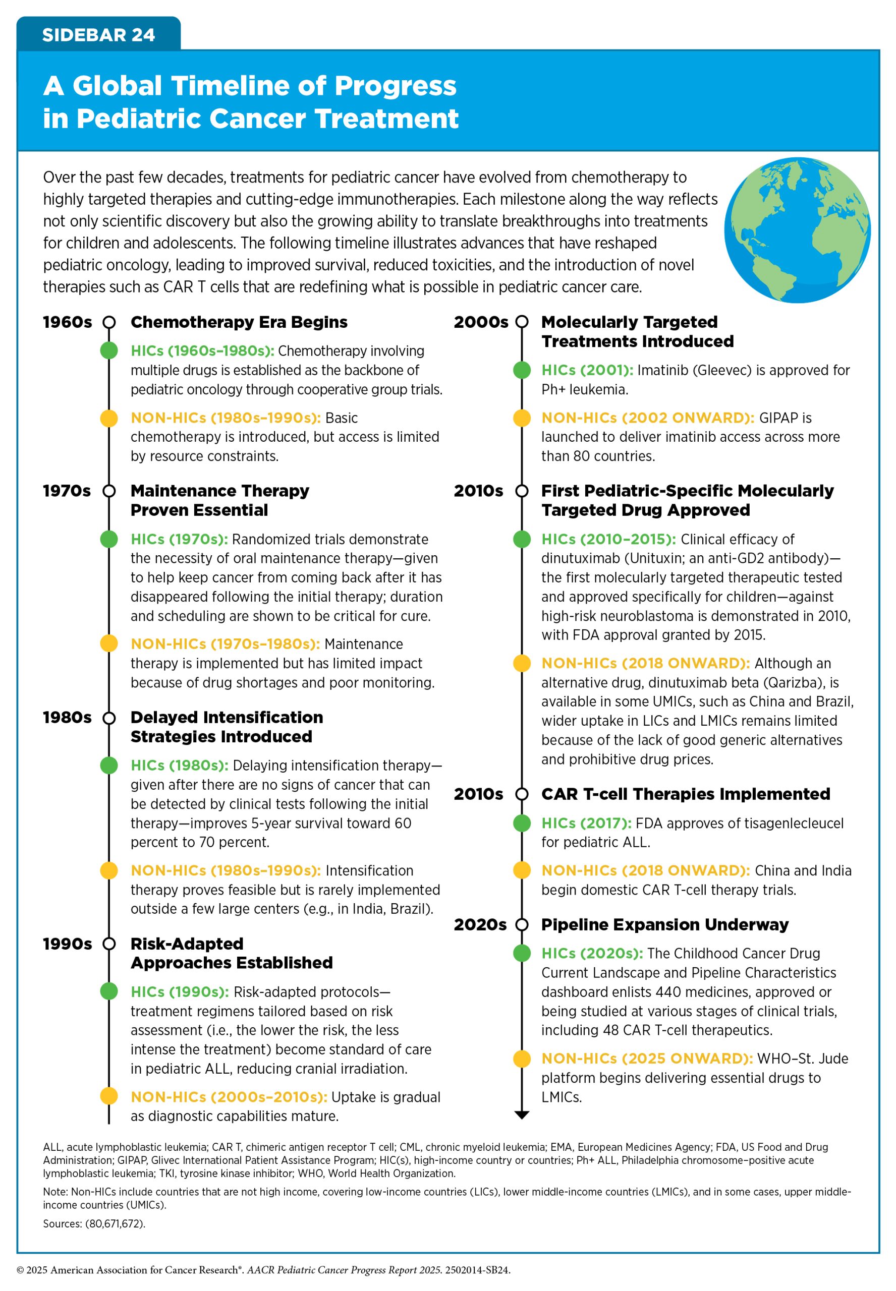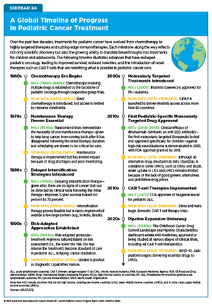 Childhood cancer treatment has advanced dramatically over the past few decades. Once nearly fatal diseases, childhood cancers are increasingly treatable, with an overall 5-year net survival rate of nearly 80 percent in HICs (see Pediatric Cancer Trends in the United States) (625)Ward ZJ, et al. (2019) Lancet Oncol, 20: 972.. Breakthroughs in childhood cancer treatment, once confined to HICs, are slowly making a tangible impact in countries that are not high-income or upper middle-income, although implementation and access remain substantially uneven within these countries as well as when compared to HICs (669)Gupta S, et al. Treating Childhood Cancer in Low- and Middle-Income Countries. In: Gelband H, Jha P, Sankaranarayanan R, Horton S, editors. Cancer: Disease Control Priorities, Third Edition (Volume 3). Washington (DC): The International Bank for Reconstruction and Development / The World Bank(670)Ehrlich BS, et al. (2023) Lancet Oncol, 24: 967.. Gains against childhood cancers in non-HICs thus far stem from cooperative clinical trials (see Access to Clinical Care: Disparities and Solutions), refinements in surgery and radiotherapy, safer chemotherapy regimens, and the systematic integration of supportive care that includes essential services, such as infection control, nutrition, and pain relief (see Sidebar 24).
