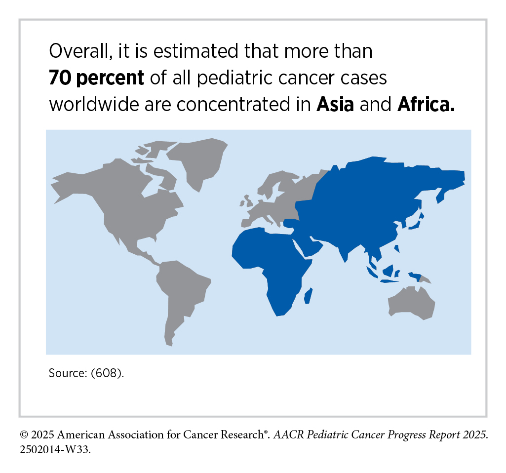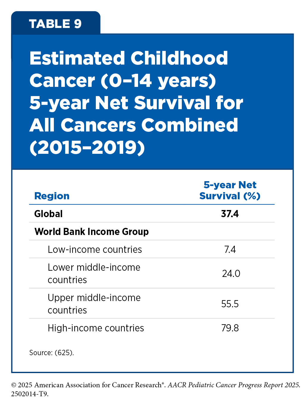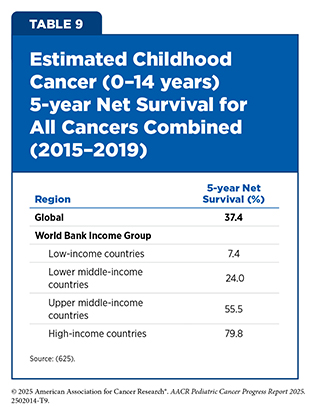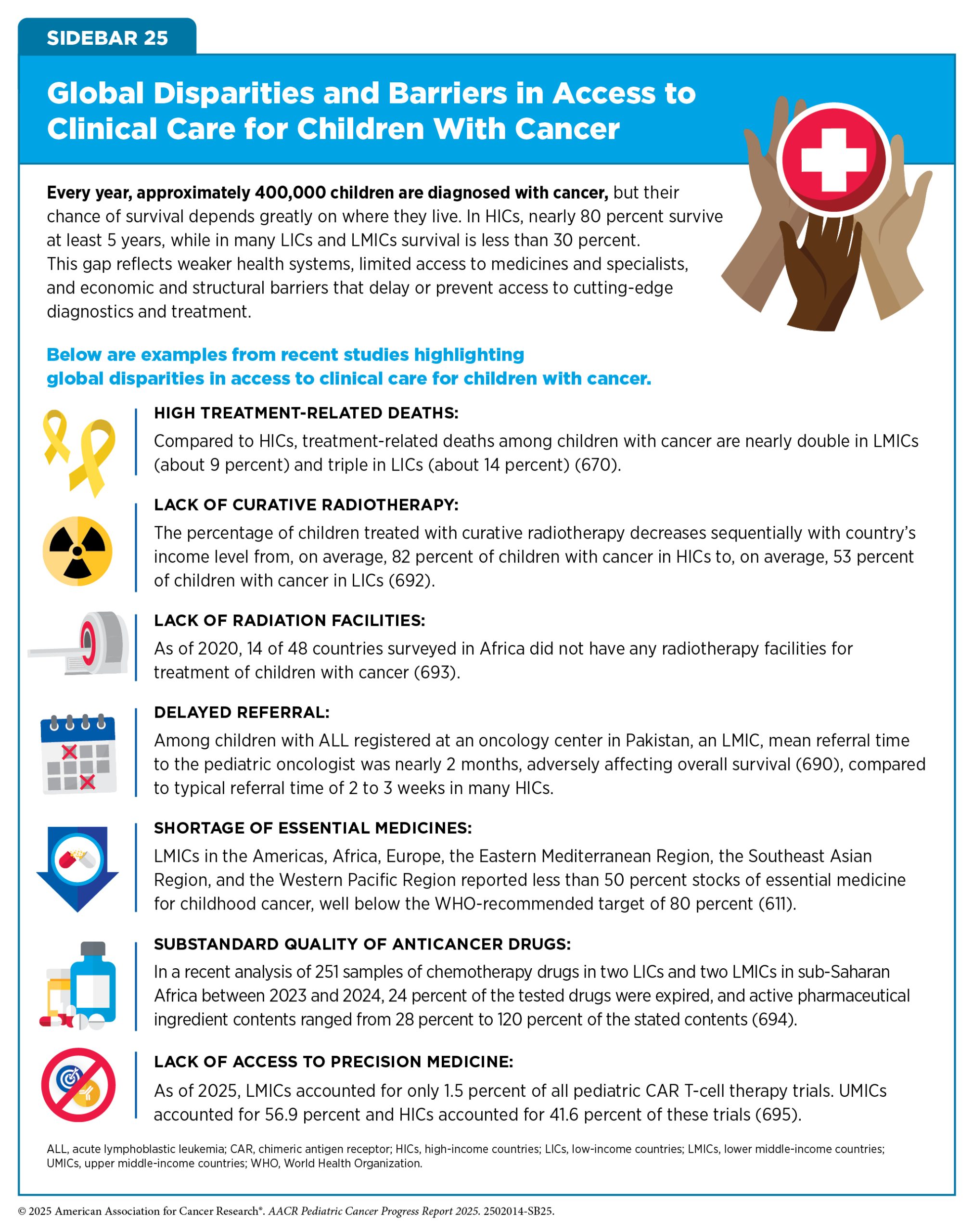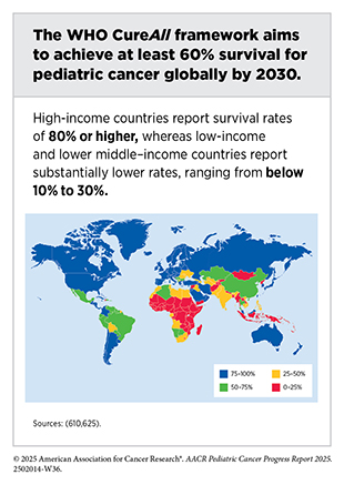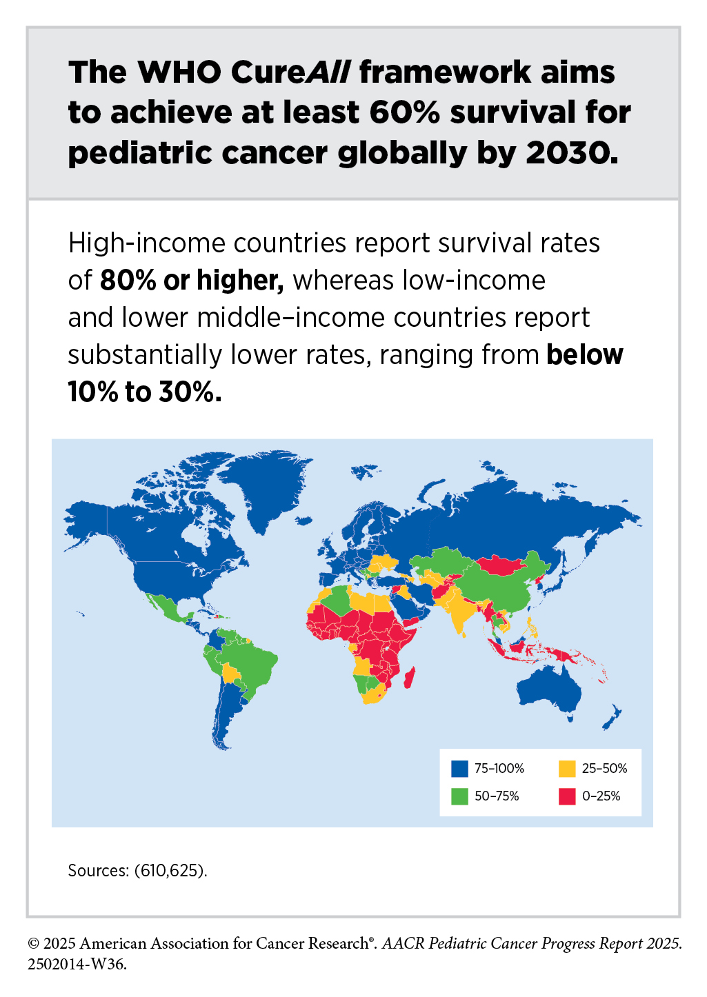 Global pediatric cancer patterns reveal substantial disparities in incidence and outcomes, largely influenced by differences in demographics, health care infrastructure, socioeconomic development, and timely access to diagnosis, treatment, and supportive care. For example, although treatment advances in the United States and other HICs have dramatically improved survival, these gains have not been realized uniformly around the globe. Although 5-year survival rates for pediatric cancers approach 80 percent in HICs, survival rates for these cancers in LICs and LMICs remain below 30 percent (610)World Health Organization. CureAll framework: WHO Global Initiative for Childhood Cancer. Increasing Access, Advancing quality, Saving lives. Accessed: August 31, 2025..