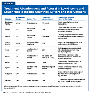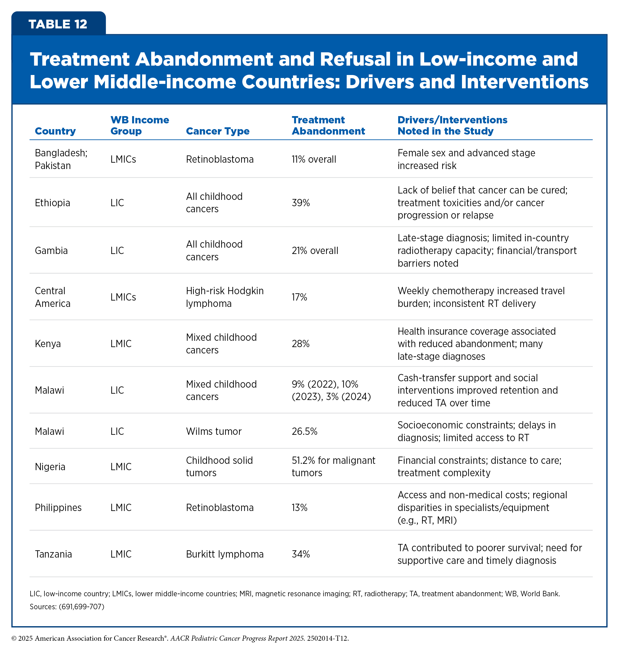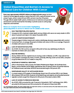 Over the past decade, advances in pediatric oncology have transformed survival for many children in HICs. At the same time, the gap between HICs and non-HICs in access to cutting-edge therapies has widened; the reasons for this disparity are multifactorial reasons and include the failure of advances made in HICs to reach countries that are not high income and the inequality of health systems and resources in non-HICs. Children in LMICs and LICs often face delayed diagnoses; shortages of trained specialists; limited access to chemotherapy, surgery, and radiation; and challenges such as malnutrition, treatment complications, and families abandoning care due to cost (see Global State of Pediatric Cancer Survivorship, Sidebar 25, and Table 12) (637)Lubega J, et al. (2021) Curr Opin Pediatr, 33: 33..
