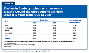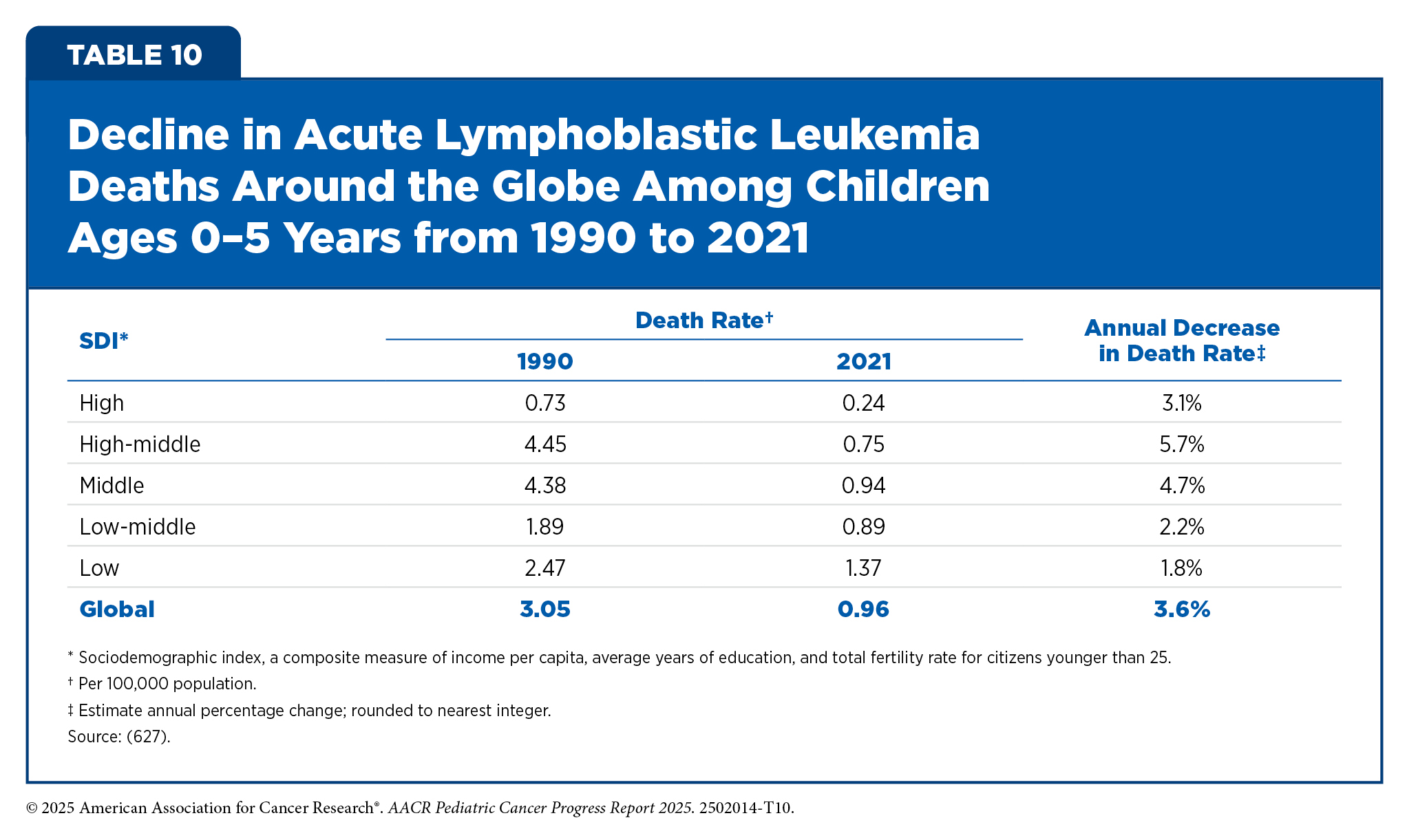 However, these improvements were concentrated in regions with a high- and high-middle sociodemographic index (SDI)—a composite measure of income per capita, average years of education, and total fertility rate for citizens younger than 25—where access to health care infrastructure and diagnostic capacity have advanced markedly (627)Ding F, et al. (2025) Front Pediatr, 13: 1542649.. In contrast, low-SDI regions continue to face substantial barriers, with increasing ALL death rates and DALYs between 1990 and 2021 (627)Ding F, et al. (2025) Front Pediatr, 13: 1542649.. High-SDI regions, such as East Asia, achieved the greatest reductions in mortality and DALYs, while low-SDI regions, including sub-Saharan Africa and the Caribbean, continue to experience disproportionately high burdens of pediatric ALL. These disparities highlight the urgent need to strengthen health care infrastructure and improve resource allocation to support earlier detection and effective treatment and survivorship care of ALL in lower-SDI regions (627)Ding F, et al. (2025) Front Pediatr, 13: 1542649..