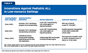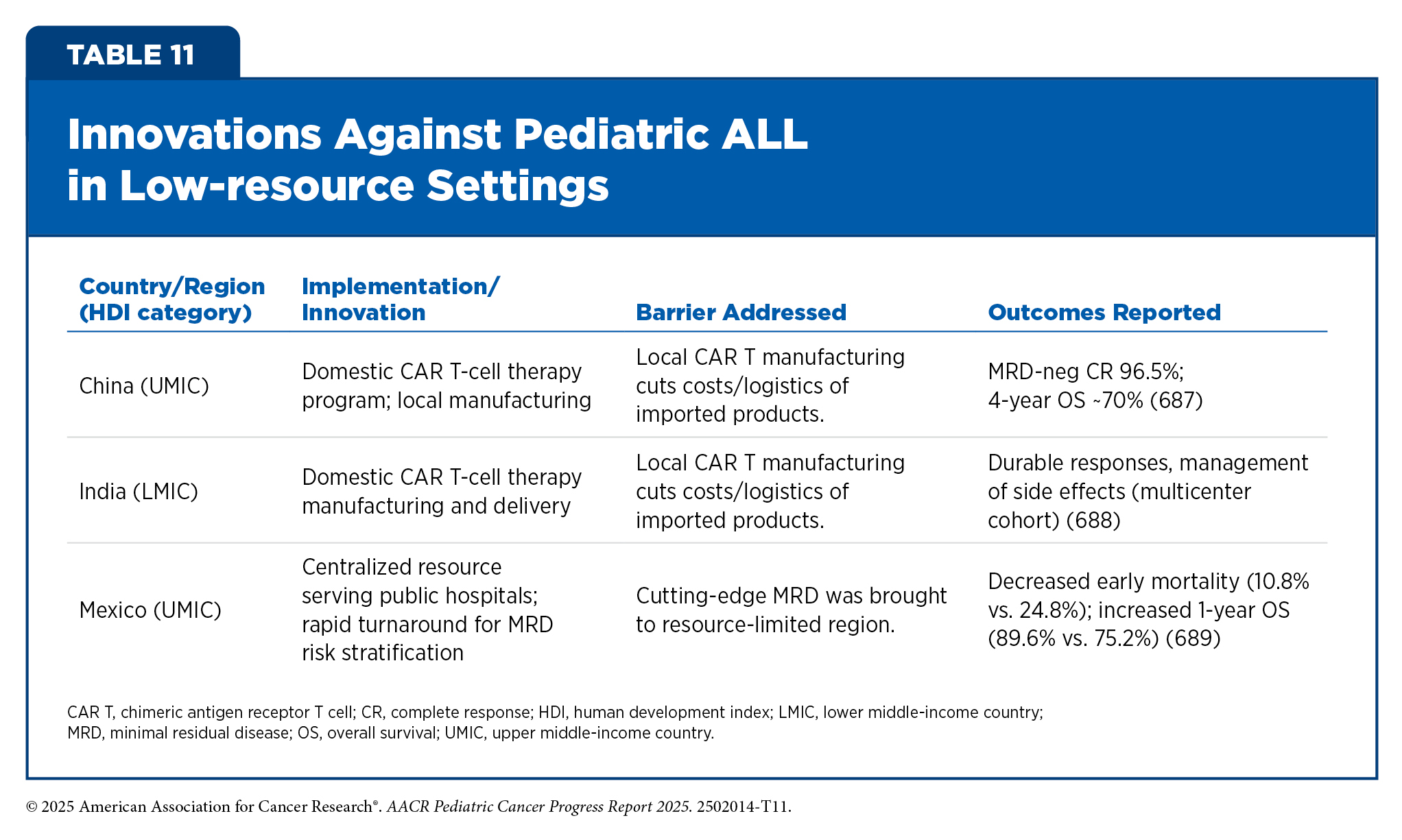 Researchers across the globe are continually working to implement regionally tailored strategies that are helping to further close the gaps in survival outcomes for pediatric ALL between HICs and LMICs (see Table 11). Despite challenges, pediatric ALL has become a model of progress against childhood cancers, with survival gains that are no longer confined to HIC nations but are increasingly, albeit unevenly, achievable across diverse settings (686)Duffy C, et al. (2024) Cancer, 130: 2247..