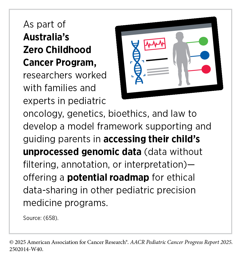 Data-sharing initiatives, such as the joint initiative between Innovative Therapies for Children with Cancer (ITCC) and Hopp Children’s Cancer Center (Hopp), are aiming to integrate pediatric precision medicine data across national programs. The ITCC Hopp initiative is working to create a platform for real-time federated archiving of data collected from international platforms for molecular tumor profiling around the globe, including Germany, France, the Netherlands, Denmark, Canada, Australia, and the UK.